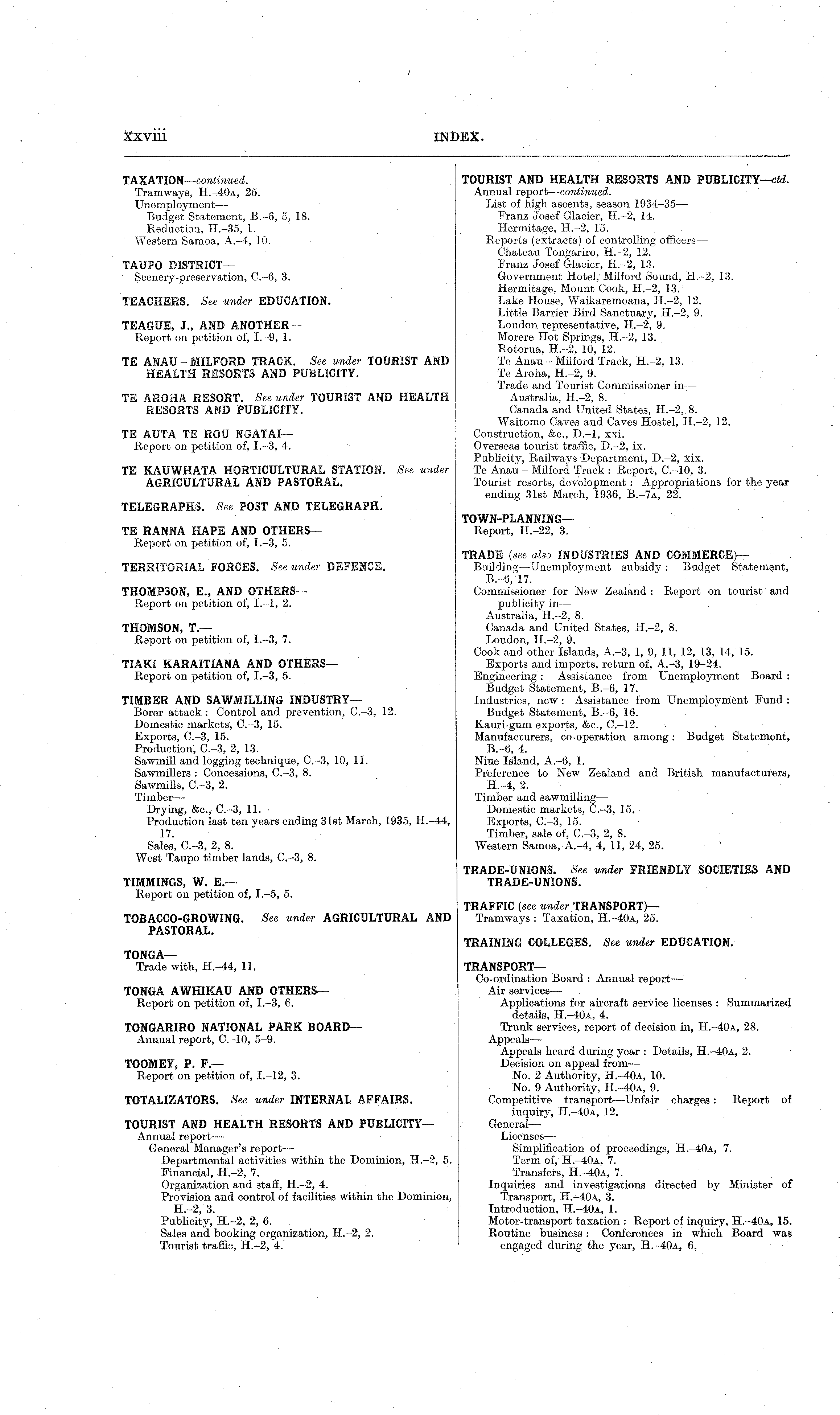 TAXATION—continued. Tramways, H.-40a, 25. Unemployment— Budget Statement, 8.-6, 5, 18. Reduction, H.-35, 1. Western Samoa, A.-4, 10. TAUPO DISTRICT— Scenery-preservation, C.-6, 3. TEACHERS. See under EDUCATION. TEAGUE, J., AND ANOTHER — Report on petition of, 1.-9, 1. TE ANAU - MILFORD TRACK. See under TOURIST AND HEALTH RESORTS AND PUBLICITY. TE AROHA RESORT. See under TOURIST AMD HEALTH RESORTS AND PUBLICITY. TE AUTA TE ROU NGATAI— Report on petition of, 1.-3, 4. TE KAUWHATA HORTICULTURAL STATION. See under AGRICULTURAL AND PASTORAL. TELEGRAPHS. See POST AND TELEGRAPH. TE RANNA HAPE AND OTHERS— Report on petition of, 1.-3, 5. TERRITORIAL FORCES. See under DEFENCE. THOMPSON, E., AND OTHERS — Report on petition of, 1.-l, 2. THOMSON, T. — Report on petition of, 1.-3, 7. TIAKI KARAITIANA AND OTHERS — Report on petition of, 1.-3, 5. TIMBER AND SAWMILLING INDUSTRY — Borer attack : Control and prevention, C.-3, 12. Domestic markets, C.-3, 15. Exports, C.-3, 15. Production, C.-3, 2, 13. Sawmill and logging technique, C.-3, 10, 11. Sawmillers : Concessions, C.-3, 8. Sawmills, C.-3, 2. Timber— Drying, &c., C.-3, 11. Production last ten years ending 31st March, 1935, H.-44, 17. Sales, C.-3, 2, 8. West Taupo timber lands, C.-3, 8. TIMMINGS, W. E— Report on petition of, 1.-5, 5. TOBACCO-GROWING. See under AGRICULTURAL AND PASTORAL. TONGA— Trade with, H.-44, 11. TONGA AWHIKAU AND OTHERS— Report on petition of, 1.-3, 6. TONGARIRO NATIONAL PARK BOARD— Annual report, C.-10, 5-9. TOOMEY, P. F. — Report on petition of, 1.-12, 3. TOTALIZATORS. See under INTERNAL AFFAIRS. TOURIST AND HEALTH RESORTS AND PUBLICITY— Annual report — General Manager's report — Departmental activities within the Dominion, H.-2, 5. Financial, H.-2, 7. Organization and staff, H.-2, 4. Provision and control of facilities within the Dominion, H.-2, 3. Publicity, H.-2, 2, 6. Sales and booking organization, H.-2, 2. Tourist traffic, H.-2, 4.
