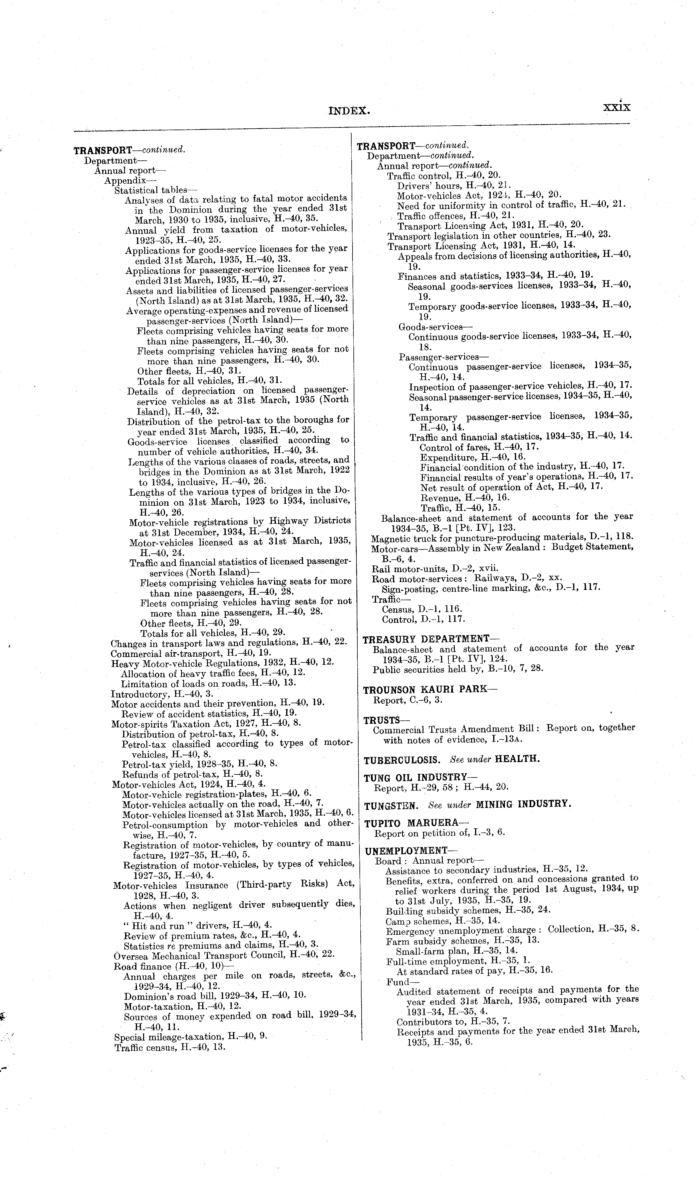 TRANSPORT —continued. Department —continued. Annual report —continued. Traffic control, H.-40, 20. Drivers' hours, H.-40, 21. Motor-vehicles Act, 1921, H.-40, 20. Need for uniformity in control of traffic, H . -40, 21. Traffic offences, H.-40, 21. Transport Licensing Act, 1931, H.-40, 20. Transport legislation in other countries, 11. -40, 23. Transport Licensing Act, 1931, H.-40, 14. Appeals from decisions of licensing authorities, H.-40, 19. Finances and statistics, 1933-34, H.-40, 19. Seasonal goods-services licenses, 1933-34, H.-40, 19. Temporary goods-service licenses, 1933-34, H.-40, 19. Goods-services — Continuous goods-service licenses, 1933-34, H.-40, 18. Passenger-services — Continuous passenger-service licenses, 1934-35, H.-40, 14. Inspection of passenger-service vehicles, H.-40, 17. Seasonal passenger-service licenses, 1934-35, H.-40, 14. Temporary passenger-service licenses, 1934-35, H.-40, 14. Traffic and financial statistics, 1934-35, H.-40, 14. Control of fares, H.-40, 17. Expenditure, H.-40, 16. Financial condition of the industry, H.-40, Financial results of year's operations, H.-40, 17. Net result of operation of Act, H.-40, 17. Revenue, H.-40, 16. Traffic, 15. Balance-sheet and statement of accounts for the year 1934-35, 8.-l [Pt. IV], 123. Magnetic truck for puncture-producing materials, D.-l, 118. Motor-cars—Assembly in New Zealand : Budget Statement, 8.-6, 4. Rail motor-units, D.-2, xvii. Road motor-services : Railways, D.-2, xx. Sign-posting, centre-line marking, &c., D.-l, 117. TrafficCensus, D.-l, 116. Control, D.-l, 117. TREASURY DEPARTMENT— Balance-sheet and statement of accounts for the year 1934-35, 8.-l [Pt. IV], 124. Public securities held by, 8.-10, 7, 28. TROUNSQN KAURI PARK— Report, C.-6, 3. TRUSTS— Commercial Trusts Amendment Bill: Report on, together with notes of evidence, 1.-13 a. TUBERCULOSIS. See under HEALTH. TUNG OIL INDUSTRY— Report, H.-29, 58 ; H.-44, 20. TUNGSTEN. See under MINING INDUSTRY. - TUPITO MARUERA — Report on petition of, 1.-3, 6. UNEMPLOYMENT— Board : Annual report — Assistance to secondary industries, H.—35, 12. Benefits, extra, conferred on and concessions granted to relief workers during the period Ist August, 1934, up i, to 31st July, 1935, H.-35, 19. Building subsidy schemes, H.-35, 24. Camp schemes, H.-35, 14. Emergency unemployment charge : Collection, H.-35, 8. Farm subsidy schemes, H.-35, 13. Small-farm plan, H.-35, 14. Full-time employment, H.-35, 1. At standard rates of pay, H.-35, 16. Fund — Audited statement of receipts and payments for the year ended 31st March, 1935, compared with years 1, 1931-34, H.-35, 4. Contributors to, H.-35, 7. Receipts and payments for the year ended 31st March, 1935, H.-35, 6.