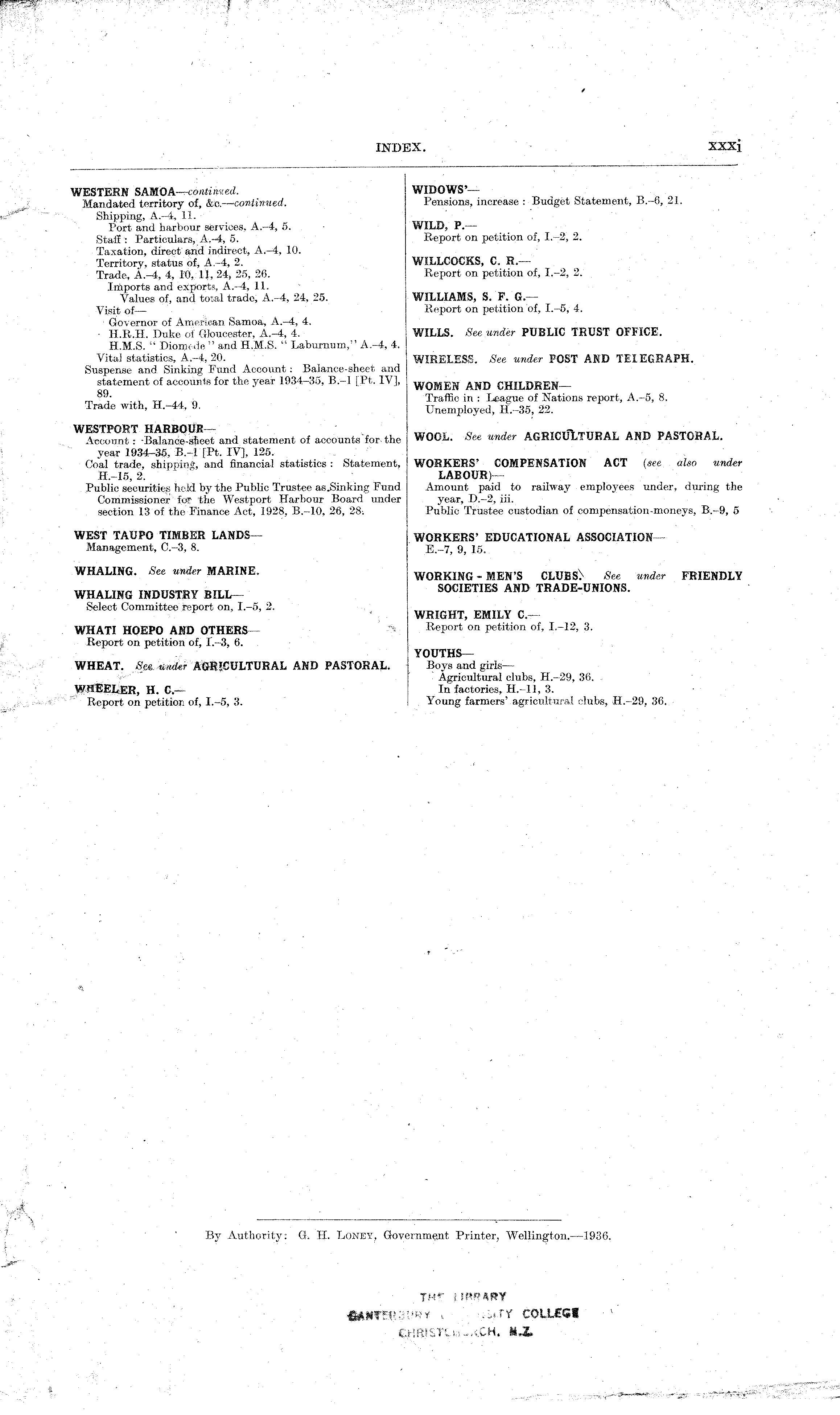 WIDOWS' — Pensions, increase : Budget Statement, 8.-6, 21. WILD, P. — Report on petition of, 1.-2, 2. WILLCOCKS, C. R. Report on petition of, 1.-2, 2. WILLIAMS, S. F. G.— Report on petition of, 1.-5, 4. WILLS. See under PUBLIC TRUST OFFICE. WIRELESS, See under FOST AND TEIEGRAPH. WOMEN AND CHILDREN — Traffic in : League of Nations report, A.-5, 8. Unemployed, H.-35, 22. WOOL. See under AGRICULTURAL AND PASTORAL. WORKERS' COMPENSATION ACT (see also under LABOUR) — Amount paid to railway employees under, during the year, D.-2, iii. Public Trustee custodian of compensation-moneys, 8.-9, 5 WORKERS' EDUCATIONAL ASSOCIATION E.-7, 9, IS. WORKING - MEN'S CLUBS> See under FRIENDLY SOCIETIES AND TRADE-UNIONS. WRIGHT, EMILY C. Report on petition of, 1.-12, 3. YOUTHS— Boys and girls— Agricultural clubs, H.-29, 30. In factories, H.-11, 3. Young farmers' agricultural clubs, H.-29, 36.