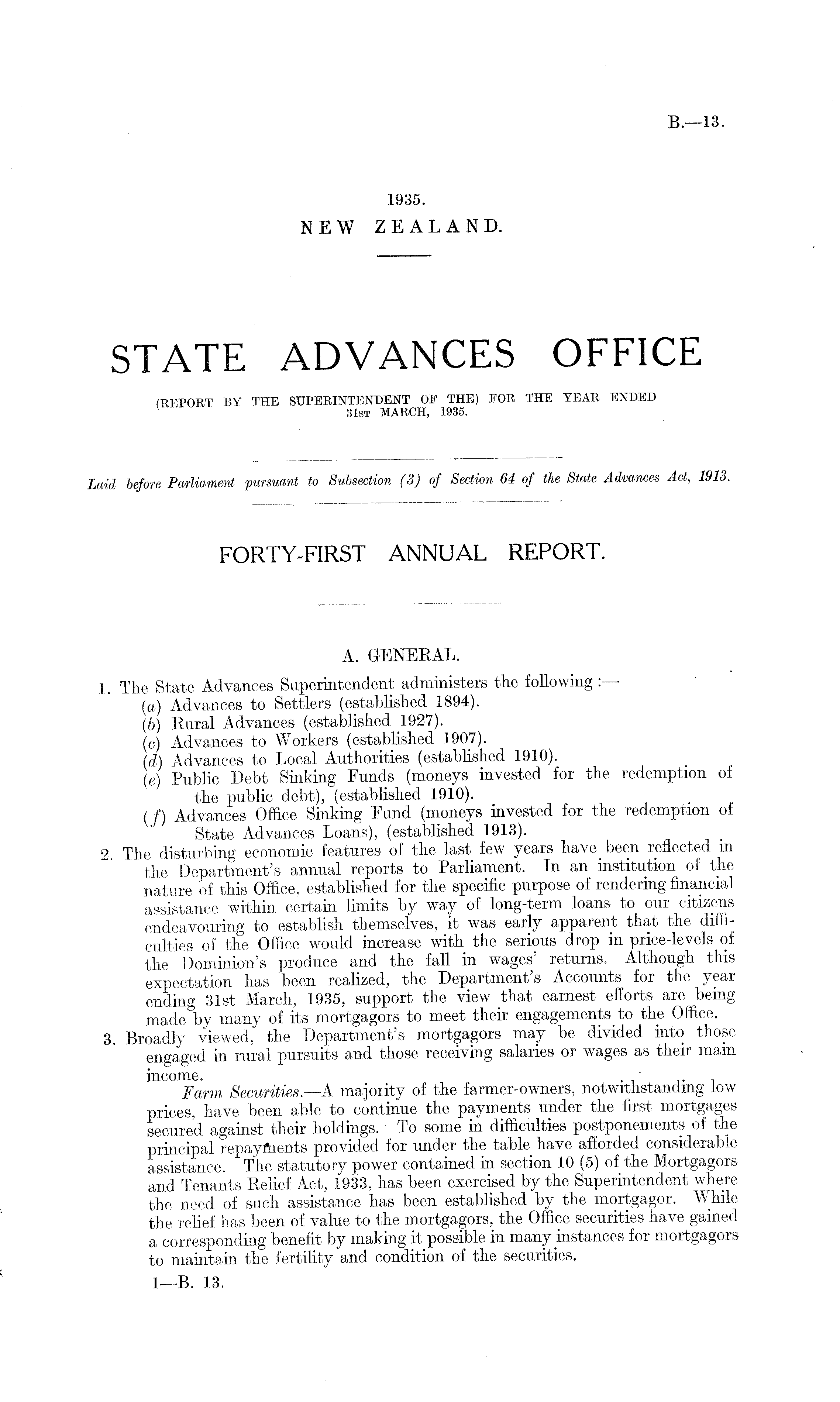A. GENERAL. 1. The State Advances Superintendent administers the following :— (a) Advances to Settlers (established 1894). (b) Rural Advances (established 1927). (c) Advances to Workers (established 1907). id) Advances to Local Authorities (established 1910). (e) Public Debt Sinking Funds (moneys invested for the redemption of the public debt), (established 1910). (/) Advances Office Sinking Fund (moneys invested for the redemption of State Advances Loans), (established 1913). 2 The disturbing economic features of the last few years have been reflected m the Department's annual reports to Parliament. In an institution of the nature of this Office, established for the specific purpose of rendering financial assistance within certain limits by way of long-term loans to our citizens endeavouring to establish themselves, it was early apparent that the difficulties of the Office would increase with the serious drop in price-levels of the Dominion's produce and the fall in wages' returns. Although this expectation has been realized, the Department's Accounts for the year ending 31st March, 1935, support the view that earnest efforts are being made by many of its mortgagors to meet their engagements to the Office. 3. Broadly viewed, the Department's mortgagors may be divided into those engaged in rural pursuits and those receiving salaries or wages as their main income. " Farm Securities .—A majority of the farmer-owners, notwithstanding low prices, have been able to continue the payments under the first mortgages secured against their holdings. To some in difficulties postponements of the principal repayftients provided for under the table have afforded considerable assistance. The statutory power contained in section 10 (5) of the Mortgagors and Tenants Relief Act, 1933, has been exercised by the Superintendent where the need of such assistance has been established by the mortgagor. While the relief has been of value to the mortgagors, the Office securities have gained a corresponding benefit by making it possible in many instances for mortgagors to maintain the fertility and condition of the securities.