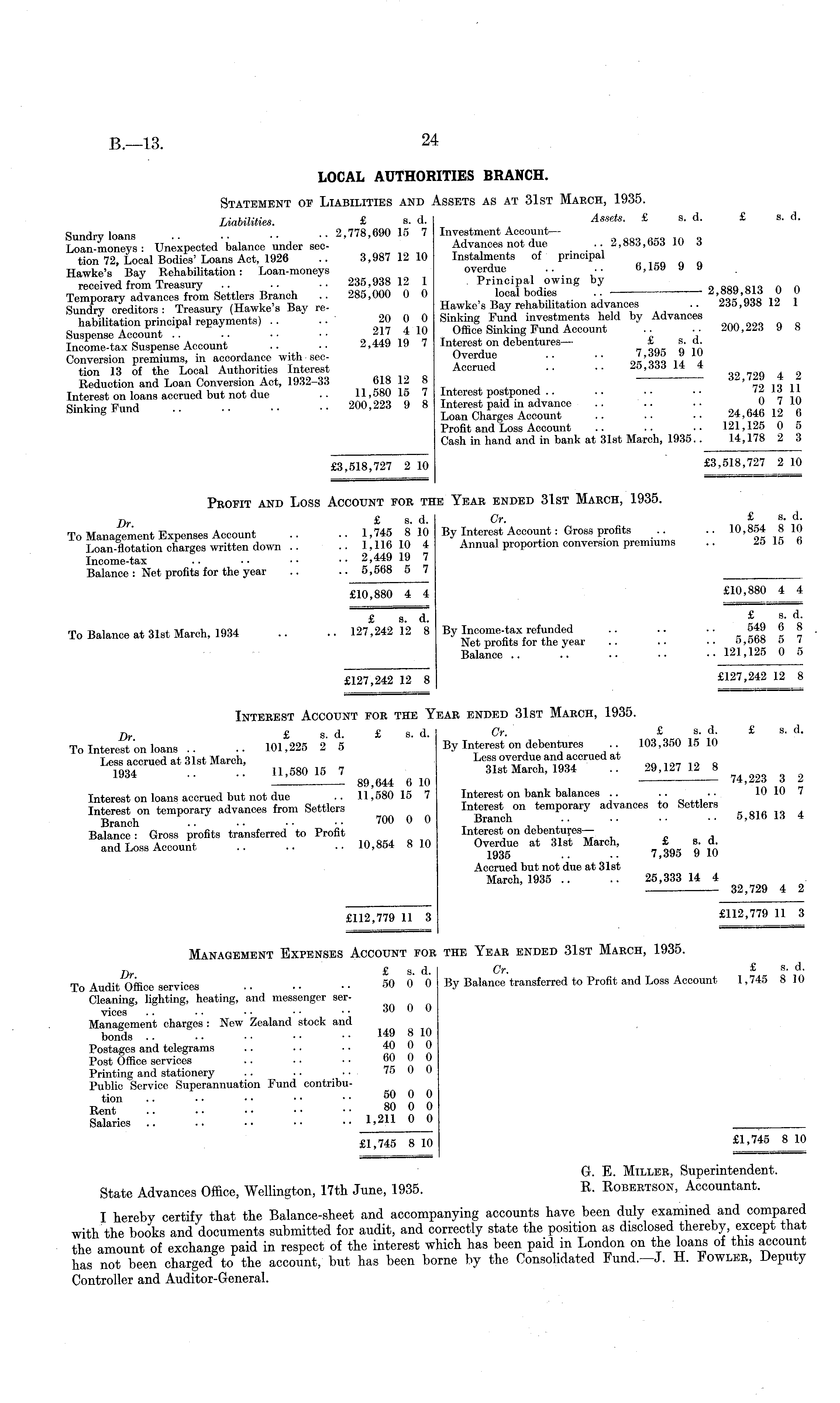LOCAL AUTHORITIES BRANCH. Statement of Liabilities and Assets as at 31st March, 1935. Liabilities. £ a. d. Assets. £ s. d. £ s. d. Sundry loans .. •• •• 2,778,690 15 7 Investment Account— Loan-moneys: Unexpected' balance under sec- Advances not due 2,883,653 10 3 tion 72, Local Bodies' Loans Act, 1926 .. 3,987 12 10 Instalments of principal Hawke's Bay Eehabilitation: Loan-moneys overdue .. .. b,lt>y y » received from Treasury 235,938 12 1 Principal owing by Temporary advances from Settlers Branch .. 285,000 0 0 local bodies .. — 2,889,813 0 0 Sundry creditors : Treasury (Hawke's Bay re- Hawke's Bay rehabilitation advances .. 235,938 12 1 habitation principal repayments) •• ■• 20 0 0 Sinking Fund investments held by Advances Suspense Account . 217 410 Office Smkmg Fund Account .. .. 200,223 9 8 Income-tax Suspense Account .. .. 2,449 19 7 Interest on debentures- £ s. d. Conversion premiums, in accordance with see- Overdue .. •• -» b '« tion 13 of the Local Authorities Interest Accrued .. .. 4 Reduction and Loan Conversion Act, 1932-33 618 12 8 '79 if if Interest on loans accrued but not due .. 11,580 15 7 Interest postponed n7 in Sinking Fund 200,223 9 8 Interest paid in advance 24 646 12 6 Loan Charges Account .. .. •• <24,b4b 1 1 b Profit and Loss Account .. .. . • 121,125 0 5 Cash in hand and in bank at 31st March, 1935.. 14,178 2 3 £3,518,727 2 10 £3,518,727 2 10 Peofit and Loss Account foe the Yeae ended 31st Maech, 1935. Dr £ s. d. Cr. £ s - d - To Management Expenses Account .. .. 1,745 810 By Interest Account: Gross profits .. .. 10,854 810 Loan-flotation charges written down .. .. 1,116 10 4 Annual proportion conversion premiums .. 25 15 6 Income-tax 2,449 19 7 Balance: Net profits for the year .. .. 5,568 5 7 £10,880 4 4 £10.880 4 4 £ s. d. s - dTo Balance at 31st March, 1934 .. .. 127,242 12 8 By Income-tax refunded 549 6 8 Net profits for the year .. .. •• 5,5b8 5 7 Balance 121,125 0 5 £127,242 12 8 £127,242 12 8 Interest Account for the Yeae ended 31st March, 1935. Dr £ s. d. £ s. d. Or. £ s. d. £ s. d. To Interest on loans .. .. 101,225 2 5 By Interest on debentures .. 103,350 15 10 Less accrued at 31st March, Less overdue and accrued at 1934 .. •• 11,580 15 7 31st March, 1934 .. 29,127 12 8 89,644 6 10 — 74,223 3 2 Interest on loans accrued but not due .. 11,580 15 7 Interest on bank balances .. :•■-■„," Interest on temporary advances from Settlers Interest on temporary advances to Settlers Branch 700 0 0 Branch 5,816 13 4 Balance: Gross profits transferred to Profit Interest on debentures— and Toss Account . ■• 10,854 810 Overdue at 31st March, £ s. d. and Loss Account .. . 1935 73g5 Q 10 Accrued but not due at 31st March, 1935 .. .. 25,333 14 4 32,729 4 2 £112,779 11 3 £112,779 11 3 Management Expenses Account for the Year ended 31st Maech, 1935. 7) £ s. d. Cr. £ s - d - To Audit Office services .. •• 50 06 By Balance transferred to Profit and Loss Account 1,745 810 Cleaning, lighting, heating, and messenger services .. •• • • • ■ • • 30 0 0 Management charges : New Zealand stock and bonds 149 8 10 Postages and telegrams .. • • ■ • 40 0 0 Post Office services .. ■ • • ■ 60 0 0 Printing and stationery .. . ■ •• . 75 0 0 Public Service Superannuation Fund contribution 50 0 0 Tfont . . • ■ 80 0 0 Maries V. '.. L™ 0 ° £1;745 8 10 BJIO G. E. Miller, Superintendent. State Advances Office, Wellington, 17th June, 1935. B. Eobeetson, Accountant. I hereby certify that the Balance-sheet and accompanying accounts have been duly examined and compared with the books and documents submitted for audit, and correctly state the position as disclosed thereby, except that the amount of exchange paid in respect of the interest which has been paid in London on the loans of this account has not been charged to the account, but has been borne by the Consolidated Fund.— J. H. Fowlee, Deputy Controller and Auditor-General.