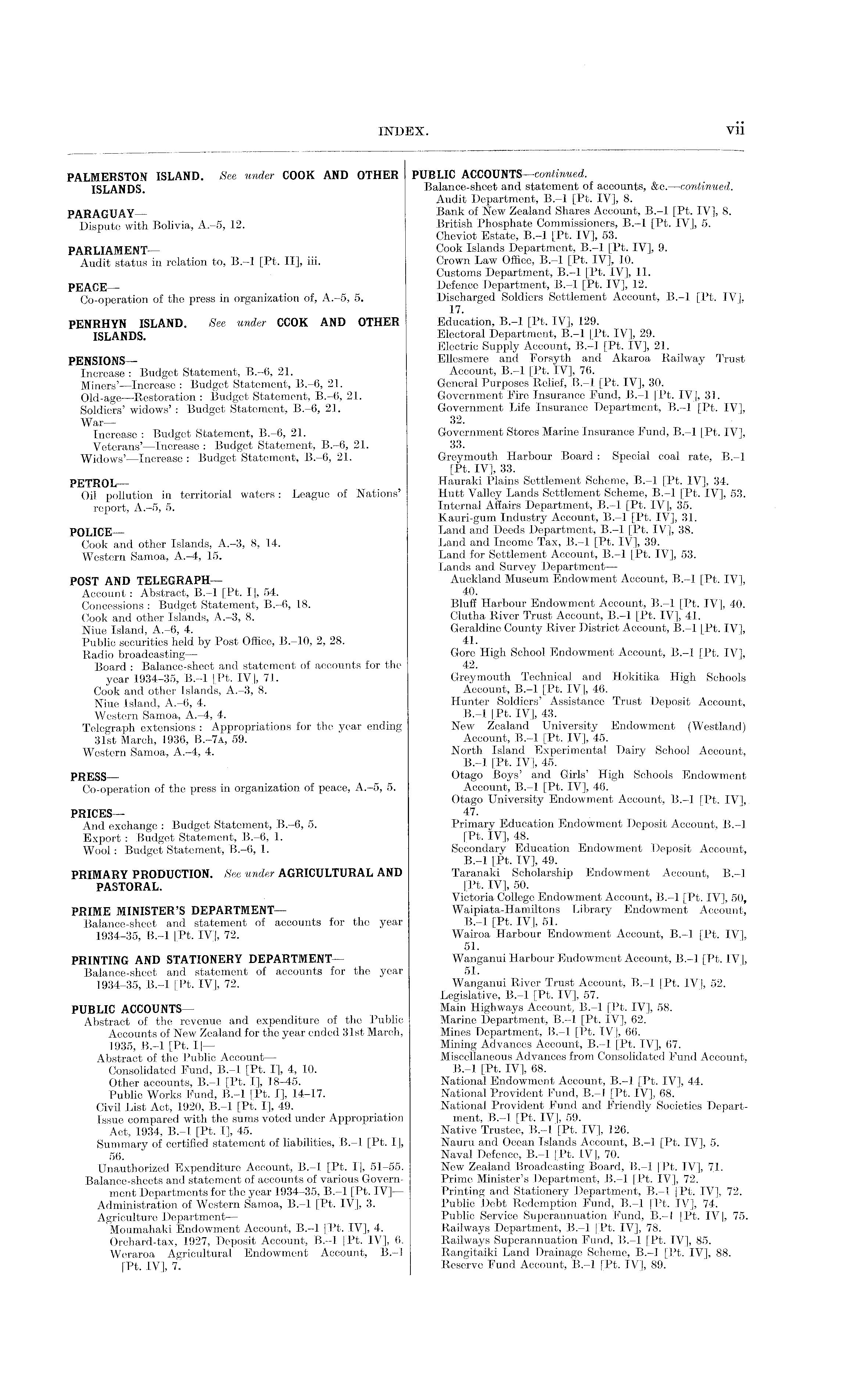 PALMERSTON ISLAND. See under COOK AND OTHER ISLANDS. PARAGUAY— Dispute with Bolivia, A.-5, 12. PARLIAMENT— Audit status in relation to, 8.-l [Pt. ll], iii. PEACE— Co-operation of the press in organization of, A.-5, 5. PENRHYN ISLAND. See under CCOK AND OTHER ISLANDS. PENSIONS— Increase : Budget Statement, 8.-6, 21. Miners' —Increase : Budget Statement, 8.-6, 21. Old-age—Restoration : Budget Statement, 8.-6, 21. Soldiers' widows' : Budget Statement, 8.-6, 21. WarIncrease : Budget Statement, 8.-6, 21. Veterans' —Increase : Budget Statement, 8.-6, 21. Widows' —Increase : Budget Statement, 8.-6, 21. PETROL— Oil pollution in territorial waters: League of Nations' report, A.-5, 5. POLICE— Cook and other Islands, A.-3, 8, 14. Western Samoa, A.-4, 15. POST AND TELEGRAPH— Account: Abstract, 8.-l [Pt. I], 54. Concessions : Budget Statement, 8.-6, 18. Cook and other Islands, A.-3, 8. Niue Island, A.-6, 4. Public securities held by Post Office, 8.-10, 2, 28. Radio broadcasting— Board : Balance-sheet and statement of accounts for the year 1934—35, 8.-l [Pt. IV], 71. Cook and other Islands, A.-3, 8. Niue Island, A.-6, 4. Western Samoa, A.-4, 4. Telegraph extensions : Appropriations for the year ending 31st March, 1936, 8.-7 a, 59. Western Samoa, A.-4, 4. PRESS— Co-operation of the press in organization of peace, A.-5, 5. PRICES— And exchange : Budget Statement, 8.-6, 5. Export : Budget Statement, 8.-6, 1. Wool: Budget Statement, 8.-6, 1. PRIMARY PRODUCTION. See under AGRICULTURAL AND PASTORAL. PRIME MINISTER'S DEPARTMENT— Balance-sheet and statement of accounts for the year 1934-35, 8.-l [Pt. IV], 72. PRINTING AND STATIONERY DEPARTMENT— Balance-sheet and statement of accounts for the year 1934-35, 8.-l [Pt. IV], 72. PUBLIC ACCOUNTS— Abstract of the revenue and expenditure of the Public Accounts of New Zealand for the year ended 31st March, 1935, 8.-l [Pt. I]— Abstract of the Public Account — Consolidated Fund, 8.-l [Pt. I], 4, 10. Other accounts, 8.-l [Pt. I], 18-45. Public Works Fund, 8.-l [Pt. I], 14-17. Civil List Act, 1920, 8.-l [Pt. I], 49. Issue compared with the sums voted under Appropriation Act, 1934, 8.-l [Pt. I], 45. Summary of certified statement of liabilities, 8.-l [Pt. I], 56. Unauthorized Expenditure Account, 8.-l [Pt. I], 51-55. Balance-sheets and statement of accounts of various Government Departments for the year 1934-35, 8.-l [Pt. IV] — Administration of Western Samoa, 8.-l [Pt. IV], 3. Agriculture Department — Moumahaki Endowment Account, 8.-l [Pt. IV], 4. Orchard-tax, 1927, Deposit Account, 8.-l [Pt. IV], 6. Weraroa Agricultural Endowment Account, 8.-l [Pt. IV], 7.