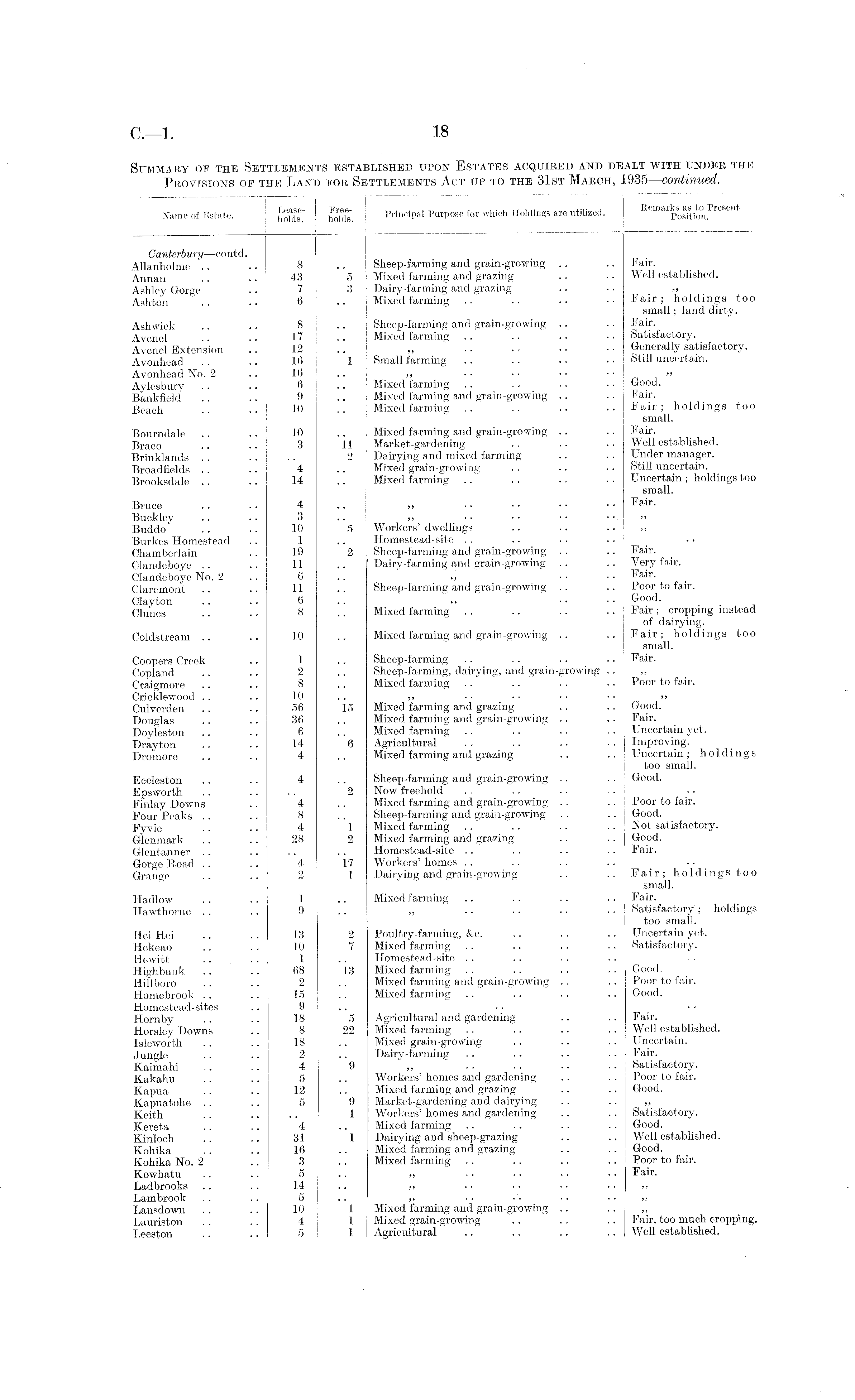 Summary of the Settlements established upon Estates acquired and dealt with under the Provisions of the Land for Settlements Act up to the 31st March, 1935—continued.