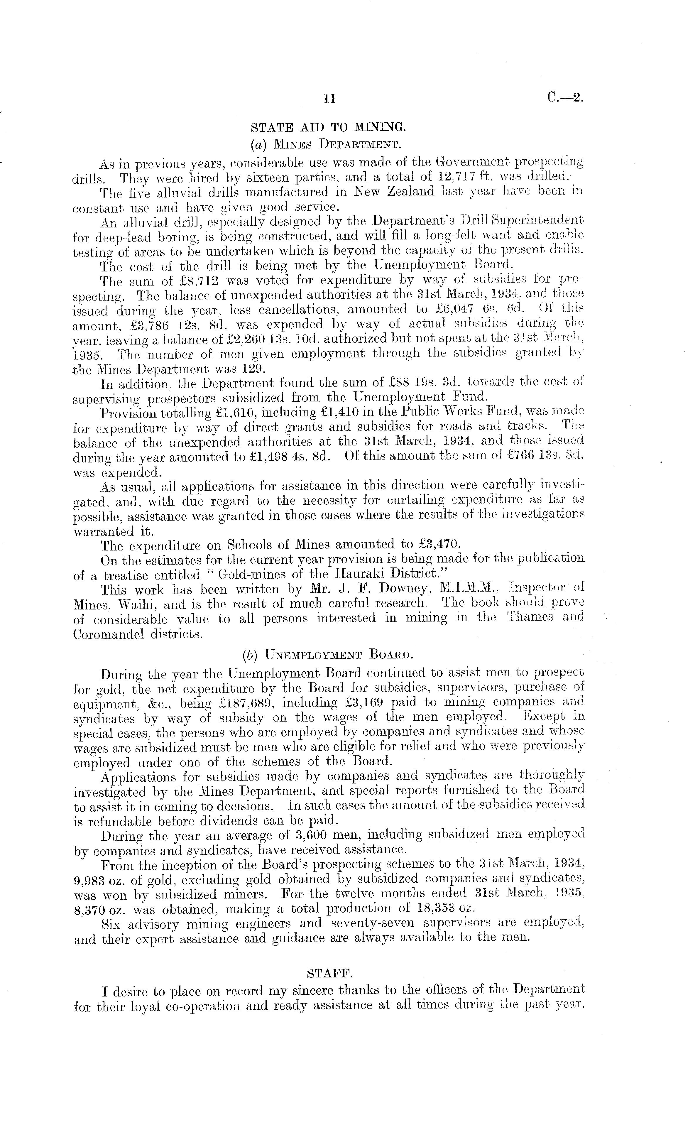 STATE AID TO MINING. (a) Mines Department. As in previous years, considerable use was made of the Government prospecting drills. They were hired by sixteen parties, and a total of 12,717 ft. was drilled. The five alluvial drills manufactured in New Zealand last year have been in constant use and have given good service. An alluvial drill, especially designed by the .Department's Drill Superintendent for deep-lead boring, is being constructed, and will fill a long-felt want and enable testing of areas to be undertaken which is beyond the capacity of the present drills. The cost of the drill is being met by the Unemployment Board. The sum of £8,712 was voted for expenditure by way of subsidies for prospecting. The balance of unexpended authorities at the 31st March, 1934, and those issued during the year, less cancellations, amounted to £6,047 6s. 6d. Of this amount, £3,786 12s. Bd. was expended by way of actual subsidies during the year, leaving a balance of £2,260 13s. lOd. authorized but not spent at the 31st March, 1935. The number of men given employment through the subsidies granted by the Mines Department was 129. In addition, the Department found the sum of £88 19s. 3d. towards the cost of supervising prospectors subsidized from the Unemployment Fund. Provision totalling £1,610, including £1,410 in the Public Works Fund, was made for expenditure by way of direct grants and subsidies for roads and tracks. The balance of the unexpended authorities at the 31st March, 1934, and those issued during the year amounted to £1,498 4s. Bd. Of this amount the sum of £766 13s. Bd. was expended. As usual, all applications for assistance in this direction were carefully investigated, and, with due regard to the necessity for curtailing expenditure as far as possible, assistance was granted in those cases where the results of the investigations warranted it. The expenditure on Schools of Mines amounted to £3,470. On the estimates for the current year provision is being made for the publication of a treatise entitled " Gold-mines of the Hauraki District." This work has been written by Mr. J. F. Downey, M.1.M.M., Inspector of Mines, Waihi, and is the result of much careful research. The book should prove of considerable value to all persons interested in mining in the Thames and Coromandel districts. (b) Unemployment Board. During the year the Unemployment Board continued to assist men to prospect for gold, the net expenditure by the Board for subsidies, supervisors, purchase of equipment, &c., being £187,689, including £3,169 paid to mining companies and syndicates by way of subsidy on the wages of the men employed. Except in special cases, the persons who are employed by companies and syndicates and whose wages are subsidized must be men who are eligible for relief and who were previously employed under one of the schemes of the Board. Applications for subsidies made by companies and syndicates are thoroughly investigated by the Mines Department, and special reports furnished to the Board to assist it in coming to decisions. In such cases the amount of the subsidies received is refundable before dividends can be paid. During the year an average of 3,600 men, including subsidized men employed by companies and syndicates, have received assistance. From the inception of the Board's prospecting schemes to the 31st March, 1934, 9,983 oz. of gold, excluding gold obtained by subsidized companies and syndicates, was won by subsidized miners. For the twelve months ended 31st March, 1935, 8,370 oz. was obtained, making a total production of 18,353 oz. Six advisory mining engineers and seventy-seven supervisors are employed, and their expert assistance and guidance are always available to the men. STAFF. I desire to place on record my sincere thanks to the officers of the Department for their loyal co-operation and ready assistance at all times during the past year.