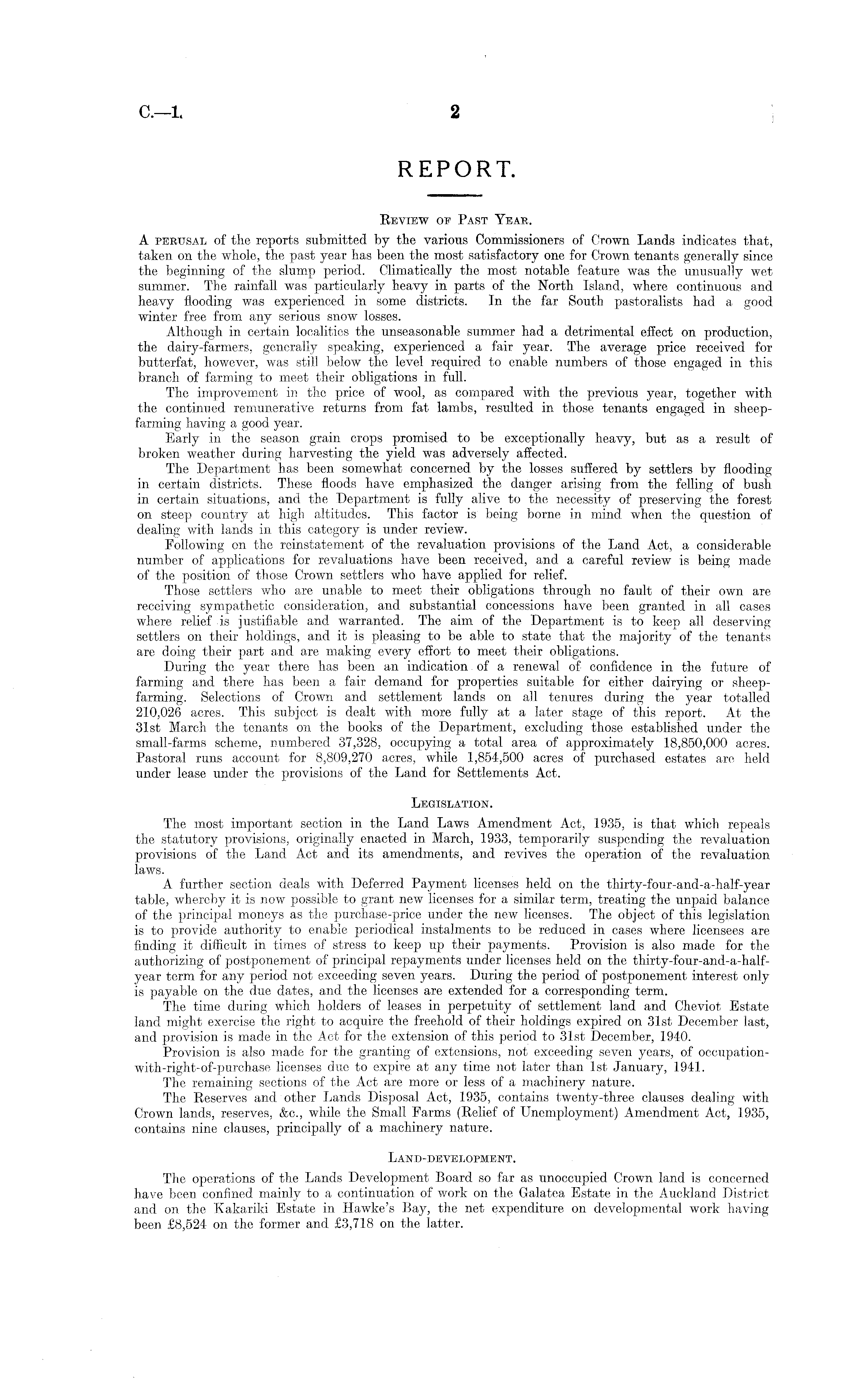 Review op Past Year. A perusal of the reports submitted by the various Commissioners of Crown Lands indicates that, taken on the whole, the past year has been the most satisfactory one for Crown tenants generally since the beginning of the slump period. Climatically the most notable feature was the unusually wet summer. The rainfall was particularly heavy in parts of the North Island, where continuous and heavy flooding was experienced in some districts. In the far South pastoralists had a good winter free from any serious snow losses. Although in certain localities the unseasonable summer had a detrimental effect on production, the dairy-farmers, generally speaking, experienced a fair year. The average price received for butterfat, however, was still below the level required to enable numbers of those engaged in this branch of farming to meet their obligations in full. The improvement in the price of wool, as compared with the previous year, together with the continued remunerative returns from fat lambs, resulted in those tenants engaged in sheepfarming having a good year. Early in the season grain crops promised to be exceptionally heavy, but as a result of broken weather during harvesting the yield was adversely affected. The Department has been somewhat concerned by the losses suffered by settlers by flooding in certain districts. These floods have emphasized the danger arising from the felling of bush in certain situations, and the Department is fully alive to the necessity of preserving the forest on steep country at high altitudes. This factor is being borne in mind when the question of dealing with lands in this category is under review. Following on the reinstatement of the revaluation provisions of the Land Act, a considerable number of applications for revaluations have been received, and a careful review is being made of the position of those Crown settlers who have applied for relief. Those settlers who are unable to meet their obligations through no fault of their own are receiving sympathetic consideration, and substantial concessions have been granted in all cases where relief is justifiable and warranted. The aim of the Department is to keep all deserving settlers on their holdings, and it is pleasing to be able to state that the majority of the tenants are doing their part and are making every efiort to meet their obligations. During the year there has been an indication of a renewal of- confidence in the future of farming and there has been a fair demand for properties suitable for either dairying or sheepfarming. Selections of Crown and settlement lands on all tenures during the year totalled 210,026 acres. This subject is dealt with more fully at a later stage of this report. At the 31st March the tenants on the books of the Department, excluding those established under the small-farms scheme, numbered 37,328, occupying a total area of approximately 18,850,000 acres. Pastoral runs account for 8,809,270 acres, while 1,854,500 acres of purchased estates are held under lease under the provisions of the Land for Settlements Act. Legislation. The most important section in the Land Laws Amendment Act, 1935, is that which repeals the statutory provisions, originally enacted in March, 1933, temporarily suspending the revaluation provisions of the Land Act and its amendments, and revives the operation of the revaluation laws. A further section deals with Deferred Payment licenses held on the thirty-four-and-a-half-year table, whereby it is now possible to grant new licenses for a similar term, treating the unpaid balance of the principal moneys as the purchase-price under the new licenses. The object of this legislation is to provide authority to enable periodical instalments to be reduced in cases where licensees are finding it difficult in times of stress to keep up their payments. Provision is also made for the authorizing of postponement of principal repayments under licenses held on the thirty-four-and-a-half-year term for any period not exceeding seven years. During the period of postponement interest only is payable on the due dates, and the licenses are extended for a corresponding term. The time during which holders of leases in perpetuity of settlement land and Cheviot Estate land might exercise the right to acquire the freehold of their holdings expired on 31st December last, and provision is made in the Act for the extension of this period to 31st December, 1940. Provision is also made for the granting of extensions, not exceeding seven years, of occupation-with-right-of-purchase licenses due to expire at any time not later than Ist January, 1941. The remaining sections of the Act are more or less of a machinery nature. The Reserves and other Lands Disposal Act, 1935, contains twenty-three clauses dealing with Crown lands, reserves, &c., while the Small Farms (Relief of Unemployment) Amendment Act, 1935, contains nine clauses, principally of a machinery nature. Land-development. The operations of the Lands Development Board so far as unoccupied Crown land is concerned have been confined mainly to a continuation of work on the Galatea Estate in the Auckland District and on the Kakariki Estate in Hawke's Bay, the net expenditure on developmental work having been £8,524 on the former and £3,718 on the latter.