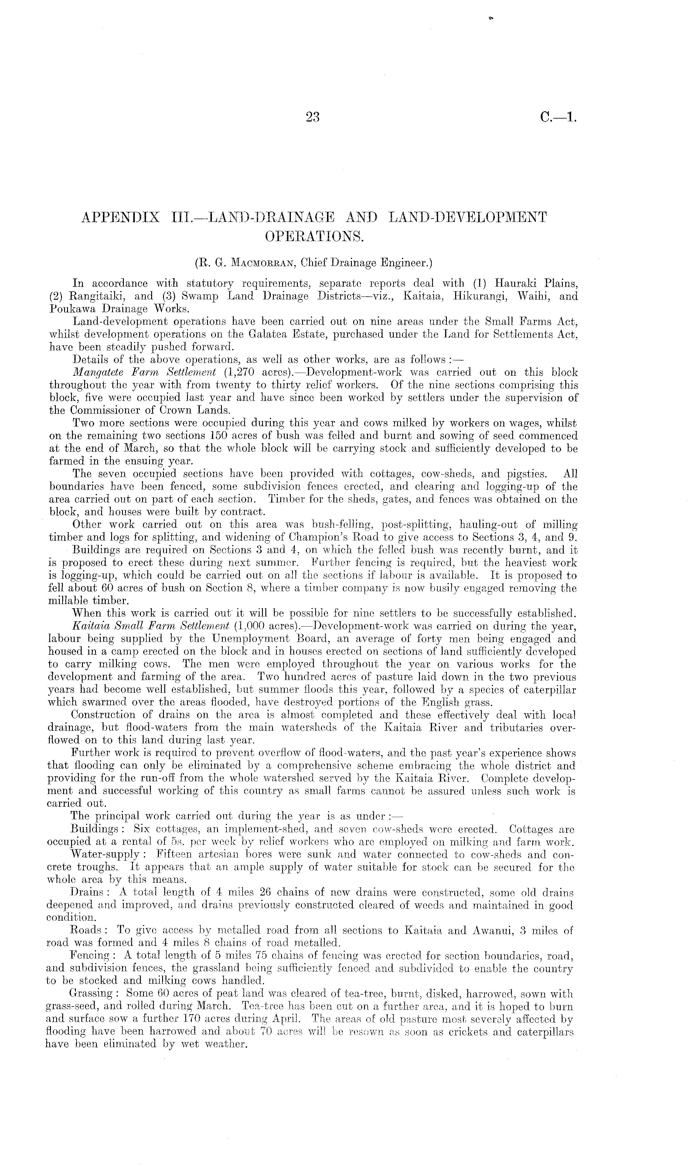 APPENDIX lII.—LAND-DRAINAGE AND LAND-DEVELOPMENT OPERATIONS. (R. G. Macmorran, Chief Drainage Engineer.) In accordance with statutory requirements, separate reports deal with (1) Hauraki Plains, (2) Rangitaiki, and (3) Swamp Land Drainage Districts —viz., Kaitaia, Hikurangi, Waihi, and Poukawa Drainage Works. Land-development operations have been carried out on nine areas under the Small Farms Act, whilst development operations on the Galatea Estate, purchased under the Land for Settlements Act, have been steadily pushed forward. Details of the above operations, as well as other works, are as follows : — Mangatete Farm Settlement (1,270 acres). —Development-work was carried out on this block throughout the year with from twenty to thirty relief workers. Of the nine sections comprising this block, five were occupied last year and have since been worked by settlers under the supervision of the Commissioner of Crown Lands. Two more sections were occupied during this year and cows milked by workers on wages, whilst on the remaining two sections 150 acres of bush was felled and burnt and sowing of seed commenced at the end of March, so that the whole block will be carrying stock and sufficiently developed to be farmed in the ensuing year. The seven occupied sections have been provided with cottages, cow-sheds, and pigsties. All boundaries have been fenced, some subdivision fences erected, and clearing and logging-up of the area carried out on part of each section. Timber for the sheds, gates, and fences was obtained on the block, and houses were built by contract. Other work carried out on this area was bush-felling, post-splitting, hauling-out of milling timber and logs for splitting, and widening of Champion's Road to give access to Sections 3, 4, and 9. Buildings are required on Sections 3 and 4, on which the felled bush was recently burnt, and it is proposed to erect these during next summer. Further fencing is required, but the heaviest work is logging-up, which could be carried out on all the sections if labour is available. It is proposed to fell about 60 acres of bush on Section 8, where a timber company is now busily engaged removing the millable timber. When this work is carried out' it will be possible for nine settlers to be successfully established. Kaitaia Small Farm Settlement (1,000 acres). —Development-work was carried on during the year, labour being supplied by the Unemployment Board, an average of forty men being engaged and housed in a camp erected on the block and in houses erected on sections of land sufficiently developed to carry milking cows. The men were employed throughout the year on various works for the development and farming of the area. Two hundred acres of pasture laid down in the two previous years had become well established, but summer floods this year, followed by a species of caterpillar which swarmed over the areas flooded, have destroyed portions of the English grass. Construction of drains on the area is almost completed and these effectively deal with local drainage, but flood-waters from the main watersheds of the Kaitaia River and tributaries overflowed on to this land during last year. Further work is required to prevent overflow of flood-waters, and the past year's experience shows that flooding can only be eliminated by a comprehensive scheme embracing the whole district and providing for the run-off from the whole watershed served by the Kaitaia River. Complete development and successful working of this country as small farms cannot be assured unless such work is carried out. The principal work carried out during the year is as under : — Buildings : Six cottages, an implement-shed, and seven cow-sheds were erected. Cottages are occupied at a rental of ss. per week by relief workers who are employed on milking and farm work. Water-supply : Fifteen artesian bores were sunk and water connected to cow-sheds and concrete troughs. It appears that an ample supply of water suitable for stock can be secured for the whole area by this means. Drains : A total length of 4 miles 26 chains of new drains were constructed, some old drains deepened and improved, and drains previously constructed cleared of weeds and maintained in good condition. Roads : To give access by metalled road from all sections to Kaitaia and Awanui, 3 miles of road was formed and 4 miles 8 chains of road metalled. Fencing : A total length of 5 miles 75 chains of fencing was erected for section boundaries, road, and subdivision fences, the grassland being sufficiently fenced and subdivided to enable the country to be stocked and milking cows handled. Grassing : Some 60 acres of peat land was cleared of tea-tree, burnt, disked, harrowed, sown with grass-seed, and rolled during March. Tea-tree has been cut on a further area, and it is hoped to burn and surface sow a further 170 acres during April. The areas of old pasture most severely affected by flooding have been harrowed and about 70 acres will be resown as soon as crickets and caterpillars have been eliminated by wet weather.