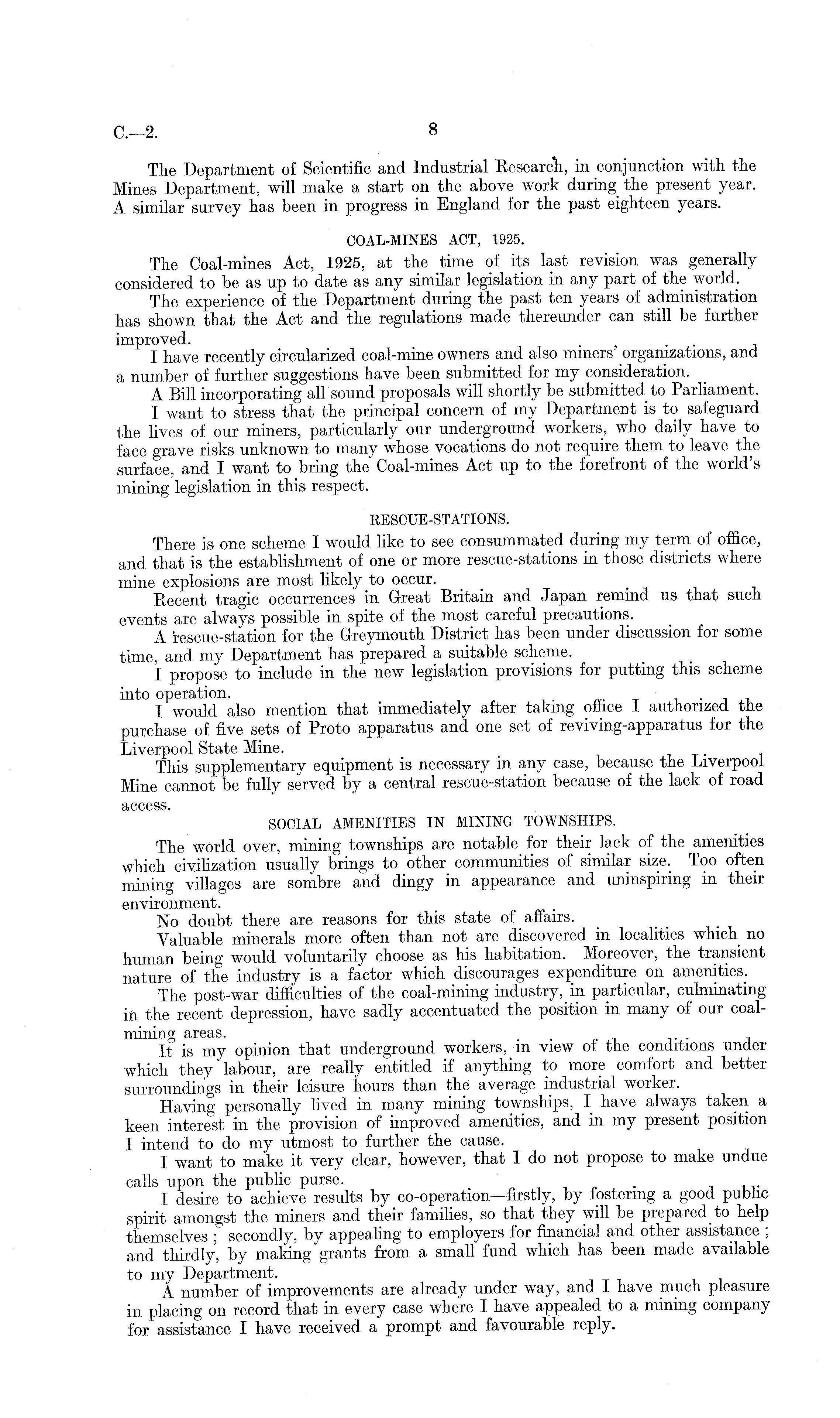 The Department of Scientific and Industrial Research, in conjunction with the Mines Department, will make a start on the above work during the present year. A similar survey has been in progress in England for the past eighteen years. COAL-MINES ACT, 1925. The Coal-mines Act, 1925, at the time of its last revision was generally considered to be as up to date as any similar legislation in any part of the world. The experience of the Department during the past ten years of administration has shown that the Act and the regulations made thereunder can still be further improved. I have recently circularized coal-mine owners and also miners' organizations, and a number of further suggestions have been submitted for my consideration. A Bill incorporating all sound proposals will shortly be submitted to Parliament. I want to stress that the principal concern of my Department is to safeguard the lives of our miners, particularly our underground workers, who daily have to face grave risks unknown to many whose vocations do not require them to leave the surface, and I want to bring the Coal-mines Act up to the forefront of the world's mining legislation in this respect. RESCUE-STATIONS. There is one scheme I would like to see consummated during my term of office, and that is the establishment of one or more rescue-stations in those districts where mine explosions are most likely to occur. Recent tragic occurrences in Great Britain and Japan remind us that such events are always possible in spite of the most careful precautions. A rescue-station for the Greymouth District has been under discussion for some time, and my Department has prepared a suitable scheme. I propose to include in the new legislation provisions for putting this scheme into operation. . I would also mention that immediately after taking office I authorized the purchase of five sets of Proto apparatus and one set of reviving-apparatus for the Liverpool State Mine. , This supplementary equipment is necessary in any case, because the Liverpool Mine cannot be fully served by a central rescue-station because of the lack of road access. SOCIAL AMENITIES IN MINING TOWNSHIPS. The world over, mining townships are notable for their lack of the amenities which civilization usually brings to other communities of similar size. Too often mining villages are sombre and dingy in appearance and uninspiring in their environment. No doubt there are reasons for this state of affairs. Valuable minerals more often than not are discovered in localities which no human being would voluntarily choose as his habitation. Moreover, the transient nature of the industry is a factor which discourages expenditure on amenities. The post-war difficulties of the coal-mining industry, in particular, culminating in the recent depression, have sadly accentuated the position in many of our coalmining areas. . It is my opinion that underground workers, m view of the conditions under which they labour, are really entitled if anything to more comfort and better surroundings in their leisure hours than the average industrial worker. Having personally lived in many mining townships, I have always taken a keen interest in the provision of improved amenities, and in my present position I intend to do my utmost to further the cause. I want to make it very clear, however, that I do not propose to make undue calls upon the public purse. * . I desire to achieve results by co-operation—firstly, by fostering a good public spirit amongst the miners and their families, so that they will be prepared to help themselves ; secondly, by appealing to employers for financial and other assistance ; and thirdly, by making grants from a small fund which has been made available to my Department. A number of improvements are already under way, and I have much pleasure in placing on record that in every case where I have appealed to a mining company for assistance I have received a prompt and favourable reply.
