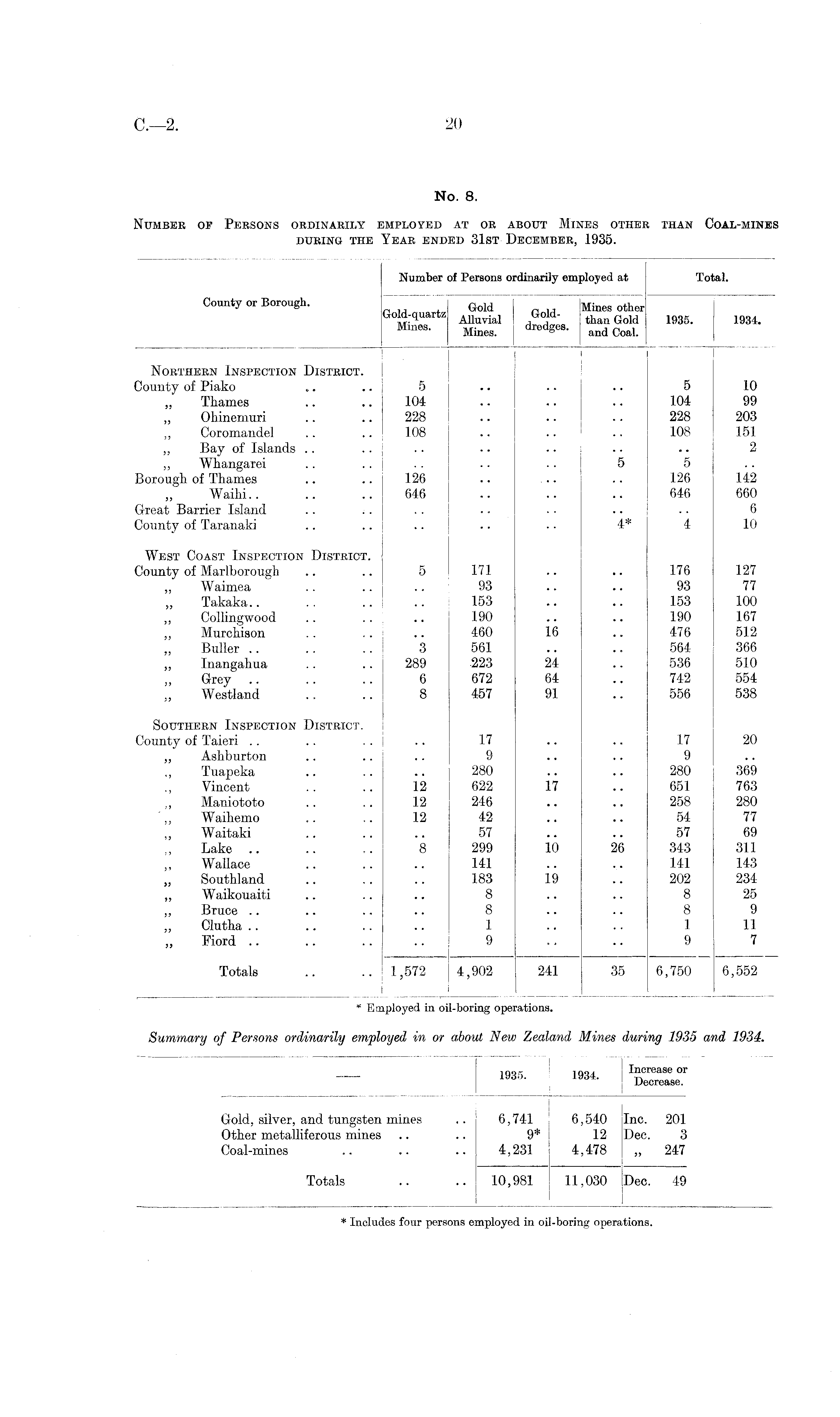 1935. 1934. Increase or Decrease. I Gold, silver, and tungsten mines .. 6,741 6,540 Inc. 201 Other metalliferous mines .. .. 9* 12 Dec. 3 Coal-mines .. .. .. 4,231 4,478 ,, 247 Totals .. .. 10,981 11,030 Dec. 49 * Includes four persons employed in oil-boring operations.