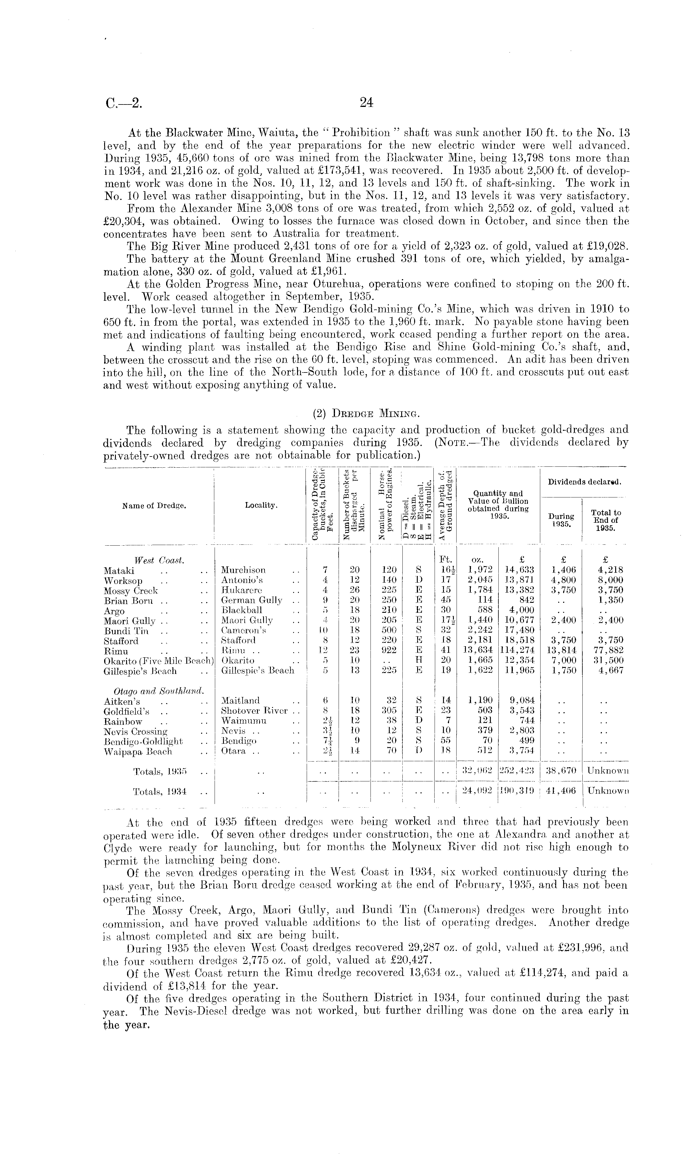 At the Blackwater Mine, Waiuta, the " Prohibition " shaft was sunk another 150 ft. to the No. 13 level, and by the end of the year preparations for the new electric winder were well advanced. During 1935, 45,660 tons of ore was mined from the Blackwater Mine, being 13,798 tons more than in 1934, and 21,216 oz. of gold, valued at £173,541, was recovered. In 1935 about 2,500 ft. of development work was done in the Nos. 10, 11, 12, and 13 levels and 150 ft. of shaft-sinking. The work in No. 10 level was rather disappointing, but in the Nos. 11, 12, and 13 levels it was very satisfactory. From the Alexander Mine 3,008 tons of ore was treated, from which 2,552 oz. of gold, valued at £20,304, was obtained. Owing to losses the furnace was closed down in October, and since then the concentrates have been sent to Australia for treatment. The Big River Mine produced 2,431 tons of ore for a yield of 2,323 oz. of gold, valued at £19,028. The battery at the Mount Greenland Mine crushed 391 tons of ore, which yielded, by amalgamation alone, 330 oz. of gold, valued at £1,961. At the Golden Progress Mine, near Oturehua, operations were confined to stoping on the 200 ft. level. Work ceased altogether in September, 1935. The low-level tunnel in the New Bendigo Gold-mining Co.'s Mine, which was driven in 1910 to 650 ft. in from the portal, was extended in 1935 to the 1,960 ft. mark. No payable stone having been met and indications of faulting being encountered, work ceased pending a further report on the area. A winding plant was installed at the Bendigo Rise and Shine Gold-mining Co.'s shaft, and, between the crosscut and the rise on the 60 ft. level, stoping was commenced. An adit has been driven into the hill, on the line of the North-South lode, for a distance of 100 ft. and crosscuts put out east and west without exposing anything of value.