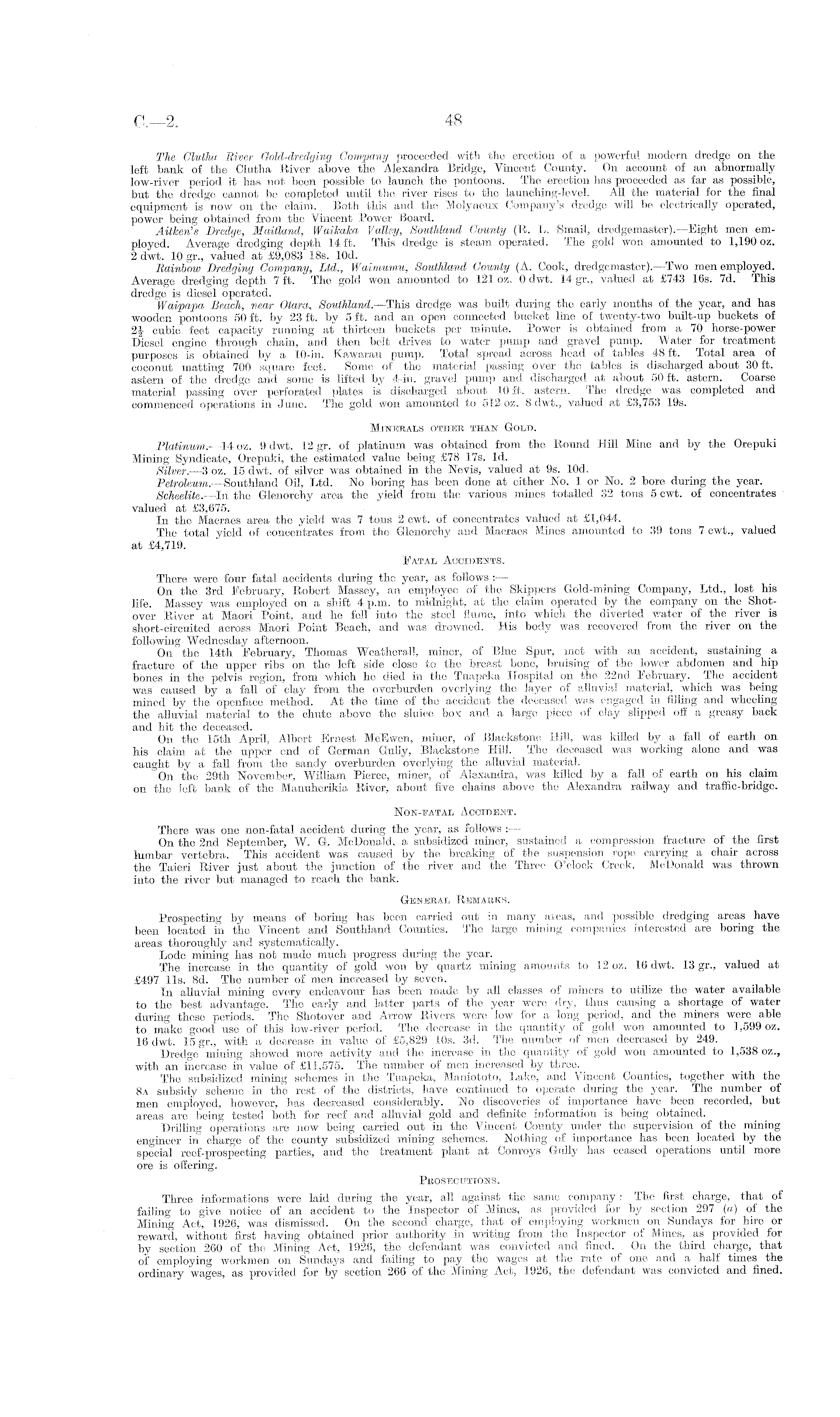 The Clutha River Gold-dredging Company proceeded with the erection of a powerful modern dredge on the left bank of the Olutha River above the Alexandra Bridge, Vincent County. On account of an abnormally low-river period it has not been possible to launch the pontoons. The erection has proceeded as far as possible, but the dredge cannot be completed until the river rises to the launching-level. All the material for the final equipment is now on the claim. Both this and the Molyneux Company's dredge will be electrically operated, power being obtained from the Vincent Power Board. Aitken's Dredge, Maitland, Waikaka Valley, Southland County (R. L. Smail, dredgemaster).—Eight men employed. Average dredging depth 14 ft. This dredge is steam operated. The gold won amounted to 1,190 oz. 2 dwt. 10 gr., valued at £9,083 18s. lOd. Rainbow Dredging Company, Ltd., Waimumu, Southland County (A. Cook, dredgemaster).—Two men employed. Average dredging depth 7 ft. The gold won amounted to 121 oz. 0 dwt. 14 gr., valued at £743 16s. 7d. This dredge is diesel operated. Waipapa Beach, near Otara, Southland. —This dredge was built during the early months of the year, and has wooden pontoons 50 ft. by 23 ft. by 5 ft. and an open connected bucket line of twenty-two built-up buckets of 2J cubic feet capacity running at thirteen buckets per minute. Power is obtained from a 70 horse-power Diesel engine through chain, and then belt drives to water pump and gravel pump. Water for treatment purposes is obtained by a 10-in. Kawarau pump. Total spread across head of tables 48 ft. Total area of coconut matting 700 square feet. Some of the material passing over the tables is discharged about 30 ft. astern of the dredge and some is lifted by 4-in. gravel pump and discharged at about 50 ft. astern. Coarse material passing over perforated plates is discharged about 10 ft. astern. The dredge was completed and commenced operations in June. The gold won amounted to 512 oz. 8 dwt., valued at £3,753 19s. Minerals othek than Gold. Platinum. —14 oz. 9 dwt. 12 gr. of platinum was obtained from the Bound Hill Mine and by the Orepuki Mining Syndicate, Orepuki, the estimated value being £78 17s. Id. Silver. —3 oz. 15 dwt. of silver was obtained in the Nevis, valued at 9s. lOd. Petroleum. —Southland Oil, Ltd. No boring has been done at either No. lor No. 2 bore during the year. Scheelite.—ln the Glenorchy area the yield from the various mines totalled 32 tons 5 cwt. of concentrates valued at £3,675. In the Macraes area the yield was 7 tons 2 cwt. of concentrates valued at £1,044. The total yield of concentrates from the Glenorchy and Macraes Mines amounted to 39 tons 7 cwt., valued at £4,719. Fatal Accidents. There were four fatal accidents during the year, as follows : — On the 3rd February, Robert Massey, an employee of the Skippers Gold-mining Company, Ltd., lost his life. Massey was employed on a shift 4 p.m. to midnight, at the claim operated by the company on the Shotover River at Maori Point, and he fell into the steel flume, into which the diverted water of the river is short-circuited across Maori Point Beach, and was drowned. His body was recovered from the river on the following Wednesday afternoon. On the 14th February, Thomas Weatherall, miner, of Blue Spur, met with an accident, sustaining a fracture of the upper ribs on the left side close to the breast bone, bruising of the lower abdomen and hip bones in the pelvis region, from which he died in the Tuapeka Hospital on the 22nd February. The accident was caused by a fall of clay from the overburden overlying the layer of alluvial material, which was being mined by the openface method. At the time of the accident the deceased was engaged in filling and wheeling the alluvial material to the chute above the sluice box and a large piece of clay slipped off a greasy back and hit the deceased. On the 15th April, Albert Ernest McEwen, miner, of Blackstone Hill, was killed by a fall of earth on his claim at the upper end of German Gully, Blackstone Hill. The deceased was working alone and was caught by a fall from the sandy overburden overlying the alluvial material. On the 29th November, William Pierce, miner, of Alexandra, was killed by a fall of earth on his claim on the left bank of the Manuherikia River, about five chains above the Alexandra railway and traffic-bridge. Non-fatal Accident. There was one non-fatal accident during the year, as follows : — On the 2nd September, W. G. McDonald, a subsidized miner, sustained a compression fracture of the first lumbar vertebra. This accident was caused by the breaking of the suspension rope carrying a chair across the Taieri River just about the junction of the river and the Three O'clock Creek. McDonald was thrown into the river but managed to reach the bank. General Remakes. Prospecting by means of boring has been carried out in many areas, and possible dredging areas have been located in the Vincent and Southland Counties. The large mining companies interested are boring the areas thoroughly and systematically. Lode mining has not made much progress during the year. The increase in the quantity of gold won by quartz mining amounts to 12 oz. 16 dwt. 13 gr., valued at £497 lis. Bd. The number of men increased by seven. In alluvial mining every endeavour has been made by all classes of miners to utilize the water available to the best advantage. The early and latter parts of the year were dry, thus causing a shortage of water during these periods. The Shotover and Arrow Rivers were low for a long period, and the miners were able to make good use of this low-river period. The decrease in the quantity of gold won amounted to 1,599 oz. 16 dwt. 15 gr., with a decrease in value of £5,829 10s. 3d. The number of men decreased by 249. Dredge mining showed more activity and the increase in the quantity of gold won amounted to 1,538 oz., with an increase in value of £11,575. The number of men increased by three.