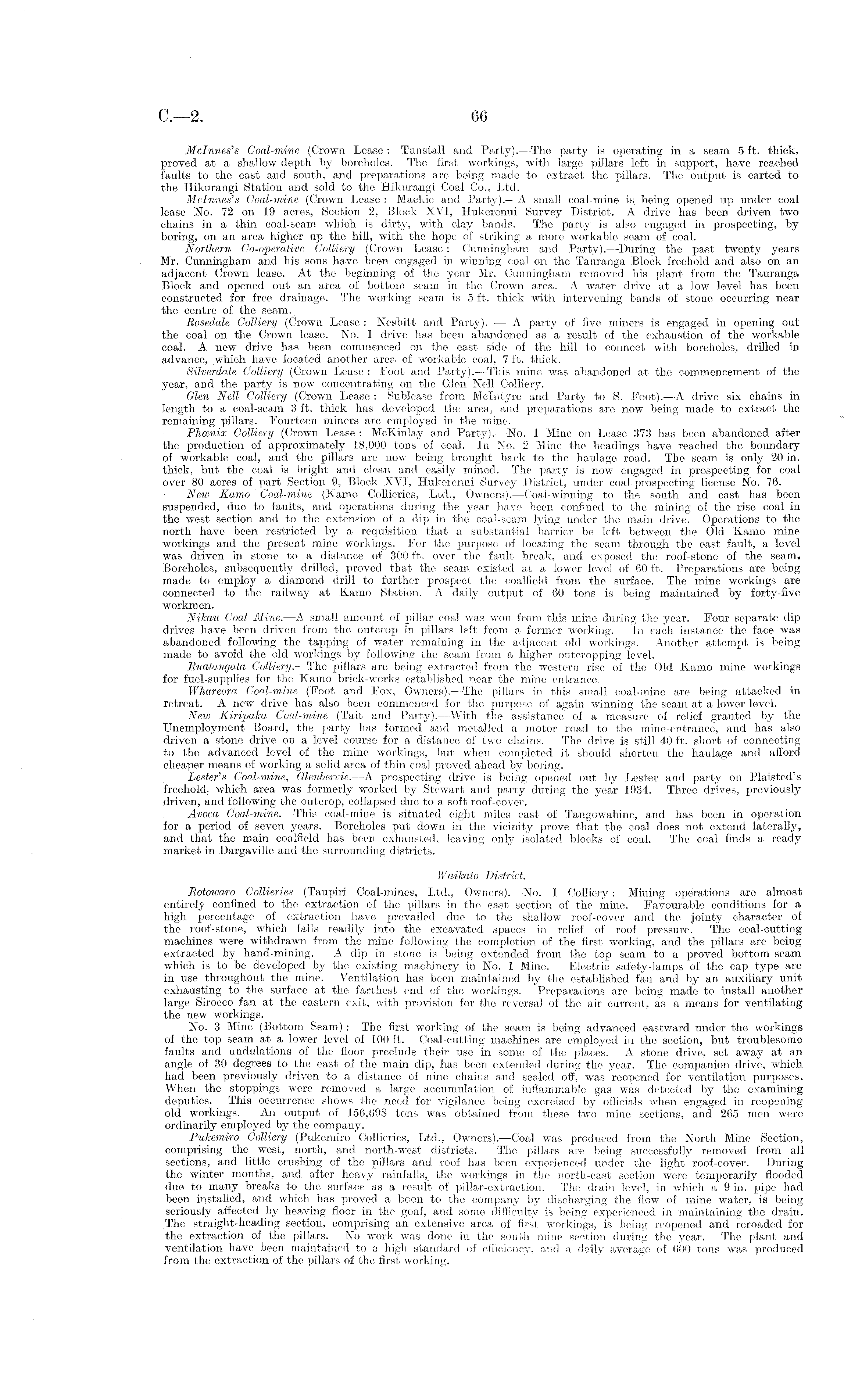 Mel nines'a Coal-mine (Grown Lease : Tunstall and Party).—The party is operating in a seam 5 ft. thick, proved at a shallow depth by boreholes. The first workings, with large pillars left in support, have reached faults to the east and south, and preparations are being made to extract the pillars. The output is carted to the Hikurangi Station and sold to the Hikurangi Coal Co., Ltd. Mclnnes's Coal-mine (Crown Lease : Mackie and Party).—A small coal-mine is. being opened up under coal lease No. 72 on 19 acres, Section 2, Block XVI, Hukerenui Survey District. A drive has been driven two chains in a thin coal-seam which is dirty, with clay bands. The party is also engaged in prospecting, by boring, on an area higher up the hill, with the hope of striking a more workable seam of coal. Northern Co-operative Colliery (Crown Lease: Cunningham and Party).—During the past twenty years Mr. Cunningham and his sons have been engaged in winning coal on the Tauranga Block freehold and also on an adjacent Crown lease. At the beginning of the year Mr. Cunningham removed his plant from the Tauranga Block and opened out an area of bottom seam in the Crown area. A water drive at a low level has been constructed for free drainage. The working seam is 5 ft. thick with intervening bands of stone occurring near the centre of the seam. Sosedale Colliery (Crown Lease : Nesbitt and Party). — A party of five miners is engaged in opening out the coal on the Crown lease. No. 1 drive has been abandoned as a result of the exhaustion of the workable coal. A new drive has been commenced on the east side of the hill to connect with boreholes, drilled in advance, which have located another area of workable coal, 7 ft. thick. Silverdale Colliery (Crown Lease : Foot and Party).—This mine was abandoned at the commencement of the year, and the party is now concentrating on the Glen Nell Colliery. Glen Nell Colliery (Crown Lease: Sublease from Mclntyre and Party to S. Foot). —A drive six chains in length to a coal-seam 3 ft. thick has developed the area, and preparations are now being made to extract the remaining pillars. Fourteen miners are employed in the mine. Phmnix Colliery (Crown Lease : McKinlay and Party).—No. 1 Mine on Lease 373 has been abandoned after the production of approximately 18,000 tons of coal. In No. 2 Mine the headings have reached the boundary of workable coal, and the pillars are now being brought back to the haulage road. The seam is only 20 in. thick, but the coal is bright and clean and easily mined. The party is now engaged in prospecting for coal over 80 acres of part Section 9, Block NVI, Hukerenui Survey District, under coal-prospecting license No. 76. New Kamo Coal-mine (Kamo Collieries, Ltd., Owners). —Coal-winning to the south and east has been suspended, due to faults, and operations during the year have been confined to the mining of the rise coal in the west section and to the extension of a dip in the coal-seam lying under the main drive. Operations to the north have been restricted by a requisition that a substantial barrier be left between the Old Kamo mine workings and the present mine workings. For the purpose of locating the seam through the east fault, a level was driven in stone to a distance of 300 ft. over the fault break, and exposed the roof-stone of the seam. Boreholes, subsequently drilled, proved that the seam existed at a lower level of 60 ft. Preparations are being made to employ a diamond drill to further prospect the coalfield from the surface. The mine workings are connected to the railway at Kamo Station. A daily output of 60 tons is being maintained by forty-five workmen. Nikau Coal Mine. —A small amount of pillar coal was won from this mine during the year. Four separate dip drives have been driven from the outcrop in pillars left from a former working. In each instance the face was abandoned following the tapping of water remaining in the adjacent old workings. Another attempt is being made to avoid the old workings by following the seam from a higher outcropping level. Ruatangata Colliery.—The pillars are being extracted from the western rise of the Old Kamo mine workings for fuel-supplies for the Kamo brick-works established near the mine entrance. Whareora Coal-mine (Foot and Fox, Owners). —The pillars in this small coal-mine are being attacked in retreat. A new drive has also been commenced for the purpose of again winning the seam at a lower level. New Kiripaka Coal-mine (Tait and Party).—With the assistance of a measure of relief granted by the Unemployment Board, the party has formed and metalled a motor road to the mine-entrance, and has also driven a stone drive on a level course for a distance of two chains. The drive is still 40 ft. short of connecting to the advanced level of the mine workings, but when completed it should shorten the haulage and afford cheaper means of working a solid area of thin coal proved ahead by boring. Lester's Coal-mine, Clenbervie.—A prospecting drive is being opened out by Lester and party on Plaisted's freehold, which area was formerly worked by Stewart and party during the year 1934. Three drives, previously driven, and following the outcrop, collapsed due to a soft roof-cover. Avoca Coal-mine. —This coal-mine is situated eight miles east of Tangowahine, and has been in operation for a period of seven years. Boreholes put down in the vicinity prove that the coal does not extend laterally, and that the main coalfield has been exhausted, leaving only isolated blocks of coal. The coal finds a ready market in Dargaville and the surrounding districts. Waikato District. Rotowaro Collieries (Taupiri Coal-mines, Ltd., Owners). —No. I Colliery: Mining operations are almost entirely confined to the extraction of the pillars in the east section of the mine. Favourable conditions for a high percentage of extraction have prevailed due to the shallow roof-cover and the jointy character of the roof-stone, whic