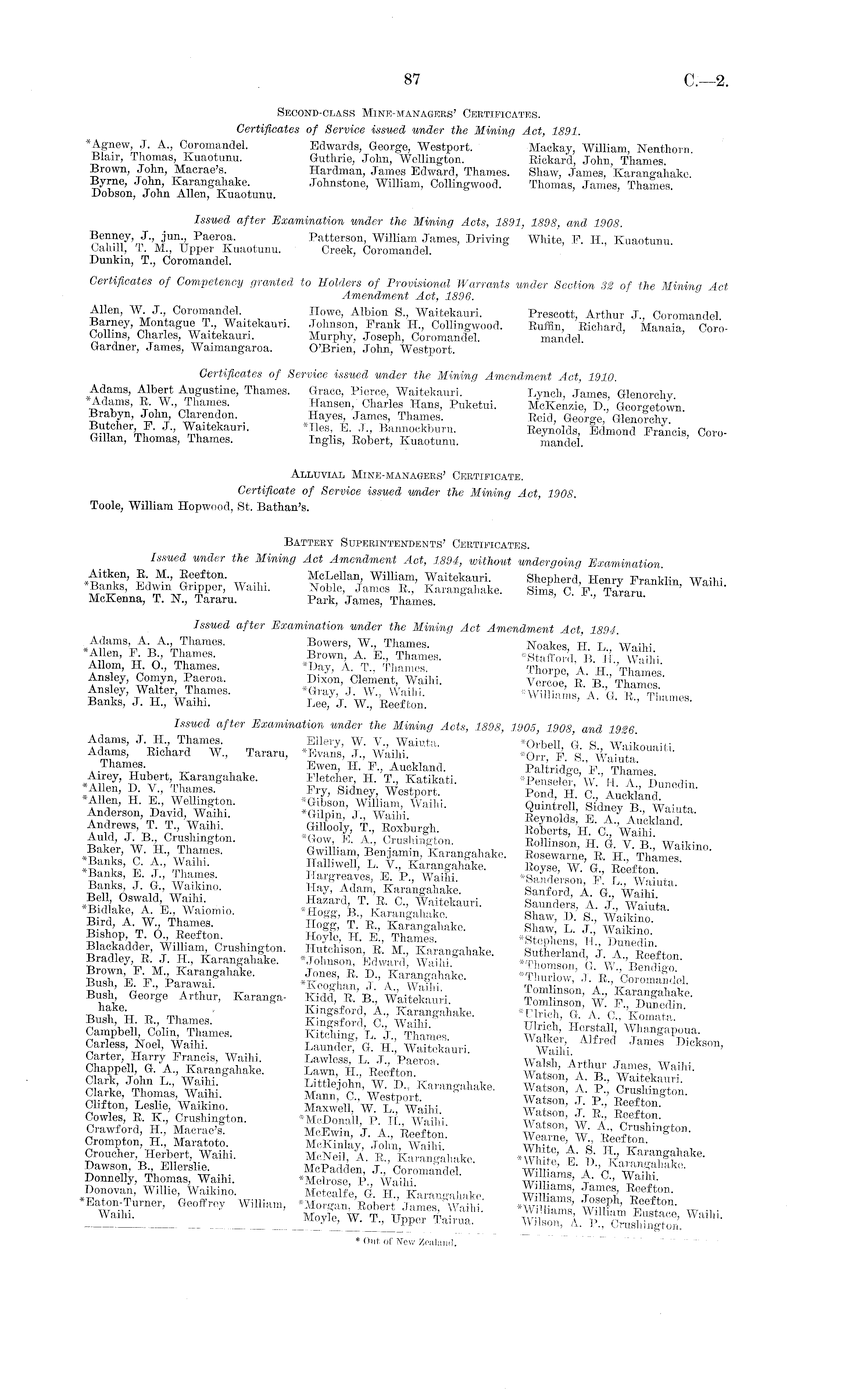 Second-class Mine-managers' Certificates. Certificates of Service issued under the Mining Act, 1891. «Agnew, J. A., Coromandel. Edwards, George, Westport. Mackay, William, Nenthorn Blair, Thomas, Kuaotunu. Guthrie, John, Wellington. Rickard, John, Thames. Brown, John, Macrae's. Hardman, James Edward, Thames. Shaw, James, Karangahake. Byrne, John, Karangahake. Johnstone, William, Collingwood. Thomas, James, Thames Dobson, John Allen, Kuaotunn. Issued after Examination under the Mining Acts, 1891, 1898, and 1908. Benney, J., jun., Paeroa. Patterson, William James, Driving White, F. H., Kuaotunu. Cahill, T. M., Upper Kuaotunu. Creek, Coromandel. Dunkin, T., Coromandel. Certificates of Competency granted to Holders of Provisional Warrants under Section S2 of the Mining Act Amendment Act, 1896. Allen, W. J., Coromandel. Howe, Albion S., Waitekauri. Prescott, Arthur J., Coromandel. Barney, Montaguei T., Waitekauri. Johnson, Frank H., Collingwood. Ruffin, Richard, Manaia, CoroGoilms, Charles, Waitekauri. Murphy, Joseph, Coromandel. mandel. Gardner, James, Waimangaroa. O'Brien, John, Westport. Certificates of Service issued under the Mining Amendment Act, 1910. Adams, Albert Augustine, Thames. Grace, Pierce, Waitekauri. Lynch, James Glenorcliv «Adams, RW. Thames. Hansen/Charles Hans, Puketui. McKenzie, D., Georgetown. Brabyn, John Clarendon. _ Hayes, James, Thames. Reid, George, Glenorchy. Butcher F. J., Waitekauri. lies E. J Bannockburn. Reynolds, Edmond Francis, CoroGillan, Thomas, Thames. Inglis, Robert, Kuaotunu. mandel. Alluvial Mine-managers' Certificate. Certificate of Service issued wider the Miming Act, 1908. Toole, William Hopwood, St. Bathan's. Battery Superintendents' Certificates. Issued under the Mining Act Amendment Act, 1894, without undergoing Examination. Aitken, R. M., Reefton. McLellan, William, Waitekauri. Shepherd Henrv Franklin Wnil,; «Banks, Edwin Gripper, Wailii. Noble, James R, Karangahake. Sims C. F Tararu McKenna, T. N., Tararu. Park, James, Thames. Issued ctftev Examination under the Mining Act Amendment Act, 1894. *ln amS '- P A V> A ''rr? KameS - Bowers, W., Thames. Noakes, H. L., Wailii Allen, F. 8., Thames. Brown, A. E„ Thames. «Stafford B H Wai 1 i Allom, H. 0., Thames. «Day, A. T., Thames. Thorpe 'A H Thames' Ansley, Comyn, Paeroa. Dixon, Clement, Waihi. Vercoe' R' B ' Thames Ansley, Walter, Thames. * Gray, J. W., Waihi. 'Si A G Al™, Banks, J. H, Waihi. Lee, J. W„ Reefton. Williams, A. G. R., Thames. Issued after Examination under the Mining Acts, 1898, 1905, 1908, and 1926. Adams, J. H., Thames. Ellery, W. V., AVaiuta *OvT->all p q •, • Adams, Richard W„ Tararu, «Evans J., «Orr F S WaT^ Thames. Ewen, H. F, Auckland. Paltridge FThames Airey, Hubert Karangahake. Fletcher, H. T, Katikati. '*Pensele?,'w.''H. A Dunedin Allen, D. V., Thames. Fry, Sidney, Westport. Pond H 0 Auckland "Allen, H. E„ Wellington. "Gibson, William, Waihi. Quintrell Sidney B Waiuta Anderson, David, Waihi. * Gilpin, J., Waihi. Reynolds' F A A 11 ? Andrews, T. T, Waihi. Gillooly, T., Roxburgh. Sts H C wt? Auld, J. 8., Crushington. «Gow, E. A., Crushington. Rollinso'n IT f'l V "R ' W "V «BanS Ī' ?•' wr a w W n lia u' Beu J amin - Karangahake. Rosewarne, R. H.,' Thanhs Banks, C. A., Waihi. Halliwell, L. V., Karangahake. Royse W G Reefton Banks' J G' WaMno Hargreaves, E. P., Waihi. «Sanderson, F L„ Wai'uta. inSi rv ii'w -r- ĪĪ y ' 4 dam ' karangahake. Sanford, A. G„ Waihi *B?dl'nke SW A Vw' • HazardjTK. c., Waitekauri. Saunders, A. J., Waiuta Bird A W Thlmes ' W° gg ' t' karangahake Shaw, D. S„ Waikino. Bishoß T O Reefton Karangahake. Shaw, L. J., Waikino. Blackadder Wiufam, Crushington. Sisfn, r! M, & Sangahake lulerZ/'j Tl^ft Bradley RJ. H„ Karangahlke. «Johnson, Edward Waihi. g «Thomson^Vw 4°eoK ?-A K « ake - Bush George Arthur, Karanga- Kidd, R.'b. Waitekauri. TomlinsonJ W F.^Dunedin 6 ' Bus? e H. R„ Thames.' Sgffi » H S" Campbell, Colin, Thames. Kitching L J Thames W B t ' Whangapoua, Carless, Noel, Waihi. C. £ Waitekauri. DickS ° n ' Carter, Harry Francis. Waihi. Lawless L J Ppprni w„\ T \ ~ Chappell, G. A., Karangahake. Lawn! H., Reefton Watson ATR Si tlflS?*Cowles,'R. e K ie ; Crushington. «MclWl^P.H.,™hi Watson W \ Crawford, H, Macrae's. McEwin, J. A., Reefton. Weane W ReeS § Crompton, H., Maratoto. McKinlay, John, Waihi. White A «( tt, , Croucher, Herbert, Waihi. McNeil A R Karano-ahake ' 4' Karangahake. Dawson, B Ellerslia McPadden/ feSSSf* W Snf' a" o^ Waif Donnelly, Thomas, Waihi. «Melrose, P Wailii xrrir 'V" ' Donovan, Willie, Waikino. Metcalfe G H Karansrahake W'lr™ 8 ' 'ī ame ®' Eee fton. •Eaton-Turner, Geoffrey William, «Morgan, Robert' James, Waihi." «Willianis WmFam EuftaT; W-V WailU - Moyle, W. T„ Upper Tairua. 1. pfcrushhigton.