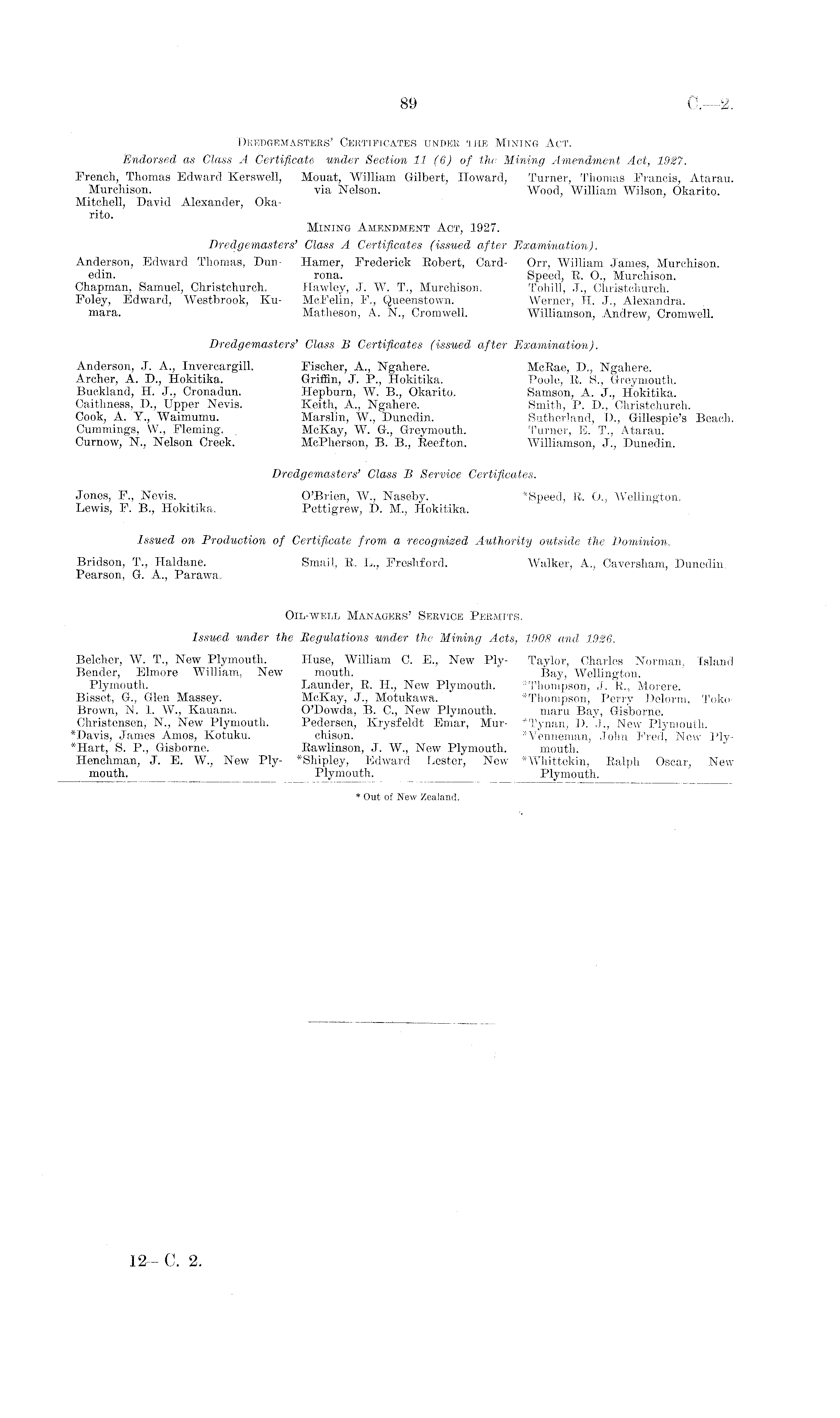 Dredgemasters' Certificates under the Mining Act. Endorsed as Glass A Certificate imder Section 11 (6) of the Mining Amendment Act, 1927. French, Thomas Edward Kerswell, Mouat, William Gilbert, Howard, Turner, Thomas Francis, At.arau. Murchison. via Nelson. Wood, William Wilson, Okarito. Mitchell, David Alexander, Okarito. Mining Amendment Act, 1927. Dredgemasters' Class A Certificates (issued after Examination). Anderson, Edward Thomas, Dun- Hamer, Frederick Robert, Card- Orr, William James, Murchison. edin. rona. Speed, R. 0., Murchison. Chapman, Samuel, Christchurch. Hawley, J. W. T., Murchison. Tohill, J., Christchurch. Foley, Edward, Westbrook, Ku- McFelin, F., Queenstown. Werner, H. J., Alexandra. niara. Matheson, A. N., Cromwell. Williamson, Andrew, Cromwell. Dredgemasters' Class B Certificates (issued after Examination). Anderson, J. A., Invercargill. Fischer, A., Ngahere. Mcßae, D., Ngahere. Archer, A. D., Hokitika. Griffin, J. P., Hokitika. Poole, R. S., Greymouth. Buckland, H. J., Cronadun. Hepburn, W. 8., Okarito. Samson, A. J., Hokitika. Caithness, D., Upper Nevis. Keith, A., Ngahere. Smith, P. D., Christchurch. Cook, A. Y., Waimumu. Marslin, W., Dunedin. Sutherland, D., Gillespie's Beach. Cummings, W., Fleming. McKay, W. G., Greymouth. Turner, E. T., Atarau. Curnow, N., Nelson Creek. McPherson, B. 8., Reefton. Williamson, J., Dunedin. Dredgemasters' Class B Service Certificates. Jones, F., Nevis. O'Brien, W., Naseby. *Speed, R. 0., Wellington. Lewis, F. 8., Hokitika. Pettigrew, D. M., Hokitika. Issued on Production of Certificate from a recognized Authority outside the Dominion. Bridson, T., Haldane. Smail, R. L., Fresliford. Walker, A., Caversham, Dunedin. Pearson, G. A., Parawa. Oil-well Managers' Service Permits. Issued under the Regulations imder the Mining Acts, 1908 and 1926. Belcher, W. T., New Plymouth. Huse, William C. E., New Ply- Taylor, Charles Norman, Island Bender, Elmore William, New mouth. * Bay, Wellington. Plymouth. Launder, R. H,, New Plymouth. "Thompson, J. R., Morere. Bisset, G., Glen Massey. McKay, J., Motukawa. Perry Delorm, TokoBrown, N. I. W., Kauana. O'Dowda, B. C., New Plymouth. maru Bay, Gisborne. Cliristensen, N., New Plymouth. Pedersen, Krysfeldt Emar, Mur- *Tynan, D. J., New Plymouth. *Davis, James Amos, Kotuku. ehison. *Venneman, John Fred, New Ply- * Hart, S. P., Gisborne. Rawlinson, J. W., New Plymouth. mouth. Henchman, J. E. W., New Ply- *Shipley, Edward Lester, New *Whittekin, Ralph Oscar, New mouth. Plymouth. Plymouth.