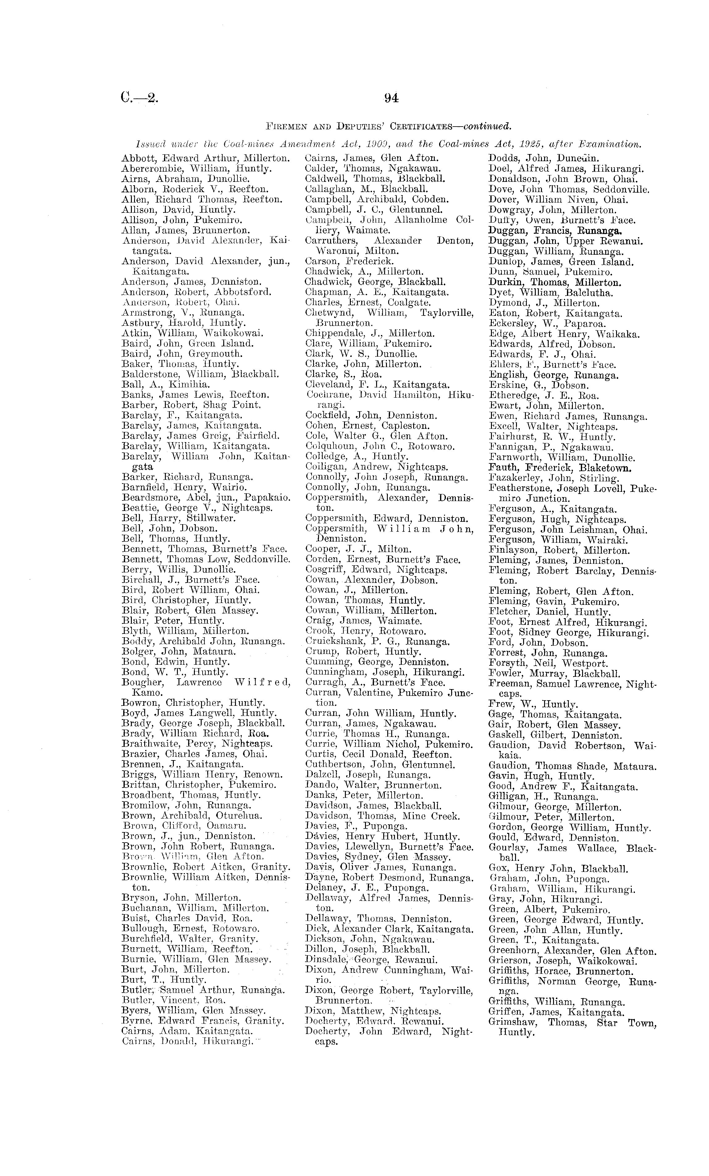 Firemen and Deputies' Certificates —continued. Issued under the Coal-mines Amendment Act, 1909, and the Coal-mines Act, 1985, after Examination. Abbott, Edward Arthur, Millerton. Cairns, James, Glen Aftoii. Dodds, John, Duneiin. Aberorombie, William, Huntly. Calder, Thomas, Ngakawau. Doel, Alfred James, Hikurangi. Aims, Abraham, Dunollie. Caldwell, Thomas, Blackball. Donaldson, John Brown, Ohai. Alborn, Roderick V., Reef ton. Callaghan, M., Blackball. Dove, John Thomas, Seddonville. Allen, Richard Thomas, Reefton. Campbell, Archibald, Cobden. Dover, William Niven, Ohai. Allison, David, Huntly. Campbell, J. C., Glentunnel. Dowgray, John, Millerton. Allison, John, Bukemiro. Campbell, John, Allanholme Col- Duffy, Owen, Burnett's Face. Allan, James, Brunnerton. liery, Waimate. Duggan, Francis, Runanga. Anderson, David Alexander, Kai- Carruthers, Alexander Denton, Duggan, John, Upper Rewanui. tangata. Waronui, Milton. Duggan, William, Runanga. Anderson, David Alexander, jun., Carson, Frederick. Dunlop, James, Green Island. Kaitangata. Chadwick, A., Millerton. Dunn, Samuel, Bukemiro. Anderson, James, Denniston. Chadwick, George, Blackball. Durkin, Thomas, Millerton. Anderson, Robert, Abbotsford. Chapman, A. E., Kaitangata. Dyet, William, Balclutha. Anderson, Robert, Ohai. Charles, Ernest, Coalgate. Dymond, J., Millerton. Armstrong, V., Runanga. Clietwynd, William, Taylorville, Eaton, Robert, Kaitangata. Astbury, Harold, Huntly. Brunnerton. Eckersley, W., Baparoa. Atkin, William, Waikokowai. Chippendale, J., Millerton. Edge, Albert Henry, Waikaka. Baird, John, Green Island. Clare,. William, Bukemiro. Edwards, Alfred, Dobson. Baird, John, Greymouth. Clark, W. S., Dunollie. Edwards, F. J., Ohai. Baker, Thomas, Huntly. Clarke, John, Millerton. Ehlers, I'., Burnett's Face. Balderstone, William, Blackball. Clarke, S., Boa. English, George, Runanga. Ball, A., Kimihia. Cleveland, I'. L., Kaitangata. Erskine, G., Dobson. Banks, James Lewis, Beef ton. Cochrane, David Hamilton, Hiku- Etheredge, J. E., Roa. Barber, Robert, Shag Boint. rangi. Ewart, John, Millerton. Barclay, F., Kaitangata. Cock Held, John, Denniston. Ewen, Richard James, Runanga. Barclay, James, Kaitangata. Cohen, Ernest, Capleston. Excell, Walter, Nightcaps. Barclay, James Greig, Fairfield. Cole, Walter G, Glen Afton. Fairhurst, R. W., Huntly. Barclay, William, Kaitangata. Colquhoun, John C., Rotowaro. Fannigan, 8., Ngakawau. Barclay, William John, Kaitan- Colledge, A., Huntly. Farnworth, William, Dunollie. gata Colligan, Andrew, Nightcaps. Fauth, Frederick, Blaketown. Barker, Richard, Runanga. Connolly, John Joseph, Runanga. Fazakerley, John, Stirling. Barnfie'ld, Henry, Wairio. Connolly, John, Runanga. Featherstone, Joseph Lovell, BukeBeardsmore, Abel, jun., Bapakaio. Coppersmith, Alexander, Dennis- miro Junction. Beattie, George V., Nightcaps. ton. Ferguson, A., Kaitangata. Bell, Harry, Stillwater. Coppersmith, Edward, Denniston. Ferguson, Hugh, Nightcaps. Bell, John, Dobson. Coppersmith, William John, Ferguson, John Leishman, Ohai. Bell, Thomas, Huntly. Denniston. Ferguson, William, Wairaki. Bennett, Thomas, Burnett's Face. Cooper, J. J., Milton. Finlayson, Robert, Millerton. Bennett, Thomas Low, Seddonville. Corden, Ernest, Burnett's Face. Fleming, James, Denniston. Berry, Willis, Dunollie. Cosgriff, Edward, Nightcaps. Fleming, Robert Barclay, DennisBirchall, J., Burnett's Face. Cowan, Alexander, Dobson. ton. Bird, Robert William, Ohai. Cowan, J., Millerton. Fleming, Robert, Glen Afton. Bird, Christopher, Huntly. Cowan, Thomas, Huntly. Fleming, Gavin, Bukemiro. Blair, Robert, Glen Massey. Cowan, William, Millerton. Fletcher, Daniel, Huntly. Blair, Beter, Huntly. " Craig, James, Waimate. Foot, Ernest Alfred, Hikurangi. Blyth, William, Millerton. Crook, Henry, Rotowaro. Foot, Sidney George, Hikurangi. Boddy, Archibald John, Runanga. . Cruickshank, B. G., Runanga. Ford, John, Dobson. Bolger, John, Mataura. Crump, Robert, Huntly. Forrest, John, Runanga. Bond, Edwin, Huntly. Cumming, George, Denniston. Forsyth, Neil, Westport. Bond, W. T., Huntly. Cunningham, Joseph, Hikurangi. Fowler, Murray, Blackball. Bougher, Lawrence Wilfred, Curragh, A., Burnett's Face. Freeman, Samuel Lawrence, NightKamo. Curran, Valentine, Bukemiro June- caps. Bowron, Christopher, Huntly. tion. Frew, W., Huntly. Boyd, James Langwell, Huntly. Curran, John William, Huntly. Gage, Thomas, Kaitangata. Brady, George Joseph, Blackball. Curran, James, Ngakawau. Gair, Robert, Glen Massey. Brady, William Richard, Roa. Currie, Thomas H„ Runanga. Gaskell, Gilbert, Denniston. Braithwaite, Bercy, Nightcaps. Currie, William Nichol, Bukemiro. Gaudion, David Robertson, WaiBrazier, Charles James, Ohai. Curtis, Cecil Donald, Beef ton. kaia. Brennen, J., Kaitangata. Cuthbertson, John, Glentunnel. Gaudion, Thomas Shade, Mataura. Briggs, William Henry, Renown. Dalzell, Joseph, Bunanga. Gavin, Hugh, Huntly. Brittan, Christopher, Bukemiro. Dando, Walter, Brunnerton. Good, Andrew F., Kaitangata. Broadbent, Thomas, Huntly. Danks, Beter, Millerton. Gilligan, H., Runanga. Bromilow, John, Runanga. Davidson, James, Blackball. Gilmour, George, Millerton. Brown, Archibald, Oturehua. Davidson, Thomas, Mine Creek. Gilmour, Beter, Millerton. Brown, Clifford, Oamaru. Davies, F., Buponga. Gordon, George William, Huntly. Brown, J., jun., Denniston. Davies, Henry Hubert, Huntly. Gould, Edward, Denniston. Brown, John Robert, Runanga. Davies, Llewellyn, Burnett's Face. Gourlay, James Wallace, BlackBrown William, Glen Afton. Davies, Sydney, Glen Massey. ball. Brownlie, Robert Aitken, Granity. Davis, Oliver James, Runanga. Gox, Henry John, Blackball. Brownlie, William Aitken, Dennis- Dayne, Bobert Desmond, Bunanga, Graham, John, Buponga. ton. Delaney, J. E., Buponga. Graham, William, Hikurangi. Bryson, John, Millerton. Dellaway, Alfred James, Dennis- Gray, John, Hikurangi. Buchanan, William, Millerton. ton. Green, Albert, Bukemiro. Buist, Charles David, Boa. Dellaway, Thomas, Denniston. Green, George 