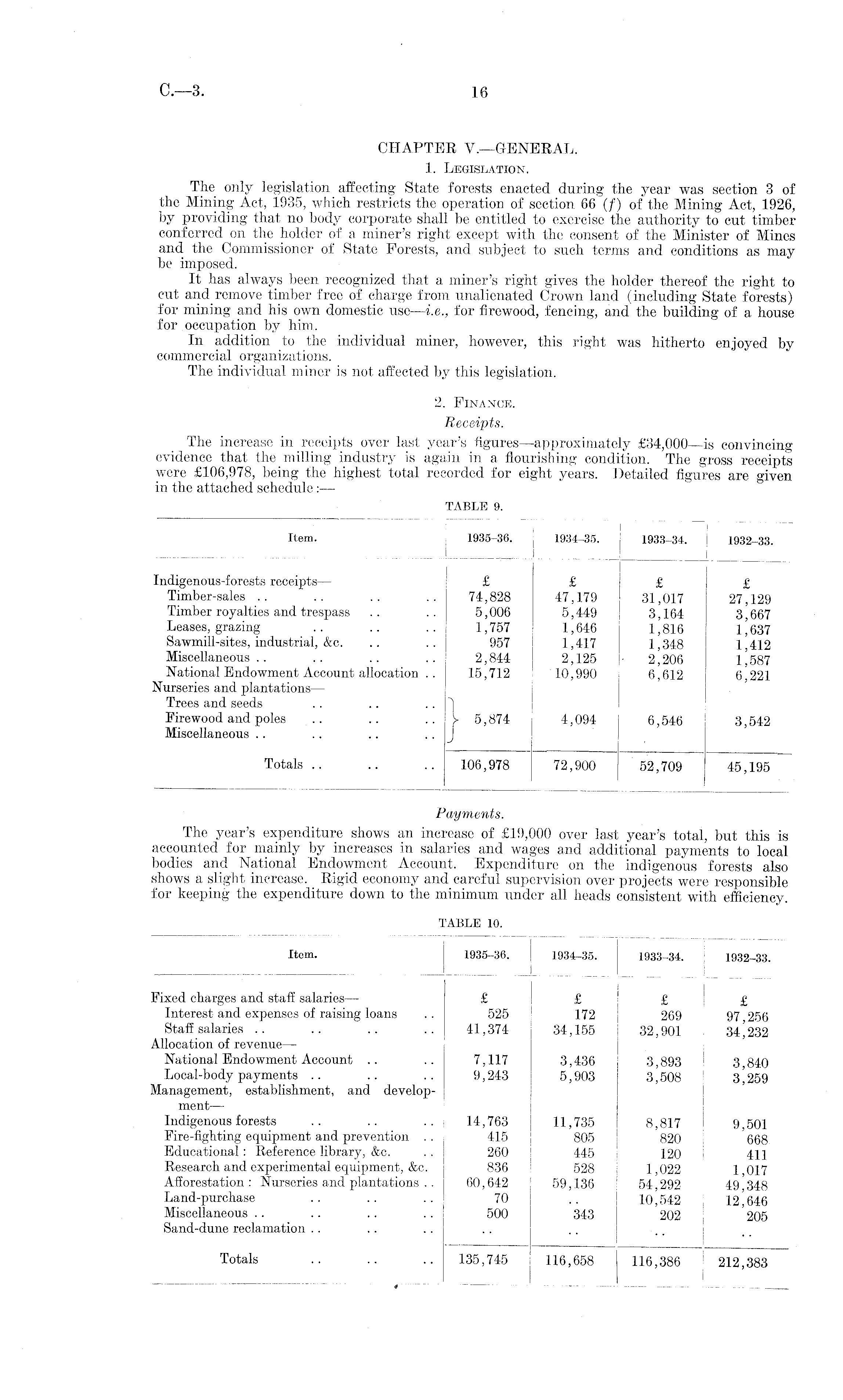 CHAPTER Y.—GENERAL. 1. Legislation. The only legislation affecting State forests enacted during the year was section 3 of the Mining Act, 1935, which restricts the operation of section 66 (/) of the Mining Act, 1926, by providing that no body corporate shall be entitled to exercise the authority to cut timber conferred on the holder of a miner's right except with the consent of the Minister of Mines and the Commissioner of State Forests, and subject to such terms and conditions as may be imposed. It has always been recognized that a miner's right gives the holder thereof the right to cut and remove timber free of charge from unalienated Crown land (including State forests) for mining and his own domestic use—i.e., for firewood, fencing, and the building of a house for occupation by him. In addition to the individual miner, however, this right was hitherto enjoyed by commercial organizations. The individual miner is not affected by this legislation. 2. Finance. Receipts. The increase in receipts over last year's figures—approximately £34,000 —is convincing evidence that the milling industry is again in a flourishing condition. The gross receipts were £106,978, being the highest total recorded for eight years. Detailed figures are given in the attached schedule:—