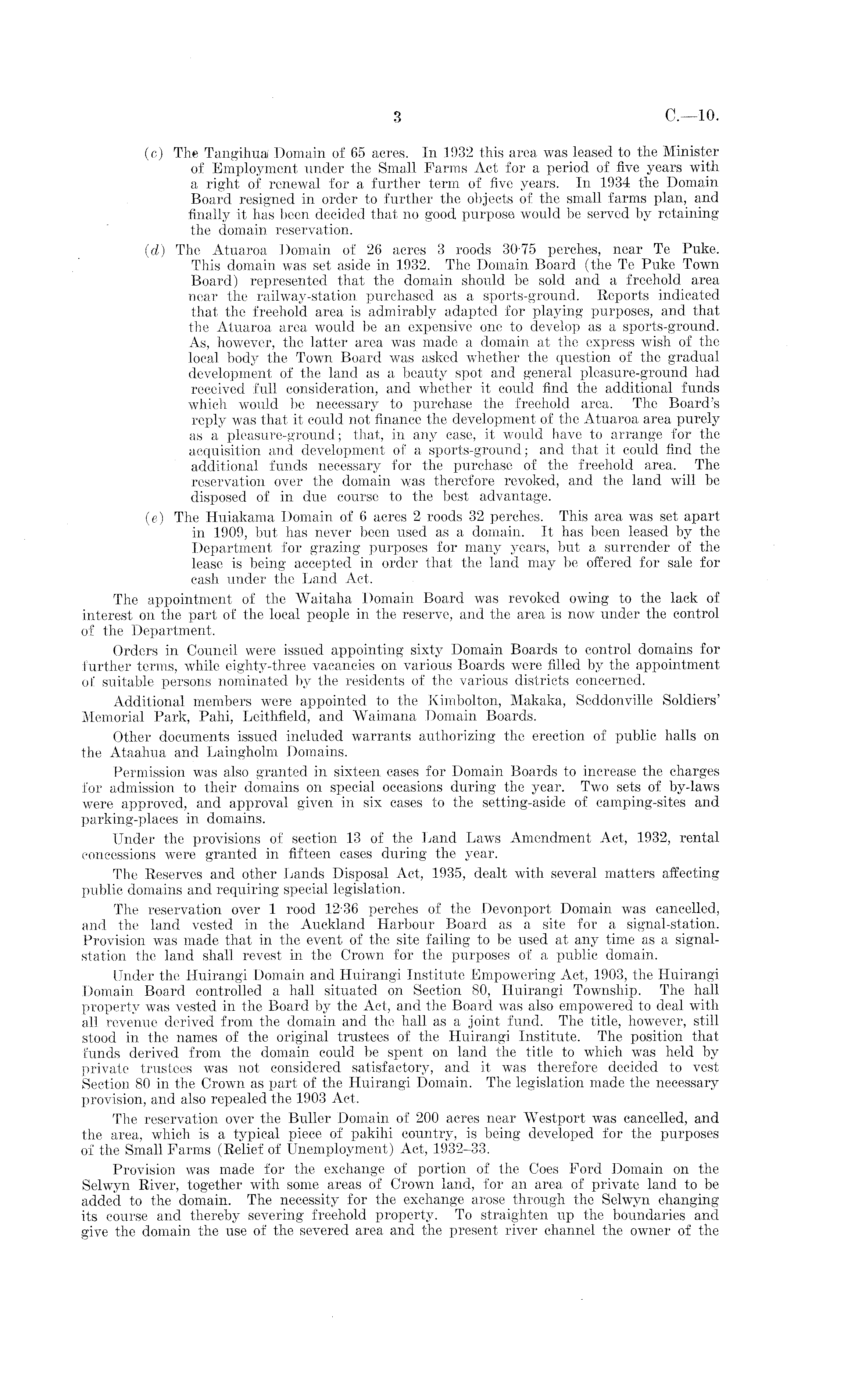 (c) The Tangihua; Domain of 65 acres. In 1932 this area was leased to the Minister of Employment under the Small Farms Act for a period of five years with a right of renewal for a further term of five years. In 1934 the Domain Board resigned in order to further the objects of the small farms plan, and finally it has been decided that no good purpose would be served by retaining the domain reservation. (d) The Atuaroa Domain of 26 acres 3 roods 3075 perches, near Te Puke. This domain was set aside in 1932. The Domain Board (the Te Puke Town Board) represented that the domain should be sold and a freehold area near the railway-station purchased as a sports-ground. Reports indicated that the freehold area is admirably adapted for playing purposes, and that the Atuaroa area would be an expensive one to develop as a sports-ground. As, however, the latter area was made a domain at the express wish of the local body the Town Board was asked whether the question of the gradual development of the land as a beauty spot and general pleasure-ground had received full consideration, and whether it could find the additional funds which would be necessary to purchase the freehold area. The Board's reply was that it could not finance the development of the Atuaroa area purely as a pleasure-ground; that, in any case, it would have to arrange for the acquisition and development of a sports-ground; and that it could find the additional funds necessary for the purchase of the freehold area. The reservation over the domain was therefore revoked, and the land will be disposed of in due course to the best advantage. (e) The Huiakama Domain of 6 acres 2 roods 32 perches. This area was set apart in 1909, but has never been used as a domain. It has been leased by the Department for grazing purposes for many years, but a surrender of the lease is being accepted in order that the land may be offered for sale for cash under the Land Act. The appointment of the Waitaha Domain Board was revoked owing to the lack of interest on the part of the local people in the reserve, and the area is now under the control of the Department. Orders in Council were issued appointing sixty Domain Boards to control domains for further terms, while eighty-three vacancies on various Boards were filled by the appointment of suitable persons nominated by the residents of the various districts concerned. Additional members were appointed to the Kimbolton, Makaka, Seddonville Soldiers' Memorial Park, Pahi, Leithfield, and Waimana Domain Boards. Other documents issued included warrants authorizing the erection of public halls on the Ataahua and Laingholm Domains. Permission was also granted in sixteen cases for Domain Boards to increase the charges for admission to their domains on special occasions during the year. Two sets of by-laws were approved, and approval given in six cases to the setting-aside of camping-sites and parking-places in domains. Under the provisions of section 13 of the Land Laws Amendment Act, 1932, rental concessions were granted in fifteen cases during the year. The Reserves and other Lands Disposal Act, 1935, dealt with several matters affecting public domains and requiring special legislation. The reservation over 1 rood 12-36 perches of the Devonport Domain was cancelled, and the land vested in the Auckland Harbour Board as a site for a signal-station. Provision was made that in the event of the site failing to be used at any time as a signalstation the land shall revest in the Crown for the purposes of a public domain. Under the Huirangi Domain and Huirangi Institute Empowering Act, 1903, the Huirangi Domain Board controlled a hall situated on Section 80, Huirangi Township. The hall property was vested in the Board by the Act, and the Board was also empowered to deal with all revenue derived from the domain and the hall as a joint fund. The title, however, still stood in the names of the original trustees of the Huirangi Institute. The position that funds derived from the domain could be spent on land the title to which was held by private trustees was not considered satisfactory, and it was therefore decided to vest Section 80 in the Crown as part of the Huirangi Domain. The legislation made the necessary provision, and also repealed the 1903 Act. The reservation over the Buller Domain of 200 acres near Westport was cancelled, and the area, which is a typical piece of pakihi country, is being developed for the purposes of the Small Farms (Relief of Unemployment) Act, 1932-33. Provision was made for the exchange of portion of the Coes Ford Domain on the Selwyn River, together with some areas of Crown land, for an area of private land to be added to the domain. The necessity for the exchange arose through the Selwyn changing its course and thereby severing freehold property. To straighten up the boundaries and give the domain the use of the severed area and the present river channel the owner of the