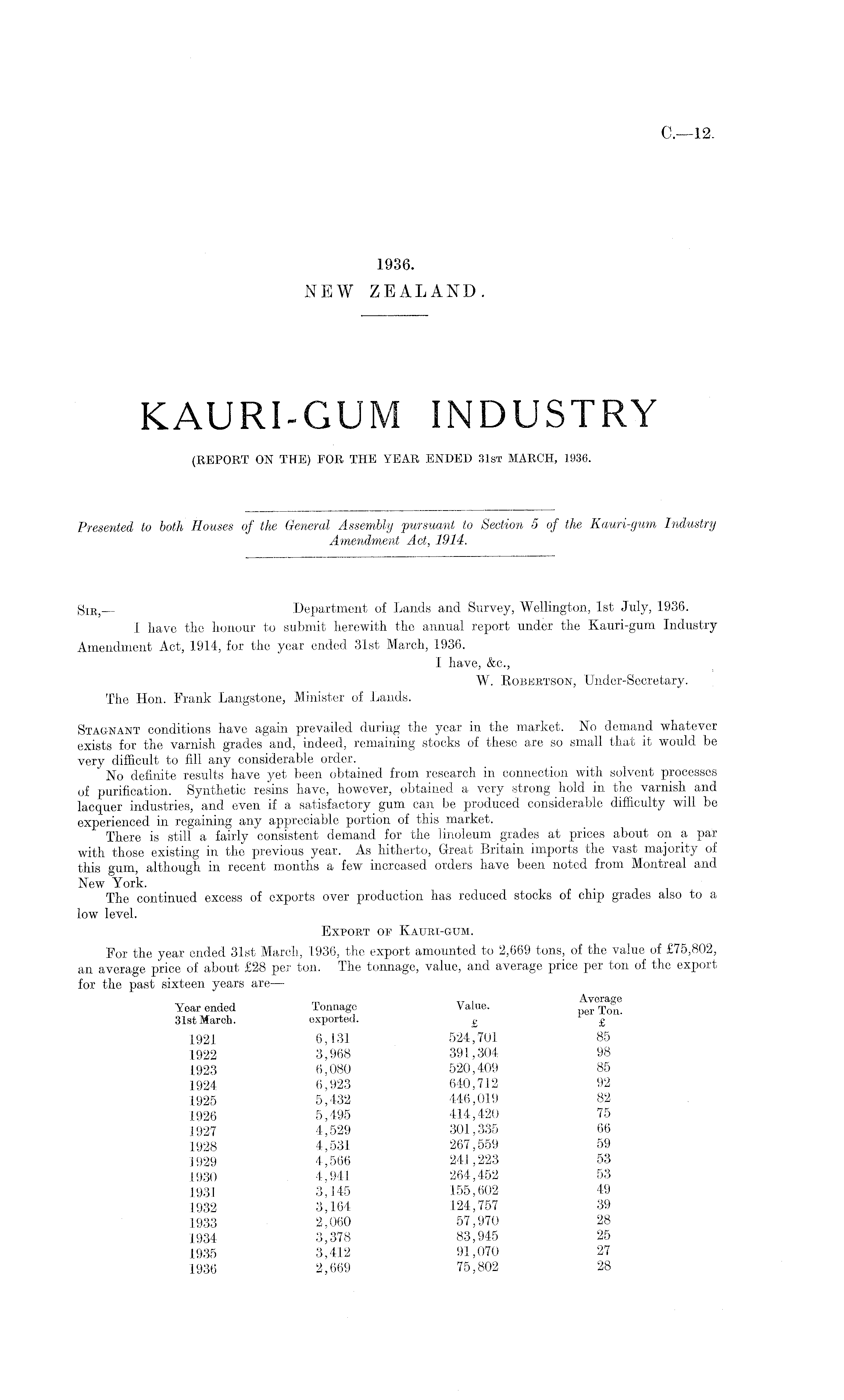 S IR Department of Lands and Survey, Wellington, Ist July, 1936. I have the honour to submit herewith the annual report under the Kauri-gum Industry Amendment Act, 1914, for the year ended 31st March, 1936. I have, &c., W. Robertson, Under-Secretary. The Hon. Frank Langstone, Minister of Lands. Stagnant conditions have again prevailed during the year in the market. No demand whatever exists for the varnish grades and, indeed, remaining stocks of these are so small that it would be very difficult to fill any considerable order. No definite results have yet been obtained from research in connection with solvent processes of purification. Synthetic resins have, however, obtained a very strong hold in the varnish and lacquer industries, and even if a satisfactory gum can be produced considerable difficulty will be experienced in regaining any appreciable portion of this market. There is still a fairly consistent demand for the linoleum grades at prices about on a par with those pasting in the previous year. As hitherto, Great Britain imports the vast majority of this gum, although in recent months a few increased orders have been noted from Montreal and New York. The continued excess of exports over production has reduced stocks of chip grades also to a low level. Export of Kauri-gum. For the year ended 31st March, 1936, the export amounted to 2,669 tons, of the value of £75,802, an average price of about £28 per ton. The tonnage, value, and average price per ton of the export for the past sixteen years are — _ , r , Average Year ended Tonnage Value. per Ton. 31st March. exported. £ £ 1921 6,1.31 524,701 85 1922 3,968 391,304 98 1923 6,080 520,409 85 1924 6,923 640,712 92 1925 5,432 446,019 82 1926 5,495 414,420 75 J 927 4,529 301,335 66 1928 4,531 267,559 59 1929 4,566 241,223 53 1930 4,941 264,452 53 1931 3,145 155,602 49 1932 3,164 124,757 39 1933 2,060 57,970 28 1934 3,378 83,945 25 1935 3,412 91,070 27 1936 2,669 75,802 28