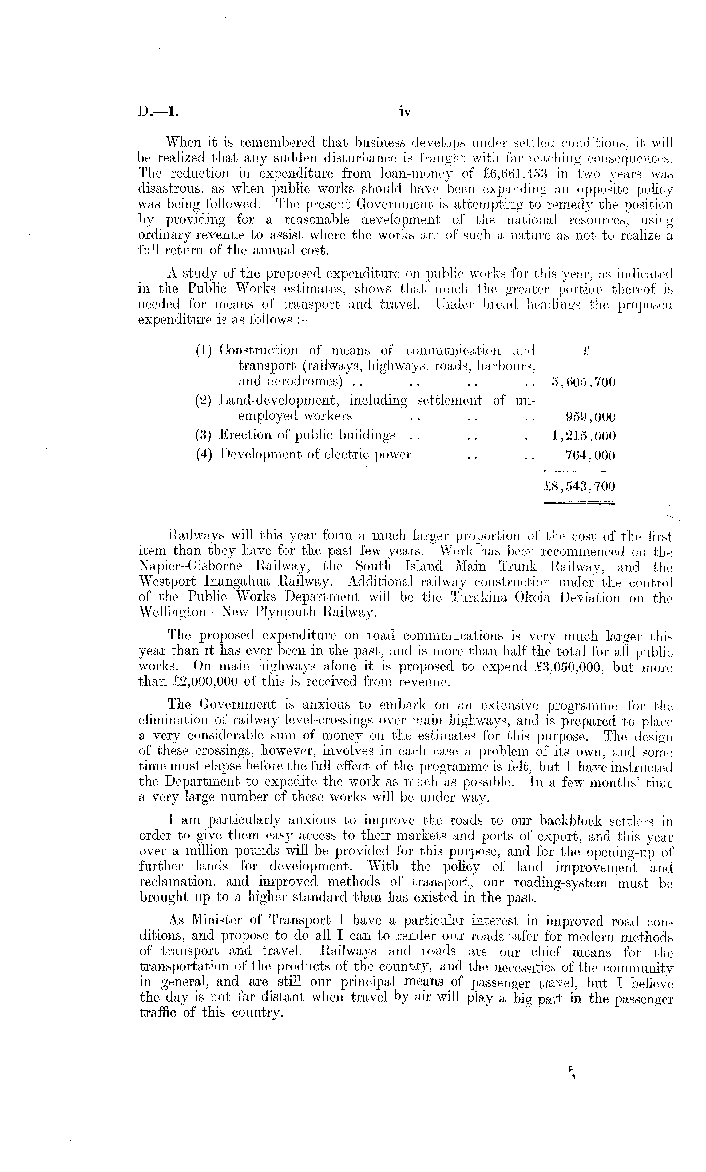 When it is remembered that business develops under settled conditions, it will be realized that any sudden disturbance is fraught with far-reaching consequences. The reduction in expenditure from loan-money of £6,661,453 in two years was disastrous, as when public works should have been expanding an opposite policy was being followed. The present Government is attempting to remedy the position by providing for a reasonable development of the national resources, using ordinary revenue to assist where the works are of such a nature as not to realize a full return of the annual cost. A study of the proposed expenditure on public works for this year, as indicated in the Public Works estimates, shows that much the greater portion thereof is needed for means of transport and travel. Under broad headings the proposed expenditure is as follows : — (1) Construction of means of communication and £ transport (railways, highways, roads, harbours, and aerodromes) .. .. .. 5,605,700 (2) Land-development, including settlement of unemployed workers . . . . . . 959,000 (3) Erection of public buildings .. .. .. 1,215,000 (4) Development of electric power .. .. 764,000 £8,543,700 Railways will this year form a much larger proportion of the cost of the first item than they have for the past few years. Work has been recommenced on the Napier-Grisborne Railway, the South Island Main Trunk Railway, and the Westport-Inangahua Railway. Additional railway construction under the control of the Public Works Department will be the Turakina-Okoia Deviation on the Wellington - New Plymouth Railway. The proposed expenditure on road communications is very much larger this year than it has ever been in the j>ast, and is more than half the total for all public works. On main highways alone it is proposed to expend £3,050,000, but more than £2,000,000 of this is received from revenue. The Government is anxious to embark on an extensive programme for the elimination of railway level-crossings over main highways, and is prepared to place a very considerable sum of money on the estimates for this purpose. The design of these crossings, however, involves in each case a problem of its own, and some time must elapse before the full effect of the programme is felt, but I have instructed the Department to expedite the work as much as possible. In a few months' time a very large number of these works will be under way. I am particularly anxious to improve the roads to our backblock settlers in order to give them easy access to their markets and ports of export, and this year over a million pounds will be provided for this purpose, and for the opening-up of further lands for development. With the policy of land improvement and reclamation, and improved methods of transport, our roading-system must be brought up to a higher standard than has existed in the past. As Minister of Transport I have a particular interest in improved road conditions, and propose to do all I can to render our roads lafer for modern methods of transport and travel. Railways and roads are our chief means for the transportation of the products of the country, and the necessities of the community in general, and are still our principal means of passenger tiavel, but I believe the day is not far distant when travel by air will play a big part in the passenger traffic of this country.