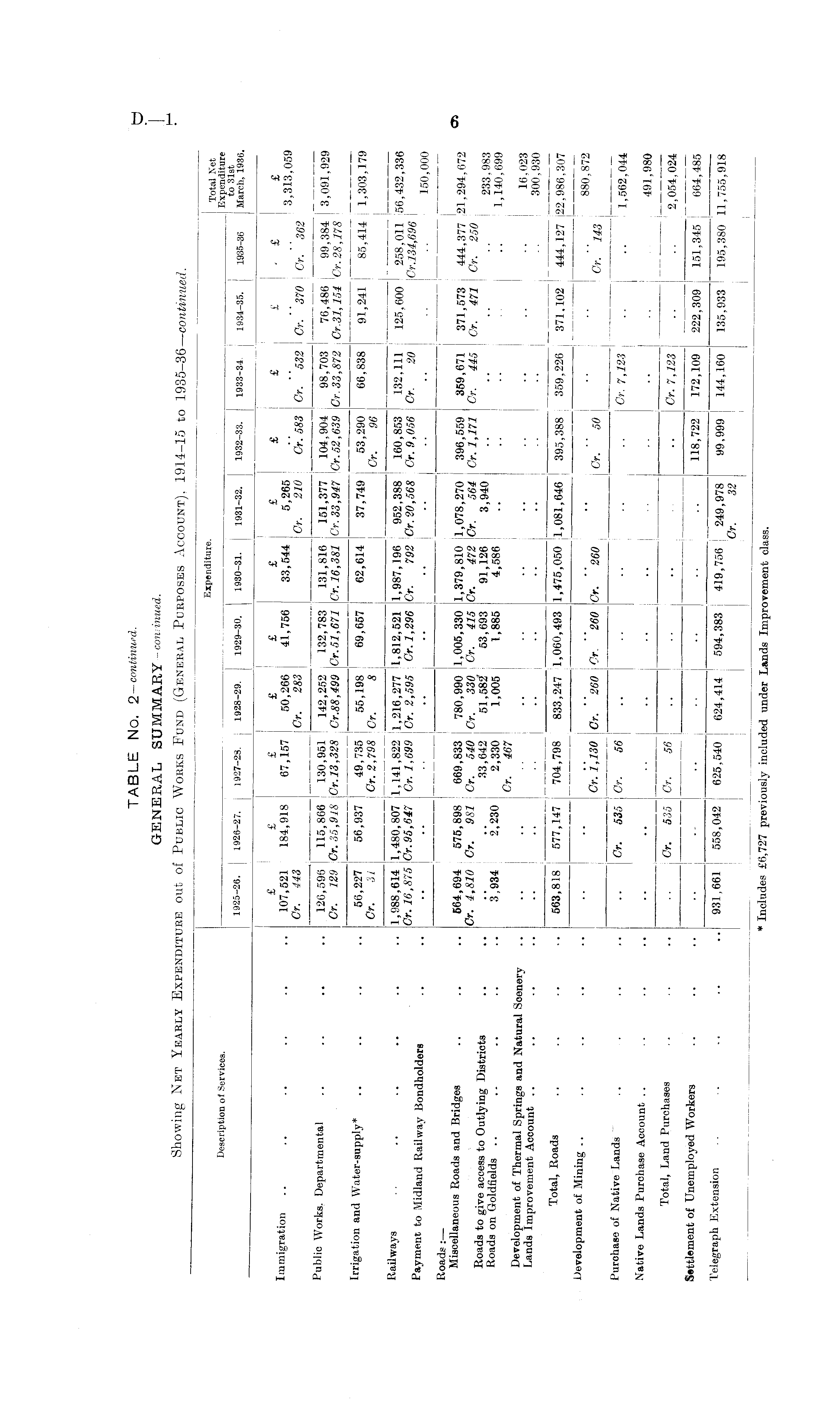 TABLE No. 2— continued. GENERAL SUMMARY —continued. Showing Net Yearly Expenditure out of Public Works Fund (General Purposes Account), 1914-15 to 1935-36—continued.