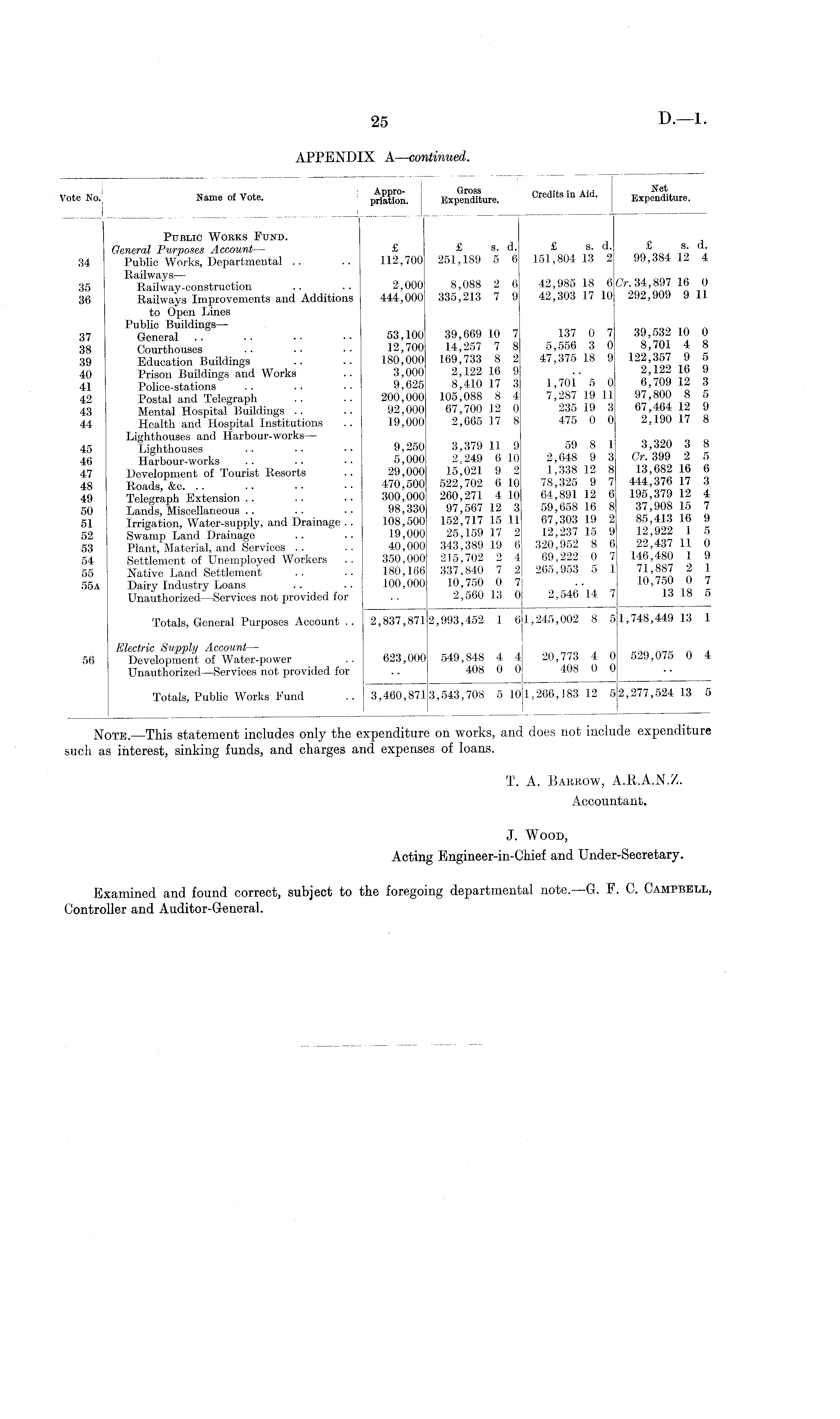 T. A. Barrow, A.R.A.N.Z. Accountant. J. Wood, Acting Engineer-in-Chief and Under-Secretary. Examined and found correct, subject to the foregoing departmental note.—G. F. C. Campbell, Controller and Auditor-General.