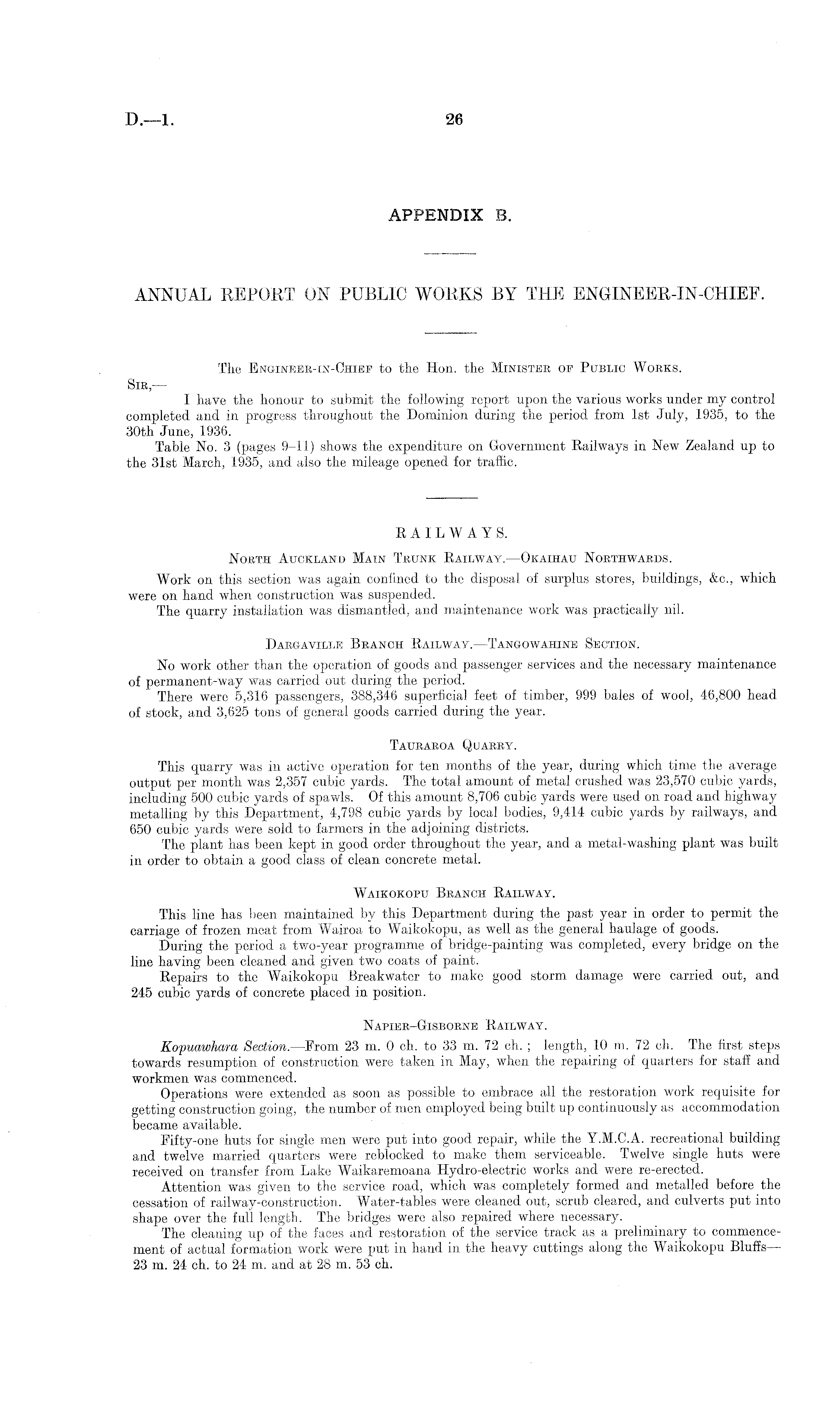 The Engineer-in-Chief to the Hon. the Minister op Public Works. Sir, — I have the honour to submit the following report upon the various works under my control completed and in progress throughout the Dominion during the period from Ist July, 1935, to the 30th June, 1936. Table No. 3 (pages 9-11) shows the expenditure on Government Railways in New Zealand up to the 31st March, 1935, and also the mileage opened for traffic.