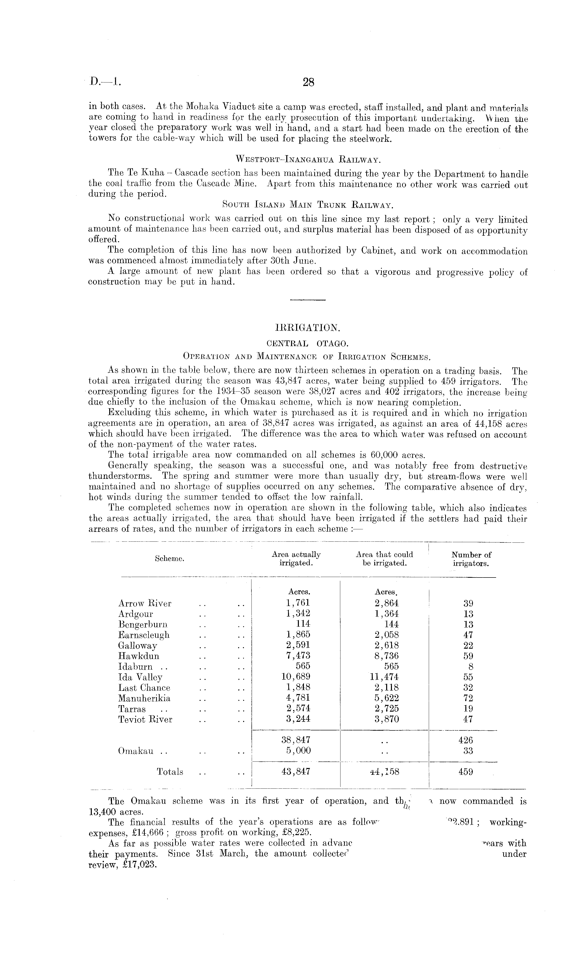 IRRIGATION. CENTRAL OTAGO. Operation and Maintenance of Irrigation Schemes. As shown in the table below, there are now thirteen schemes in operation on a trading basis. The total area irrigated during the season was 43,847 acres, water being supplied to 4.59 irrigators. The corresponding figures for the 1934-35 season were 38,027 acres and 402 irrigators, the increase being due chiefly to the inclusion of the Omakau scheme, which is now nearing completion. Excluding this scheme, in which water is purchased as it is required and in which no irrigation agreements are in operation, an area of 38,847 acres was irrigated, as against an area of 44,158 acres which should have been irrigated. The difference was the area to which water was refused on account of the non-payment of the water rates. The total irrigable area now commanded on all schemes is 60,000 acres. Generally speaking, the season was a successful one, and was notably free from destructive thunderstorms. The spring and summer were more than usually dry, but stream-flows were well maintained and no shortage of supplies occurred on any schemes. The comparative absence of dry, hot winds during the summer tended to offset the low rainfall. The completed schemes now in operation are shown in the following table, which also indicates the areas actually irrigated, the area that should have been irrigated if the settlers had paid their arrears of rates, and the number of irrigators in each scheme : —