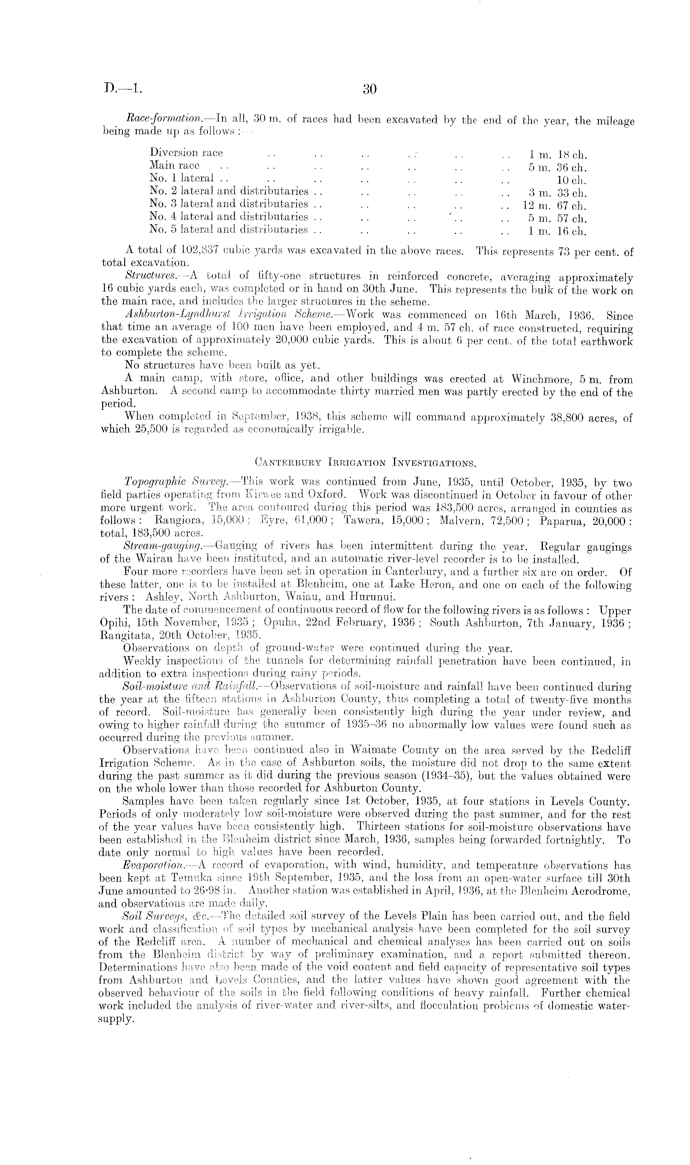 Race-formation. In all, 30 m. of races had been excavated by the end of the year, the mileage being made up as follows : — Diversion race . . .. .. . y .. . , Im. 18 ch. Main race . . . . .. . , .. .. . . sm. 36 ch. No. 1 lateral .. . . . . . . , . . . . . 10 ch. No. 2 lateral and distributaries . . . . . . . . . . 3m. 33 ch. No. 3 lateral and distributaries . . . . . . . . 12 m. 67 ch. No. 4 lateral and distributaries . . . . .. . .. 5 m. 57 ch. No. 5 lateral and distributaries .. . . . . . . .. 1 m. 16 ch. A total of 102,837 cubic yards was excavated in the above races. This represents 73 per cent, of total excavation. Structures. —A* total of fifty-one structures in reinforced concrete, averaging approximately 16 cubic yards each, was completed or in hand on 30th June. This represents the bulk of the work on the main race, and includes the larger structures in the scheme. Ashburton-Lyndhurst Irrigation Scheme. —Work was commenced on 16th March, 1936. Since that time an average of 100 men have been employed, and 4 m. 57 ch. of race constructed, requiring the excavation of approximately 20,000 cubic yards. This is about 6 per cent, of the total earthwork to complete the scheme. No structures have been built as yet. A main camp, with store, office, and other buildings was erected at Winchmore, sm. from Ashburton. A second camp to accommodate thirty married men was partly erected by the end of the period. When completed in September, 1938, this scheme will command approximately 38,800 acres, of which 25,500 is regarded as economically irrigable. Canterbury Irrigation Investigations. Topographic Survey.—This work was continued from June, 1935, until October, 1935, by two field parties operating from Kirwee and Oxford. Work was discontinued in October in favour of other more urgent work. The area contoured during this period was 183,500 acres, arranged in counties as follows : Rangiora, 15,000 ; Eyre, 61,000 ; Tawera, 15,000 ; Malvern, 72,500 ; Paparua, 20,000 : total, 183,500 acres. Stream-gauging. —Gauging of rivers has been intermittent during the year. Regular gaugings of the Wairau have been instituted, and an automatic river-level recorder is to be installed. Four more recorders have been set in operation in Canterbury, and a further six are on order. Of these latter, one is to be installed at Blenheim, one at Lake Heron, and one on each of the following rivers : Ashley, North Ashburton, Waiau, and Hurunui. The date of commencement of continuous record of flow for the following rivers is as follows : Upper Opihi, 15th November, 1935 ; Opuha, 22nd February, 1936 ; South Ashburton, 7th January, 1936 ; Rangitata, 20th October, 1935. Observations on depth of ground-water were continued during the year. Weekly inspections of the tunnels for determining rainfall penetration have been continued, in addition to extra inspections during rainy periods. Soil-moisture and Rainfall. —Observations of soil-moisture and rainfall have been continued during the year at the fifteen stations in Ashburton County, thus completing a total of twenty-five months of record. Soil-moisture has generally been consistently high during the year under review, and owing to higher rainfall during the summer of 1935-36 no abnormally low values were found such as occurred during the previous summer. Observations have been continued also in Waimate County on the area served by the Redcliff Irrigation Scheme. As in the case of Ashburton soils, the moisture did not drop to the same extent during the past summer as it did during the previous season (1934-35), but the values obtained were on the whole lower than those recorded for Ashburton County. Samples have been taken regularly since Ist October, 1935, at four stations in Levels County. Periods of only moderately low soil-moisture were observed during the past summer, and for the rest of the year values have been consistently high. Thirteen stations for soil-moisture observations have been established in the Blenheim district since March, 1936, samples being forwarded fortnightly. To date only normal to high values have been recorded. Evaporation. —A record of evaporation, with wind, humidity, and temperature observations has been kept at Ternuka since 19th September, 1935, and the loss from an open-water surface till 30th June amounted to 26-98 in. Another station was established in April, 1936, at the Blenheim Aerodrome, and observations are made daily. Soil Surveys, c6c. —The detailed soil survey of the Levels Plain has been carried out, and the field work and classification of soil types by mechanical analysis have been completed for the soil survey of the Redcliff area. A number of mechanical and chemical analyses has been carried out on soils from the Blenheim district by way of preliminary examination, and a report submitted thereon. Determinations have also been made of the void content and field capacity of representative soil types from Ashburton and Levels Counties, and the latter values have shown good agreement with the observed behaviour of the soils in the field following conditions of heavy rainfall. Further chemical work included the analysis of river-water and river-silts, and flocculation problems of domestic watersupply.