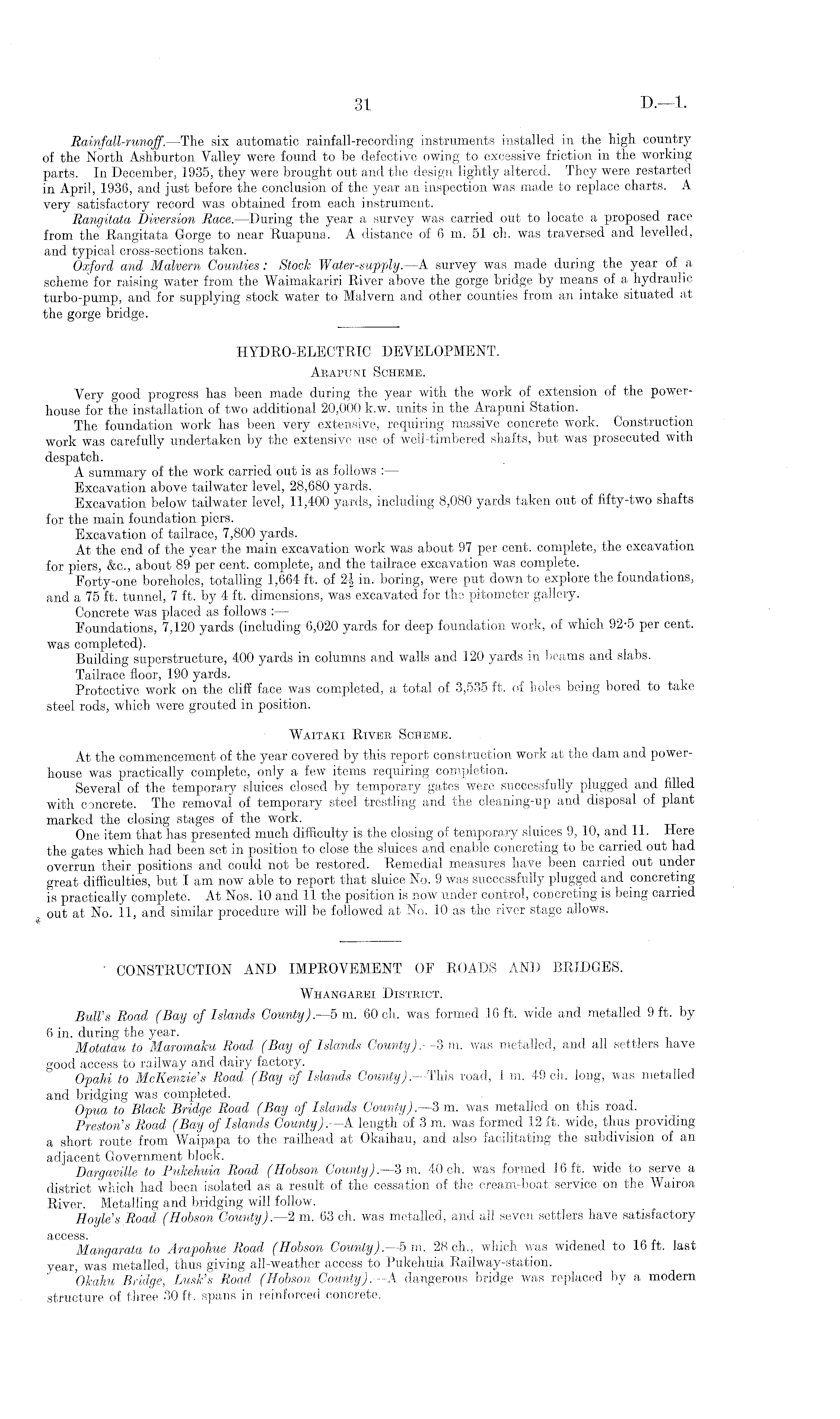 Rainfall-runoff. —The six automatic rainfall-recording instruments installed in the high country of the North Ashburton Valley were found to be defective owing to excessive friction in the working parts. In December, 1935, they were brought out and the design lightly altered. They were restarted in April, 1936, and just before the conclusion of the year an inspection was made to replace charts. A very satisfactory record was obtained from each instrument. Rangitata Diversion Race. —During the year a survey was carried out to locate a proposed race from the Rangitata Gorge to near Ruapuna. A distance of 6m. 51 ch. was traversed and levelled, and typical cross-sections taken. Oxford and Malvern Counties: Stoch Water-supply.—A survey was made during the year of a scheme for raising water from the Waimakariri River above the gorge bridge by means of a hydraulic turbo-pump, and for supplying stock water to Malvern and other connties from an intake situated at the gorge bridge.
