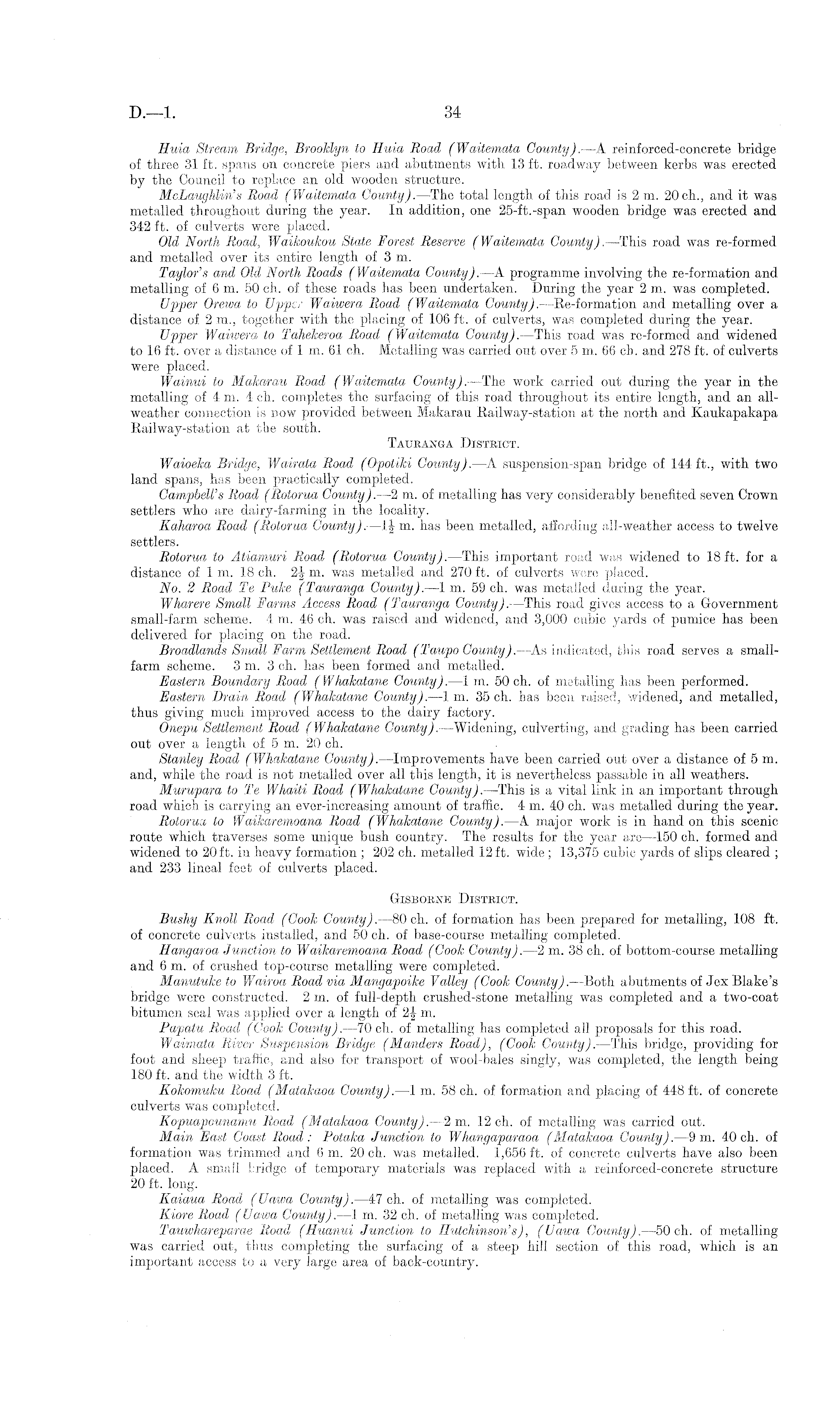Huia Stream Bridge, Brooklyn to Huia Road (Waitemata County). —A reinforced-concrete bridge of three 31 ft. spans on concrete piers and abutments with 13 ft. roadway between kerbs was erected by the Council to replace an old wooden structure. McLaughlin's Road (Waitemata County). —The total length of this road is 2m. 20ch., and it was metalled throughout during the year. In addition, one 25-ft.-span wooden bridge was erected and 342 ft. of culverts were placed. Old North Road, Waikoukou State Forest Reserve (Waitemata County).—This road was re-formed and metalled over its entire length of 3 m. Taylor's and Old North Roads (Waitemata County). —A programme involving the re-formation and metalling of 6m. 50 ch. of these roads has been undertaken. During the year 2m. was completed. Upper Orewa to Upper Waiwera Road (Waitemata County).—Re-formation and metalling over a distance of 2 m., together with the placing of 106 ft. of culverts, was completed during the year. Upper Waiwera to Tahekeroa Road (Waitemata County).—This road was re-formed and widened to 16 ft. over a distance of Im. 61 ch. Metalling was carried out over sm. 66 ch. and 278 ft. of culverts were placed. Wainui to Makarau Road (Waitemata County).—The work carried out during the year in the metalling of 4 m. 4 ch. completes the surfacing of this road throughout its entire length, and an allweather connection is now provided between Makarau Railway-station at the north and Kaukapakapa Railway-station at the south. Tauranga District. Waioeka Bridge, Wairata Road (Opotiki County).—A suspension-span bridge of 144 ft., with two land spans, has been practically completed. Campbell's Road (Rotorua County). —2 m. of metalling has very considerably benefited seven Crown settlers who are dairy-farming in the locality. Kaharoa Road (Rotorua County). —1 im. has been metalled, affording all-weather access to twelve settlers. Rotorua to Atiamuri Road (Rotorua County). —This important road was widened to 18 ft. for a distance of Im. 18 ch. 2§ m. was metalled and 270 ft. of culverts were placed. No. 2 Road Te Puke (Tauranga County). —1 m. 59 ch. was metalled during.the year. Wharere Small Farms Access Road (Tauranga County).—This road gives access to a Government small-farm scheme. 4m. 46 ch. was raised and widened, and 3,000 cubic yards of pumice has been delivered for placing on the road. Broadlands Small Farm Settlement Road (Taupo County).—As indicated, this road serves a smallfarm scheme. 3m. 3 ch. has been formed and metalled. Eastern Boundary Road ( Whakatane County).—l m. 50 ch. of metalling has been performed. Eastern Drain Road (Whakatane County). —1 m. 35 ch. has been raised, widened, and metalled, thus giving much improved access to the dairy factory. Onepu Settlement Road (Whakatane County). —Widening, culverting, and grading has been carried out over a length of 5 m. 20 ch. Stanley Road (Whakatane County). —Improvements have been carried out over a distance of 5 m. and, while the road is not metalled over all this length, it is nevertheless passable in all weathers. Murupara to Te Whaiti Road (Whakatane County). —This is a vital link in an important through road which is carrying an ever-increasing amount of traffic. 4m. 40 ch. was metalled during the year. Rotorua to Waikaremoana Road (Whakatane County).—A major work is in hand on this scenic route which traverses some unique bush country. The results for the year are —150 ch. formed and widened to 20 ft. in heavy formation ; 202 ch. metalled 12 ft. wide ; 13,375 cubic yards of slips cleared ; and 233 lineal feet of culverts placed. Gisborne District. Bushy Knoll Road (Cook County).—80 ch. of formation has been prepared for metalling, 108 ft. of concrete culverts installed, and 50 ch. of base-course metalling completed. Hangaroa Junction to Waikaremoana Road (Cook County). —2 m. 38 ch. of bottom-course metalling and 6 m. of crushed top-course metalling were completed. Manutuke to Wairoa Road via Mangapoike Valley (Cook County). —Both abutments of Jex Blake's bridge were constructed. 2m. of full-depth crushed-stone metalling was completed and a two-coat bitumen seal was applied over a length of 2| m. Papatu Road (Cook Coxinty)7o ch. of metalling has completed all proposals for this road. Waimata River Suspension Bridge (Manders Road), (Cook County). —This bridge, providing for foot and sheep traffic, and also for transport of wool-bales singly, was completed, the length being 180 ft. and the width 3 ft. Kokomuku Road (Matakaoa County).—1 m. 58 ch. of formation and placing of 448 ft. of concrete culverts was completed. Kopuapounamu Road (Matakaoa County).—2 m. 12 ch. of metalling was carried out. Main East Coast Road: Potaka Junction to Whangaparaoa (Matakaoa County). —9 m. 40 ch. of formation was trimmed and 6m. 20 ch. was metalled. 1,656 ft. of concrete culverts have also been placed. A small bridge of temporary materials was replaced with a reinforced-concrete structure 20 ft. long. Kaiaua Road (Uawa County). —47 ch. of metalling was completed. Kiore Road (Uawa County). —1 m. 32 ch. of metalling was completed. T auwhareparae Road (Huanui Junction to Hutchinson's), (Uawa County). —50 ch. of metalling was carried out, thus completing the surfacing of a steep hill section of this road, which is an important access to a very large area of back-country.