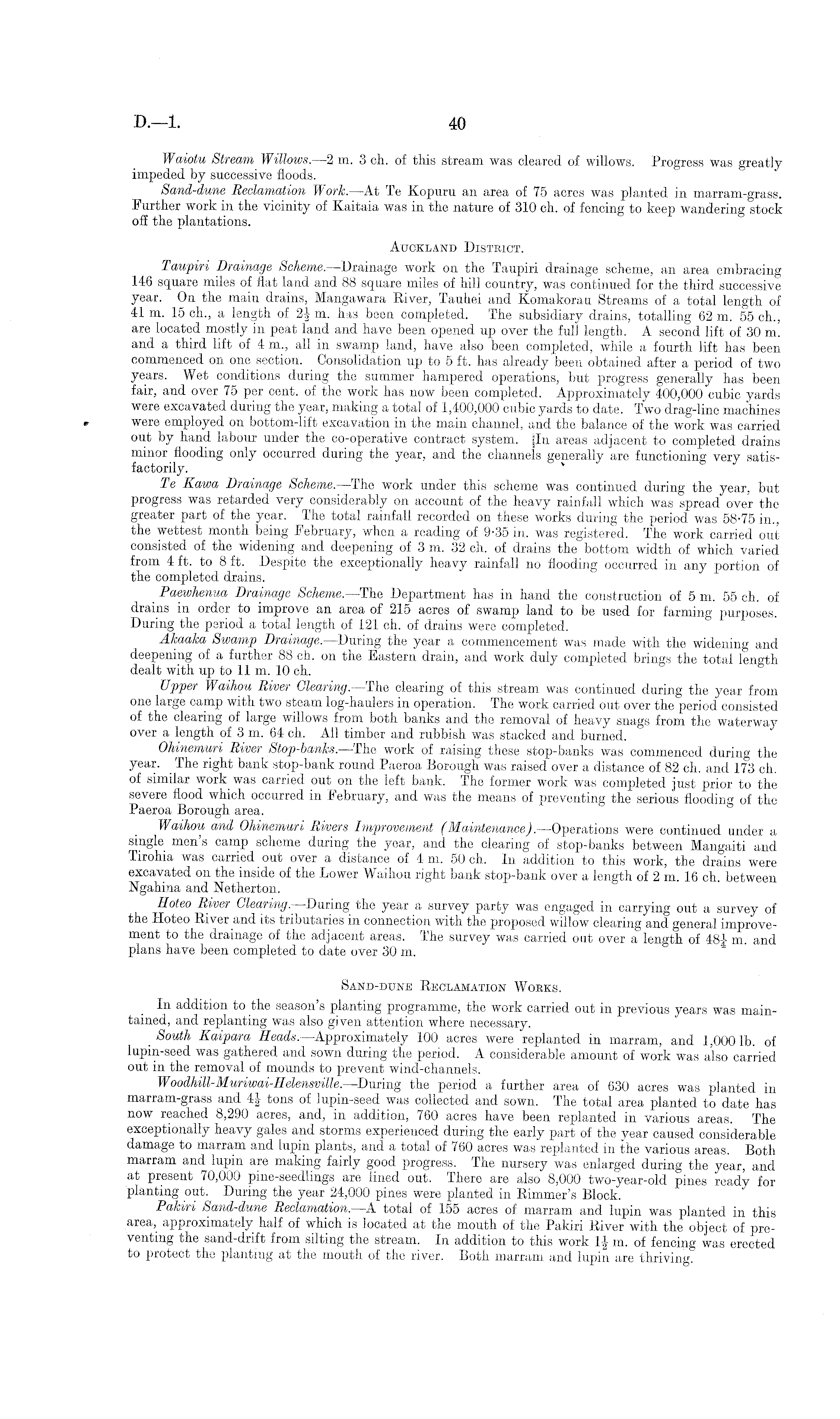 Waiotu Stream Willows. —2 m. 3 oh. of this stream was cleared of willows. Progress was greatly impeded by successive floods. Sand-dune Reclamation Work. —At Te Kopuru an area of 75 acres was planted in marram-grass. Further work in the vicinity of Kaitaia was in the nature of 310 ch. of fencing to keep wandering stock off the plantations. Auckland District. Taupiri Drainage Scheme. —Drainage work on the Taupiri drainage scheme, an area embracing 146 square miles of flat land and 88 square miles of hill country, was continued for the third successive year. On the main drains, Mangawara River, Tauhei and Komakorau Streams of a total length of 41 m. 15 ch., a length of 2| m. has been completed. The subsidiary drains, totalling 62 m. 55 ch., are located mostly in peat land and have been opened up over the full length. A second lift of 30 m. and a third lift of 4 m., all in swamp land, have also been completed, while a fourth lift has been commenced on one section. Consolidation up to 5 ft. has already been obtained after a period of two years. Wet conditions during the summer hampered operations, but progress generally has been fair, and over 75 per cent, of the work has now been completed. Approximately 400,000 cubic yards were excavated during the year, making a total of 1,400,000 cubic yards to date. Two drag-line machines were employed on bottom-lift excavation in the main channel, and the balance of the work was carried out by hand labour under the co-operative contract system. (In areas adjacent to completed drains minor flooding only occurred during the year, and the channels generally are functioning very satisfactorily. Te Kawa Drainage Scheme.—The work under this scheme was continued during the year, but progress was retarded very considerably on account of the heavy rainfall which was spread over the greater part of the year. The total rainfall recorded on these works during the period was 58-75 in., the wettest month being February, when a.reading of 9-35 in. was registered. The work carried out consisted of the widening and deepening of 3 m. 32 ch. of drains the bottom width of which varied from 4 ft. to 8 ft. Despite the exceptionally heavy rainfall no flooding occurred in any portion of the completed drains. Paewhenua Drainage Scheme.—The Department has in hand the construction of 5 m. 55 ch. of drains in order to improve an area of 215 acres of swamp land to be used for farming purposes. During the period a total length of 121 ch. of drains were completed. Akaaka Swamp Drainage. —During the year a commencement was made with the widening and deepening of a further 88 ch. on the Eastern drain, and work duly completed brings the total length dealt with up to 11 m. 10 ch. Upper Waihou River Clearing.—'The clearing of this stream was continued during the year from one large camp with two steam log-haulers in operation. The work carried out over the period consisted of the clearing of large willows from both banks and the removal of heavy snags from the waterway over a length of 3m. 64 ch. All timber and rubbish was stacked and burned. Ohinemuri River Stop-banks.—The work of raising these stop-banks was commenced during the year. The right bank stop-bank round Paeroa Borough was raised over a distance of 82 ch. and 173 ch. of similar work was carried out on the left bank. The former work was completed just prior to the severe flood which occurred in February, and was the means of preventing the serious flooding of the Paeroa Borough area. Waihou and Ohinemuri Rivers Improvement (Maintenance). —Operations were continued under a single men's camp scheme during the year, and the clearing of stop-banks between Mangaiti and Tirohia was carried out over a distance of 4 ni. 50 ch. In addition to this work, the drains were excavated on the inside of the Lower Waihou right bank stop-bank over a length of 2 m. 16 ch. between Ngahina and Netherton. Hoteo River Clearing. During the year a survey party was engaged in carrying out a survey of the Hoteo River and its tributaries in connection with the proposed willow clearing and general improvement to the drainage of the adjacent areas. The survey was carried out over a length of 48J m. and plans have been completed to date over 30 m. Sand-dune Reclamation Woeks. In addition to the season's planting programme, the work carried out in previous years was maintained, and replanting was also given attention where necessary. South Kaipara Heads.—Approximately 100 acres were replanted in marram, and 1,000 lb. of lupin-seed was gathered and sown during the period. A considerable amount of work was also carried out in the removal of mounds to prevent wind-channels. Woodhill-Muriwai-Helensville.—During the period a further area of 630 acres was planted in marram-grass and 4J tons of lupin-seed was collected and sown. The total area planted to date has now reached 8,290 acres, and, in addition, 760 acres have been replanted in various areas. The exceptionally heavy gales and storms experienced during the early part of the year caused considerable damage to marram and lupin plants, and a total of 760 acres was replanted in the various areas. Both marram and lupin are making fairly good progress. The nursery was enlarged during the year, and at present 70,000 pine-seedlings are lined out. There are also 8,000 two-year-old pines ready for planting out. During the year 24,000 pines were planted in Rimmer's Block. Pakiri Sand-dune Reclamation.—A total of 155 acres of marram and lupin was planted in this area, approximately half of which is located at the mouth of the Pakiri River with the object of preventing the sand-drift from silting the stream. In addition to this work 1J m. of fencing was erected to protect the planting at the mouth of the river. Both marram and lupin are thriving.