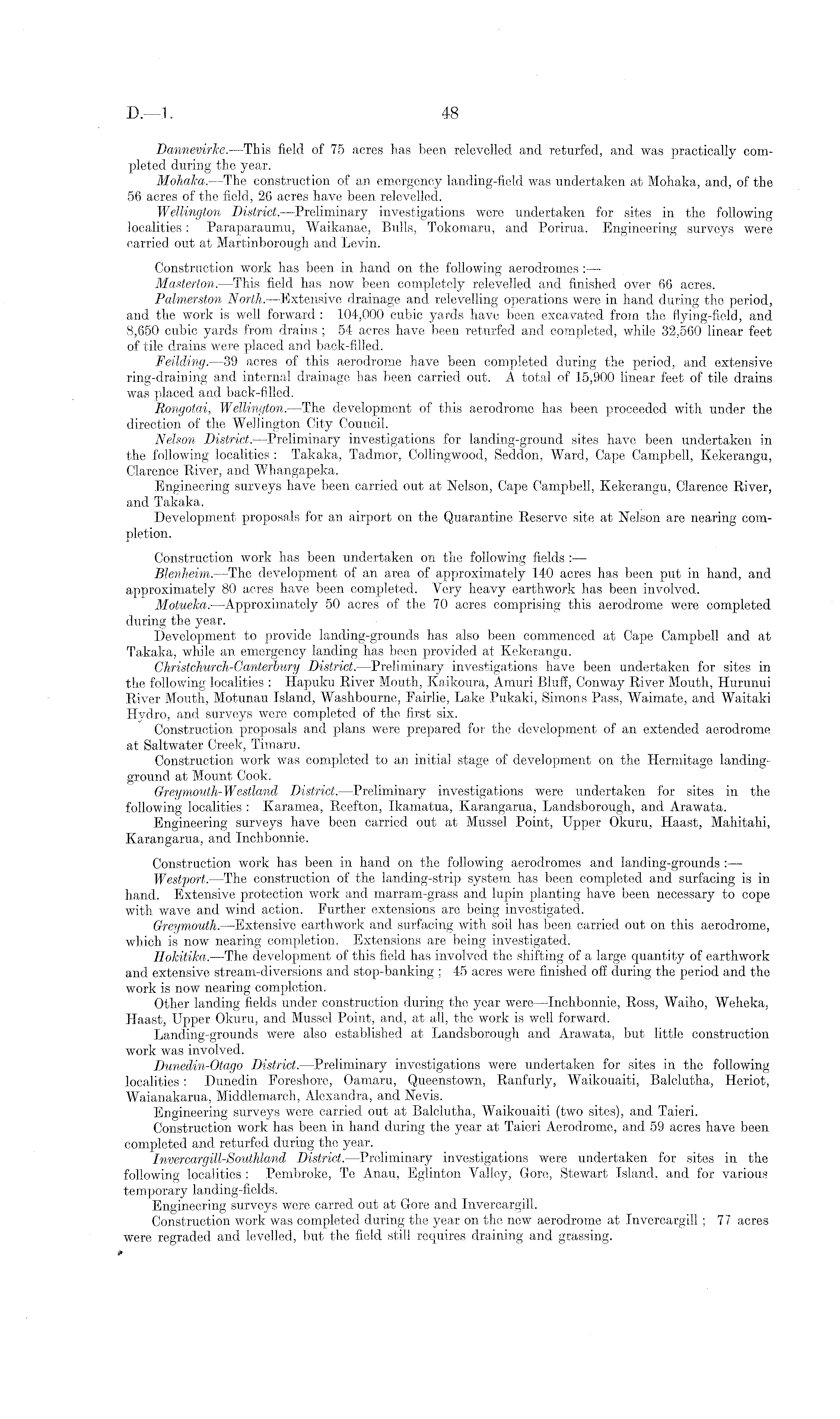 DannevirJce. —This field of 75 acres has been relevelled and returfed, and was practically completed during the year. Mohaka. —The construction of an emergency landing-field was undertaken at Mohaka, and, of the 56 acres of the field, 26 acres have been relevelled. Wellington District. —Preliminary investigations were undertaken for sites in the following localities: Paraparaumu, Waikanae, Bulls, Tokomaru, and Porirua. Engineering surveys were carried out at Martinborough and Levin. Construction work has been in hand on the following aerodromes : — Masterton. —This field has now been completely relevelled and finished over 66 acres. Palmerston North. —Extensive drainage and relevelling operations were in hand during the period, and the work is well forward : 104,000 cubic yards have been excavated from the flying-field, and 8,650 cubic yards from drains ; 54 acres have been returfed. and completed, while 32,560 linear feet of tile drains were placed and back-filled. Feilding. —39 acres of this aerodrome have been completed during the period, and extensive ring-draining and internal drainage has been carried out. A total of 15,900 linear feet of tile drains was placed and back-filled. Rongotai, Wellington. —The development of this aerodrome has been proceeded with under the direction of the Wellington City Council. Nelson District. —Preliminary investigations for landing-ground sites have been undertaken in the following localities : Takaka, Tadmor, Collingwood, Seddon, Ward, Cape Campbell, Ivekerangu, Clarence River, and Whangapeka. Engineering surveys have been carried out at Nelson, Cape Campbell, Kekerangu, Clarence River, and Takaka. Development proposals for an airport on the Quarantine Reserve site at Nelson are nearing completion. Construction work has been undertaken on the following fields : — Blenheim. —The development of an area of approximately 140 acres has been put in hand, and approximately 80 acres have been completed. Very heavy earthwork has been involved. Motueka. —Approximately 50 acres of the 70 acres comprising this aerodrome were completed during the year. Development to provide landing-grounds has also been commenced at Cape Campbell and at Takaka, while an emergency landing has been provided at Kekerangu. Christchurch-Canterbury District. —Preliminary investigations have been undertaken for sites in the following localities : Hapuku River Mouth, Kaikoura, Amuri Bluff, Conway River Mouth, Hurunui River Mouth, Motunau Island, Washbourne, Fairlie, Lake Pukaki, Simons Pass, Waimate, and Waitaki Hydro, and surveys were completed of the first six. Construction proposals and plans were prepared for the development of an extended aerodrome at Saltwater Creek, Timaru. Construction work was completed to an initial stage of development on the Hermitage landingground at Mount Cook. Greymouth-Westlamd District.—Preliminary investigations were undertaken for sites in the following localities : Karamea, Reefton, Ikamatua, Karangarua, Landsborough, and Arawata. Engineering surveys have been carried out at Mussel Point, Upper Okuru, Haast, Mahitahi, Karangarua, and Inchbonnie. Construction work has been in hand on the following aerodromes and landing-grounds : —■ West port. —The construction of the landing-strip system has been completed and surfacing is in hand. Extensive protection work and marram-grass and lupin planting have been necessary to cope with wave and wind action. Further extensions are being investigated. Greymouth. —Extensive earthwork and surfacing with soil has been carried out on this aerodrome, which is now nearing completion. Extensions are being investigated. Hokitika. —The development of this field has involved the shifting of a large quantity of earthwork and extensive stream-diversions and stop-banking ; 45 acres were finished off during the period and the work is now nearing completion. Other landing fields under construction during the year were —Inchbonnie, Ross, Waiho, Weheka, Haast, Upper Okuru, and Mussel Point, and, at all, the work is well forward. Landing-grounds were also established at Landsborough and Arawata, but little construction work was involved. Dunedin-Otago District. —Preliminary investigations were undertaken for sites in the following localities: Dunedin Foreshore, Oamaru, Queenstown, Ranfurly, Waikouaiti, Balclutha, Heriot, Waianakarua, Middlemarclx, Alexandra, and Nevis. Engineering surveys were carried out at Balclutha, Waikouaiti (two sites), and Taieri. Construction work has been in hand during the year at Taieri Aerodrome, and 59 acres have been completed and returfed during the year. InvercargiU-Southland District. —Preliminary investigations were undertaken for sites in the following localities : Pembroke, Te Anau, Eglinton Valley, Gore, Stewart Island, and for various temporary landing-fields. Engineering surveys were carred out at Gore and Invercargill. Construction work was completed during the year on the new aerodrome at Invercargill ; 77 acres were regraded and levelled, but the field still requires draining and grassing.