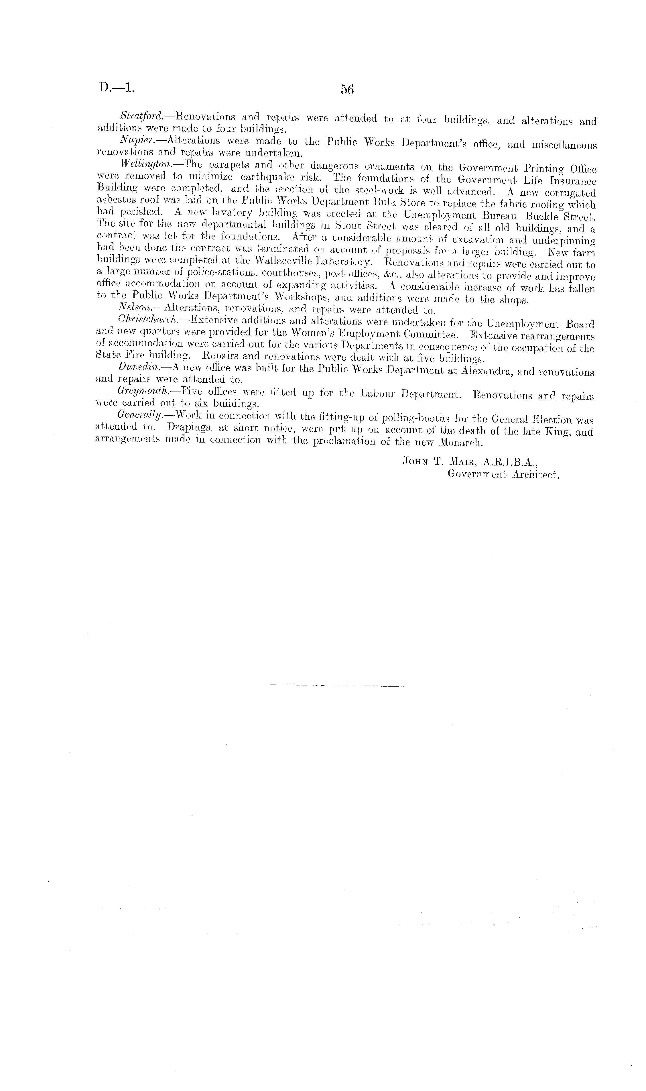 Stratford.—Renovations and repairs were attended to at four buildings, and alterations and additions were made to four buildings Napier. Alterations were made to the Public Works Department's office, and miscellaneous renovations and repairs were undertaken. Wellington— The parapets and other dangerous ornaments on the Government Printing Office were removed to minimize earthquake risk. The foundations of the Government Life Insurance iiilding were completed, and the erection of the steel-work is well advanced. A new corrugated asbestos roof was laid on the Public Works Department Bulk Store to replace the fabric roofing which had perished. A new lavatory building was erected at the Unemployment Bureau Buckle Street e site for the new departmental buildings in Stout Street was cleared of all old buildings, and a contract was let for the foundations. After a considerable amount of excavation and underpinning had been done the contract was terminated on account of proposals for a larger building. New farm buildings were completed at the Wallaceville Laboratory. Renovations and repairs were carried out to a large number of police-stations, courthouses, post-offices, &c., also alterations to provide and improve office accommodation on account of expanding activities. A considerable increase of work has fallen to the Public Works Department's Workshops, and additions were made to the shops. Nelson. —Alterations, renovations, and repairs were attended to. Christchurch. Extensive additions and alterations were undertaken for the Unemployment Board and new quarters were provided for the Women's Employment Committee. Extensive rearrangements of accommodation were carried out for the various Departments in consequence of the occupation of the State -tire building. Repairs and renovations were dealt with at five buildings. Dunedin. A new office was built for the Public Works Department at Alexandra, and renovations and repairs were attended to. Greymouth.—Five offices were fitted up for the Labour Department, Renovations and repairs were carried out to six buildings. Generally.—Work in connection with the fitting-up of polling-booths for the General Election was attended to. Drapmgs, at short notice, were put up on account of the death of the late King and arrangements made in connection with the proclamation of the new Monarch. John T. MAIE, A.R.1.8.A., Government Architect.
