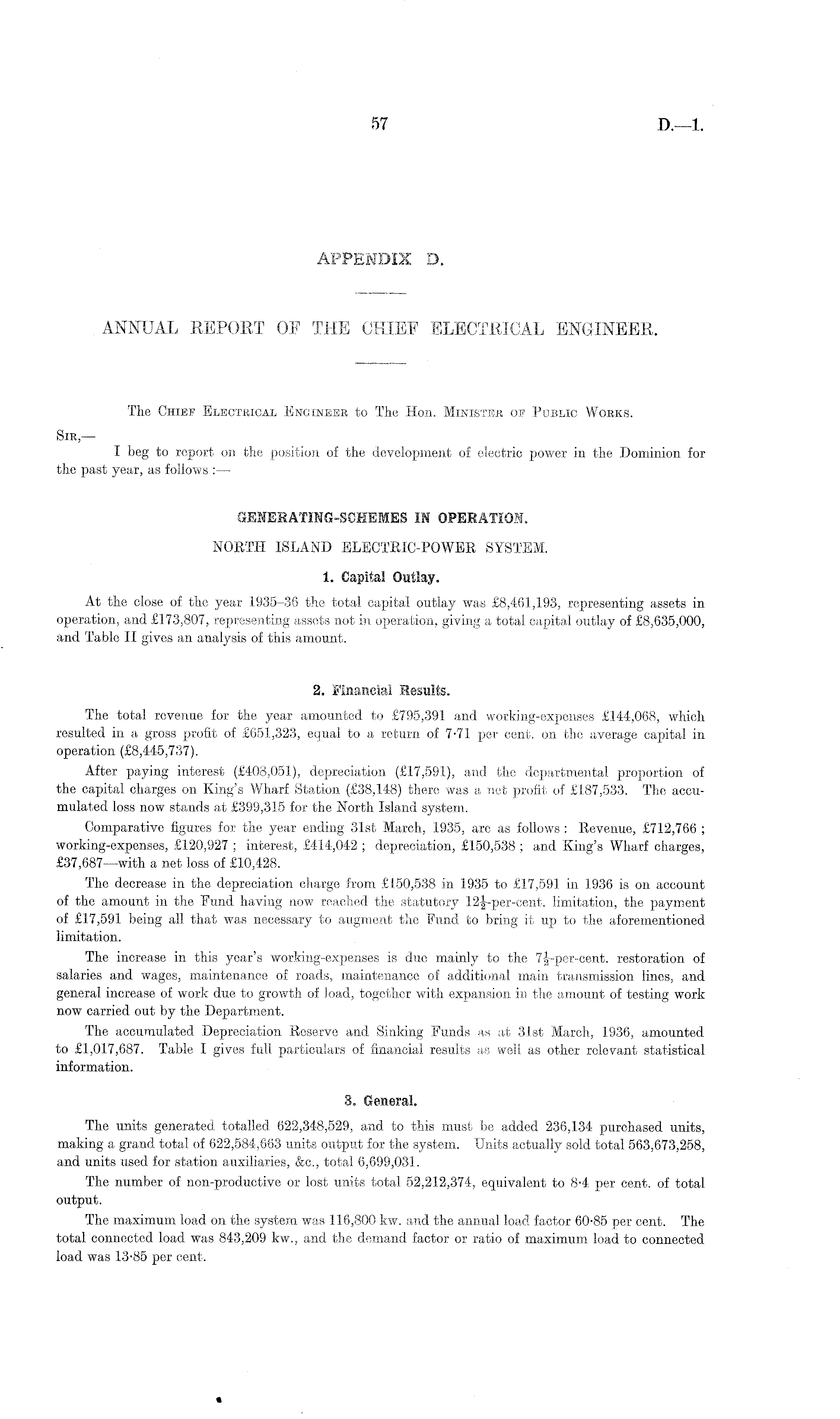 The Chief Electrical Engineer to The Hon. Minister oe Public Works. Sir, — I beg to report on the position of the development of electric power in the Dominion for the past year, as follows : — GENERATIHG-SGHEMES IN OPERATION. NORTH ISLAND ELECTRIC-POWER SYSTEM. 1. Capital Outlay. At the close of the year 1935-36 the total capital outlay was £8,461,193, representing assets in operation, and £173,807, representing assets not in operation, giving a total capital outlay of £8,635,000, and Table II gives an analysis of this amount. 2. Financial Results. The total revenue for the year amounted to £795,391 and working-expenses £144,068, which resulted in a gross profit of £651,323, equal to a return of 7-71 per cent, on the average capital in operation (£8,44-5,737). After paying interest (£408,051), depreciation (£17,591), and the departmental proportion of the capital charges on King's Wharf Station (£38,148) there was a net profit of £187,533. The accumulated loss now stands at £399,315 for the North Island system. Comparative figures for the year ending 31st March, 1935, are as follows : Revenue, £712,766 ; working-expenses, £120,927 ; interest, £414,042 ; depreciation, £150,538 ; and King's Wharf charges, £37,687 —with a net loss of £10,428. The decrease in the depreciation charge from £150,538 in 1935 to £17,591 in 1936 is on account of the amount in the Fund having now reached the statutory 12|-per-cent. limitation, the payment of £17,591 being all that was necessary to augment the Fund to bring it up to the aforementioned limitation. The increase in this year's working-expenses is due mainly to the 7§-per-cent. restoration of salaries and wages, maintenance of roads, maintenance of additional main transmission lines, and general increase of work due to growth of load, together with expansion in the amount of testing work now carried out by the Department. The accumulated Depreciation Reserve and Sinking Funds as at 31st March, 1936, amounted to £1,017,687. Table I gives full particulars of financial results as well as other relevant statistical information. 3. General. The units generated totalled 622,348,529, and to this must be added 236,134 purchased units, making a grand total of 622,584,663 units output for the system. Units actually sold total 563,673,258, and units used for station auxiliaries, &c., total 6,699,031. The number of non-productive or lost units total 52,212,374, equivalent to 8-4 per cent, of total output. The maximum load on the system was 116,800 kw. and the annual load factor 60-85 per cent. The total connected load was 843,209 kw., and the demand factor or ratio of maximum load to connected load was 13-85 per cent.