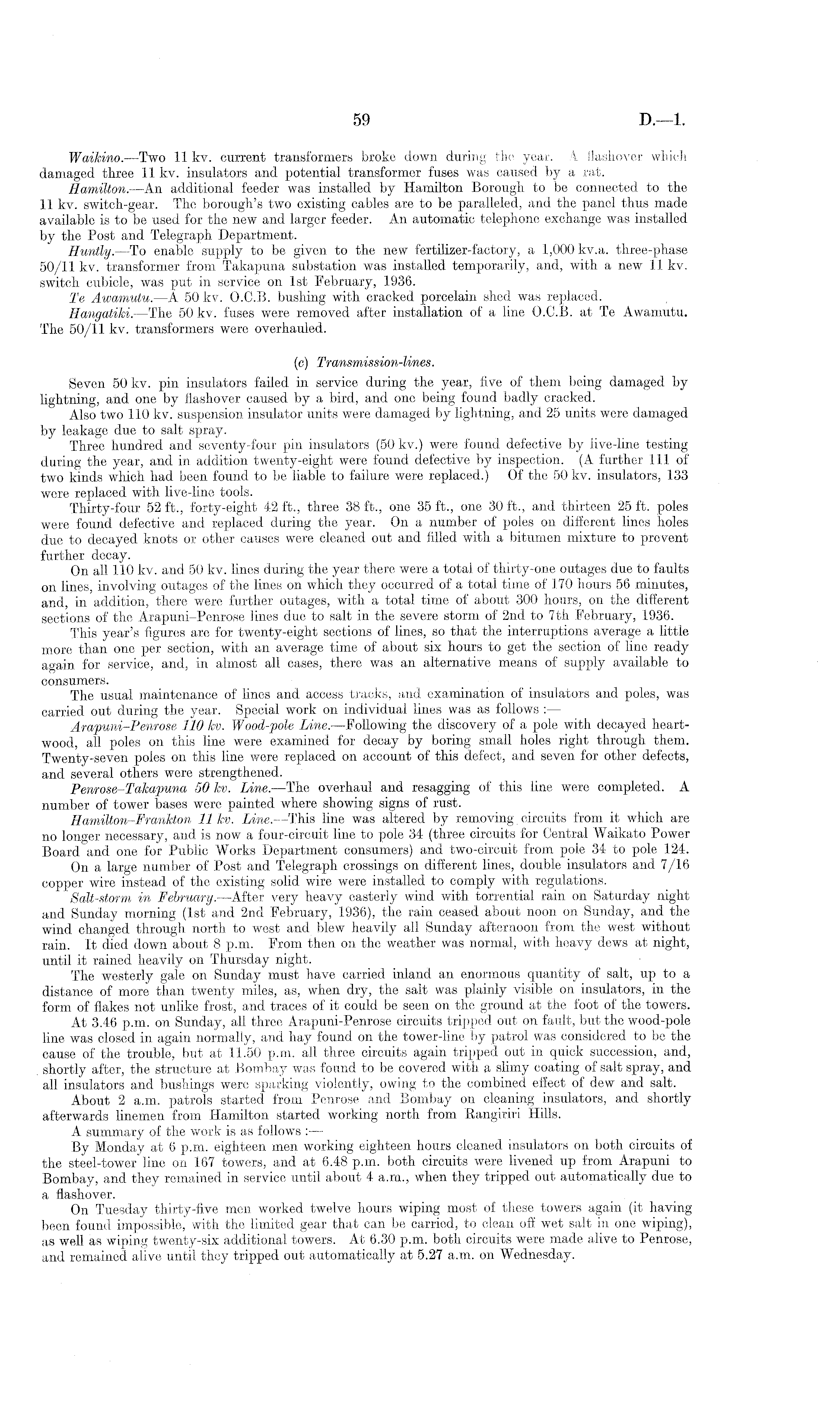 Waikino. —Two 11 kv. current transformers broke down during the year. A flashover which damaged three 11 kv. insulators and potential transformer fuses was caused by a rat. Hamilton. —An additional feeder was installed by Hamilton Borough to be connected to the 11 kv. switch-gear. The borough's two existing cables are to be paralleled, and the panel thus made available is to be used for the new and larger feeder. An automatic telephone exchange was installed by the Post and Telegraph Department. Huntly.—To enable supply to be given to the new fertilizer-factory, a 1,000 kv.a. three-phase 50/11 kv. transformer from Takapuna substation was installed temporarily, and, with a new 11 kv. switch cubicle, was put in service on Ist February, 1936. Te Awamutu. —A 50 kv. 0.C.8. bushing with cracked porcelain shed was replaced. Hangatiki. —The 50 kv. fuses were removed after installation of a line 0.C.8. at Te Awamutu. The 50/11 kv. transformers were overhauled. (c) Transmission-lines. Seven 50 kv. pin insulators failed in service during the year, five of them being damaged by lightning, and one by flashover caused by a bird, and one being found badly cracked. Also two 110 kv. suspension insulator units were damaged by lightning, and 25 units were damaged by leakage due to salt spray. Three hundred and seventy-four pin insulators (50 kv.) were found defective by live-line testing during the year, and in addition twenty-eight were found defective by inspection. (A further 111 of two kinds which had been found to be liable to failure were replaced.) Of the 50 kv. insulators, 133 were replaced with live-line tools. Thirty-four 52 ft., forty-eight 42 ft., three 38 ft., one 35 ft., one 30 ft., and thirteen 25 ft. poles were found defective and replaced during the year. On a number of poles on different lines holes due to decayed knots or other causes were cleaned out and filled with a bitumen mixture to prevent further decay. On all 110 kv. and 50 kv. lines during the year there were a total of thirty-one outages due to faults on lines, involving outages of the lines on which they occurred of a total time of 170 hours 56 minutes, and, in addition, there were further outages, with a total time of about 300 hours, on the different sections of the Arapuni-Penrose lines due to salt in the severe storm of 2nd to 7th February, 1936. This year's figures are for twenty-eight sections of lines, so that the interruptions average a little more than one per section, with an average time of about six hours to get the section of line ready again for service, and, in almost all cases, there was an alternative means of supply available to consumers. The usual maintenance of lines and access tracks, and examination of insulators and poles, was carried out during the year. Special work on individual lines was as follows Arapuni-Penrose 110 kv. Wood-pole Line. —Following the discovery of a pole with decayed heartwood, all poles on this line were examined for decay by boring small holes right through them. Twenty-seven poles on this line were replaced on account of this defect, and seven for other defects, and several others were strengthened. Penrose-Takapuna 50 kv. Line. —The overhaul and resagging of this line were completed. A number of tower bases were painted where showing signs of rust. Hamilton-Frankton 11 kv. Line. —This line was altered by removing circuits from it which are no longer necessary, and is now a four-circuit line to pole 34 (three circuits for Central Waikato Power Board and one for Public Works Department consumers) and two-circuit from pole 34 to pole 124. On a large number of Post and Telegraph crossings on different lines, double insulators and 7/16 copper wire instead of the existing solid wire were installed to comply with regulations. Salt-storm in February.—After very heavy easterly wind with torrential rain on Saturday night and Sunday morning (Ist and 2nd February, 1936), the rain ceased about noon on Sunday, and the wind changed through north to west and blew heavily all Sunday afternoon from the west without rain. It died down about 8 p.m. From then on the weather was normal, with heavy dews at night, until it rained heavily on Thursday night. The westerly gale on Sunday must have carried inland an enormous quantity of salt, up to a distance of more than twenty miles, as, when dry, the salt was plainly visible on insulators, in the form of flakes not unlike frost, and traces of it could be seen on the ground at the foot of the towers. At 3.46 p.m. on Sunday, all three Arapuni-Penrose circuits tripped out on fault, but the wood-pole line was closed in again normally, and hay found on the tower-line by patrol was considered to be the cause of the trouble, but at 11.50 p.m. all three circuits again tripped out in quick succession, and, shortly after, the structure at Bombay was found to be covered with a slimy coating of salt spray, and all insulators and bushings were sparking violently, owing to the combined effect of dew and salt. About 2 a.m. patrols started from Penrose and Bombay on cleaning insulators, and shortly afterwards linemen from Hamilton started working north from Rangiriri Hills. A summary of the work is as follows : — By Monday at 6 p.m. eighteen men working eighteen hours cleaned insulators on both circuits of the steel-tower line on 167 towers, and at 6.48 p.m. both circuits were livened up from Arapuni to Bombay, and they remained in service until about 4 a.m., when they tripped out automatically due to a flashover. On Tuesday thirty-five men worked twelve hours wiping most of these towers again (it having been found impossible, with the limited gear that can .be carried, to clean off wet salt in one wiping), as well as wiping twenty-six additional towers. At 6.30 p.m. both circuits were made alive to Penrose, and remained alive until they tripped out automatically at 5.27 a.m. on Wednesday.