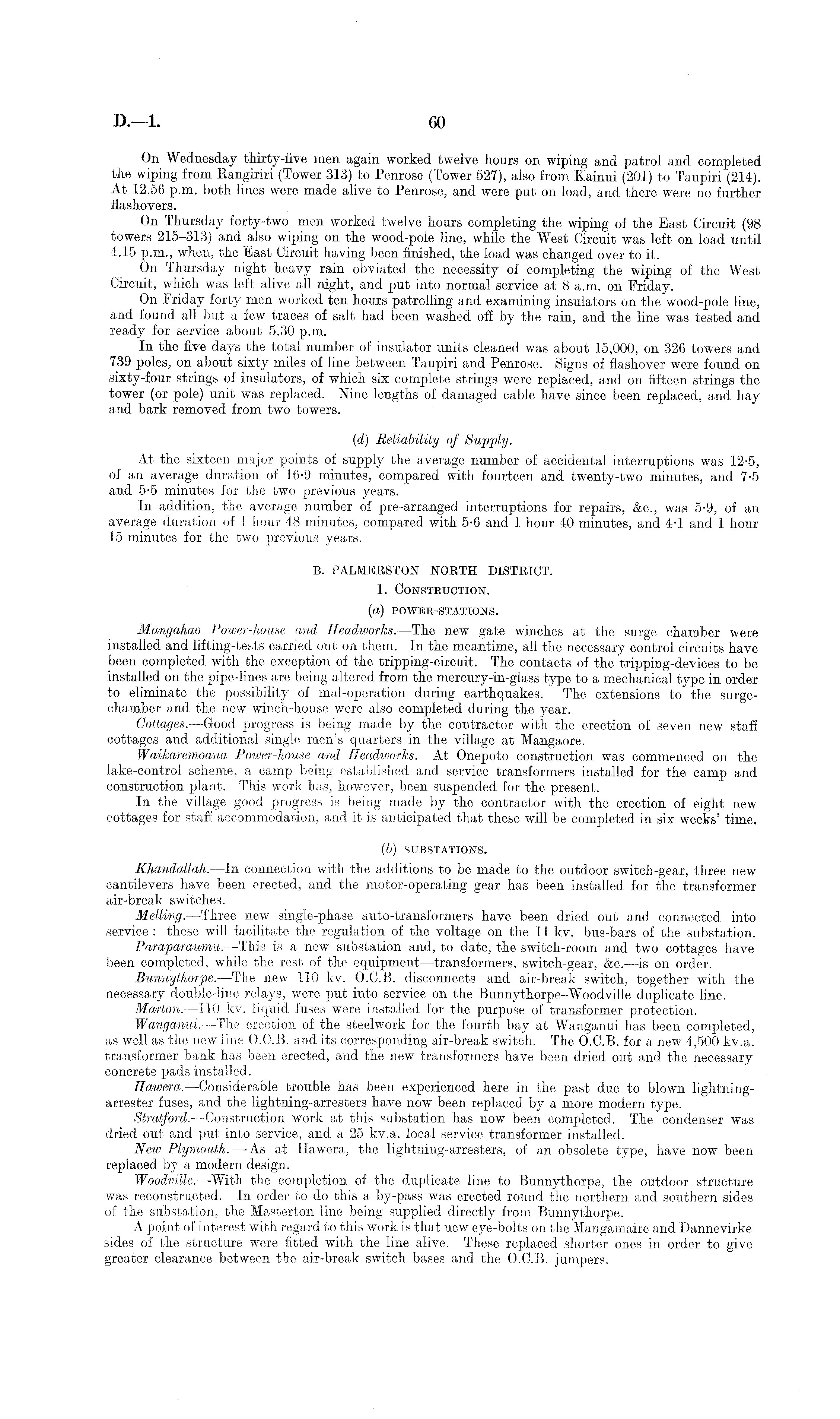 On Wednesday thirty-five men again worked twelve hours on wiping and patrol and completed the wiping from Rangiriri (Tower 313) to Penrose (Tower 527), also from Kainui (201) to Taupiri (214). At 12.56 p.m. both lines were made alive to Penrose, and were put on load, and there were no further flashovers. On Thursday forty-two men worked twelve hours completing the wiping of the East Circuit (98 towers 215-313) and also wiping on the wood-pole line, while the West Circuit was left on load until 4.15 p.m., when, the East Circuit having been finished, the load was changed over to it. On Thursday night heavy rain obviated the necessity of completing the wiping of the West Circuit, which was left alive all night, and put into normal service at 8 a.m. on Friday. On Friday forty men worked ten hours patrolling and examining insulators on the wood-pole line, and found all but a few traces of salt had been washed off by the rain, and the line was tested and ready for service about 5.30 p.m. In the five days the total number of insulator units cleaned was about 15,000, on 326 towers and 739 poles, on about sixty miles of line between Taupiri and Penrose. Signs of flashover were found on sixty-four strings of insulators, of which six complete strings were replaced, and on fifteen strings the tower (or pole) unit was replaced. Nine lengths of damaged cable have since been replaced, and hay and bark removed from two towers. ('d) Reliability of Supply. At the sixteen major points of supply the average number of accidental interruptions was 12-5, of an average duration of 16-9 minutes, compared with fourteen and twenty-two minutes, and 7-5 and 5-5 minutes for the two previous years. In addition, the average number of pre-arranged interruptions for repairs, &c., was 5-9, of an average duration of 1 hour 48 minutes, compared with 5-6 and 1 hour 40 minutes, and 4-1 and 1 hour 15 minutes for the two previous years. B. PALMERSTON NORTH DISTRICT. 1. Construction. (a) POWER-STATIONS. Mangahao Power-house and Headworks.—The new gate winches at the surge chamber were installed and lifting-tests carried out on them. In the meantime, all the necessary control circuits have been completed with the exception of the tripping-circuit. The contacts of the tripping-devices to be installed on the pipe-lines are being altered from the mercury-in-glass type to a mechanical type in order to eliminate the possibility of mal-operation during earthquakes. The extensions to the surgechamber and the new winch-house were also completed during the year. Cottages. —Good progress is being made by the contractor with the erection of seven new staff cottages and additional single men's quarters in the village at Mangaore. Waikaremoana Power-house and Headworks.—At Onepoto construction was commenced on the lake-control scheme, a camp being established and service transformers installed for the camp and construction plant. This work has, however, been suspended for the present. In the village good progress is being made by the contractor with the erection of eight new cottages for staff accommodation, and it is anticipated that these will be completed in six weeks' time. (b) SUBSTATIONS. Khandallah. —In connection with the additions to be made to the outdoor switch-gear, three new cantilevers have been erected, and the motor-operating gear has been installed for the transformer air-break switches. Melling.—Three new single-phase auto-transformers have been dried out and connected into service : these will facilitate the regulation of the voltage on the 11 kv. bus-bars of the substation. Paraparaumu. —This is a new substation and, to date, the switch-room and two cottages have been completed, while the rest of the equipment —transformers, switch-gear, &c. —is on order. Bunnythorpe. —The new 110 kv. 0.C.8. disconnects and air-break switch, together with the necessary double-line relays, were put into service on the Bunnythorpe-Woodville duplicate line. Marton. —110 kv. liquid fuses were installed for the purpose of transformer protection. Wanganui. —The erection of the steelwork for the fourth bay at Wanganui has been completed, as well as the new line 0.C.8. and its corresponding air-break switch. The 0.C.8. for a new 4,500 kv.a. transformer bank has been erected, and the new transformers have been dried out and the necessary concrete pads installed. Hawera. —Considerable trouble has been experienced here in the past due to blown lightningarrester fuses, and the lightning-arresters have now been replaced by a more modern type. Stratford. —Construction work at this substation has now been completed. The condenser was dried out and put into service, and a 25 kv.a. local service transformer installed. New Plymouth.—As at Hawera, the lightning-arresters, of an obsolete type, have now been replaced by a modern design. Woodville. —With the completion of the duplicate line to Bunnythorpe, the outdoor structure was reconstructed. In order to do this a by-pass was erected round the northern and southern sides of the substation, the Masterton line being supplied directly from Bunnythorpe. A point of interest with regard to this work is that new eye-bolts on the Mangamaire and Dannevirke sides of the structure were fitted with the line alive. These replaced shorter ones in order to give greater clearance between the air-break switch bases and the 0.C.8. jumpers.