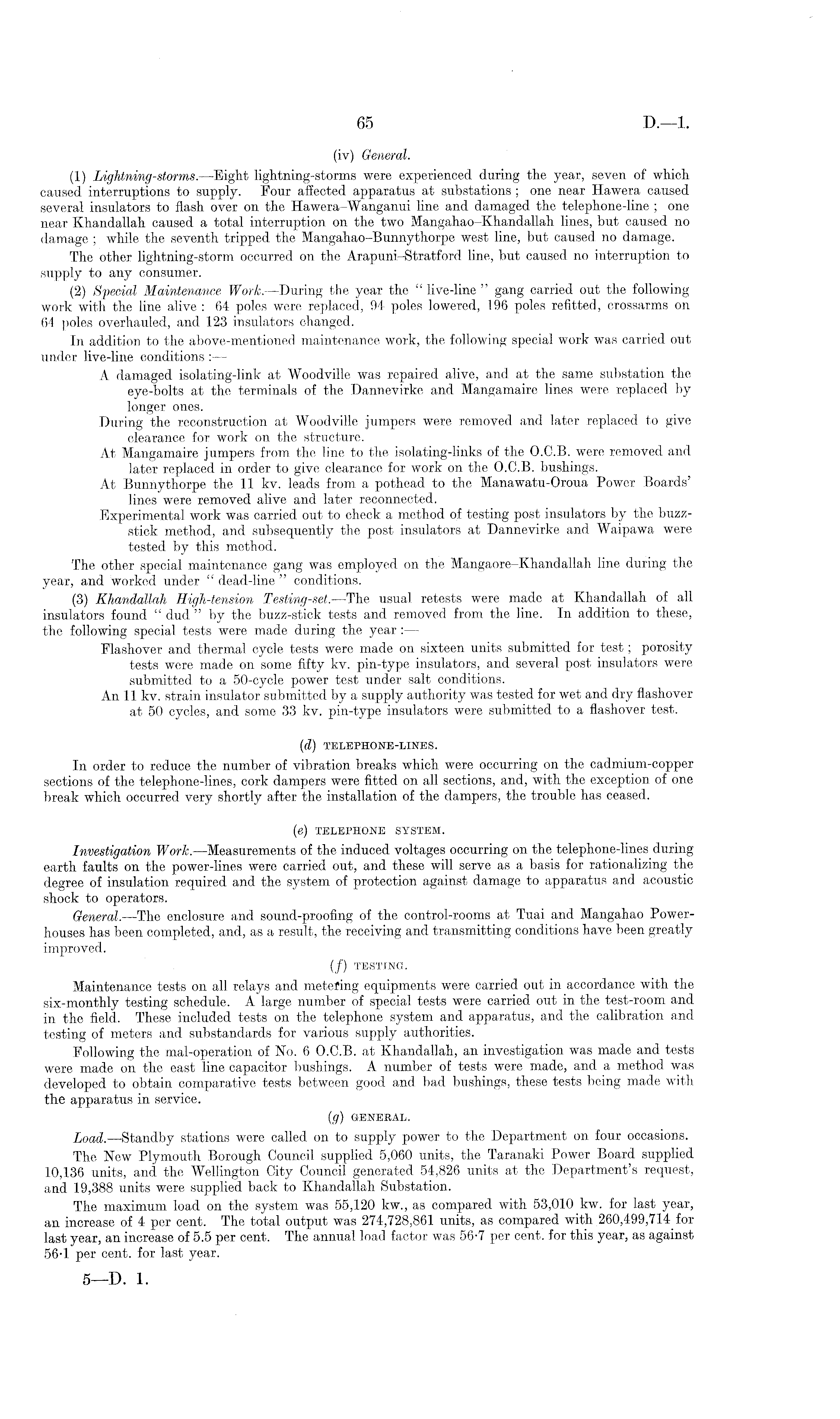 (iv) General. (1) Lightning-storms. —Eight lightning-storms were experienced during the year, seven of which caused interruptions to supply. Four affected apparatus at substations ; one near Hawera caused several insulators to flash over on the Hawera-Wanganui line and damaged the telephone-line ; one near Khandallah caused a total interruption on the two Mangahao-Khandallah lines, but caused no damage ; while the seventh tripped the Mangahao-Bunnythorpe west line, but caused no damage. The other lightning-storm occurred on the Arapuni-Stratford line, but caused no interruption to supply to any consumer. (2) Special Maintenance Work. —During the year the " live-line " gang carried out the following work with the line alive : 64 poles were replaced, 94 poles lowered, 196 poles refitted, crossarms on 64: poles overhauled, and 123 insulators changed. In addition to the above-mentioned maintenance work, the following special work was carried out under live-line conditions :— A damaged isolating-link at Woodville was repaired alive, and at the same substation the eye-bolts at the terminals of the Dannevirke and Mangamaire lines were replaced by longer ones. During the reconstruction at Woodville jumpers were removed and later replaced to give clearance for work on the structure. At Mangamaire jumpers from the line to the isolating-links of the 0.C.8. were removed and later replaced in order to give clearance for work on the 0.C.8. bushings. At Bunnythorpe the 11 kv. leads from a pothead to the Manawatu-Oroua Power Boards' lines were removed alive and later reconnected. Experimental work was carried out to check a method of testing post insulators by the buzzstick method, and subsequently the post insulators at Dannevirke and Waipawa were tested by this method. The other special maintenance gang was employed on the Mangaore-Khandallah line during the year, and worked under " dead-line " conditions. (3) Khandallah High-tension Testing-set. —The usual retests were made at Khandallah of all insulators found " dud " by the buzz-stick tests and removed from the line. In addition to these, the following special tests were made during the year : — Flashover and thermal cycle tests were made on sixteen units submitted for test; porosity tests were made on some fifty kv. pin-type insulators, and several post insulators were submitted to a 50-cycle power test under salt conditions. An 11 kv. strain insulator submitted by a supply authority was tested for wet and dry flashover at 50 cycles, and some 33 kv. pin-type insulators were submitted to a flashover test. (.d) TELEPHONE-LINES. In order to reduce the number of vibration breaks which were occurring on the cadmium-copper sections of the telephone-lines, cork dampers were fitted on all sections, and, with the exception of one break which occurred very shortly after the installation of the dampers, the trouble has ceased. (e) TELEPHONE SYSTEM. Investigation Work. —Measurements of the induced voltages occurring on the telephone-lines during earth faults on the power-lines were carried out, and these will serve as a basis for rationalizing the degree of insulation required and the system of protection against damage to apparatus and acoustic shock to operators. General. —The enclosure and sound-proofing of the control-rooms at Tuai and Mangahao Powerhouses has been completed, and, as a result, the receiving and transmitting conditions have been greatly improved. (/) TESTING. Maintenance tests on all relays and metefing equipments were carried out in accordance with the six-monthly testing schedule. A large number of special tests were carried out in the test-room and in the field. These included tests on the telephone system and apparatus, and the calibration and testing of meters and substandards for various supply authorities. Following the mal-operation of No. 6 0.C.8. at Khandallah, an investigation was made and tests were made on the east line capacitor bushings. A number of tests were made, and a method was developed to obtain comparative tests between good and bad bushings, these tests being made with the apparatus in service. (g) GENERAL. Load. —Standby stations were called on to supply power to the Department on four occasions. The New Plymouth Borough Council supplied 5,060 units, the Taranaki Power Board supplied 10,136 units, and the Wellington City Council generated 54,826 units at the Department's request, and 19,388 units were supplied back to Khandallah Substation. The maximum load on the system was 55,120 kw., as compared with 53,010 kw. for last year, an increase of 4 per cent. The total output was 274,728,861 units, as compared with 260,499,714 for last year, an increase of 5.5 per cent. The annual load factor was 56-7 per cent, for this year, as against 56-1 per cent, for last year.