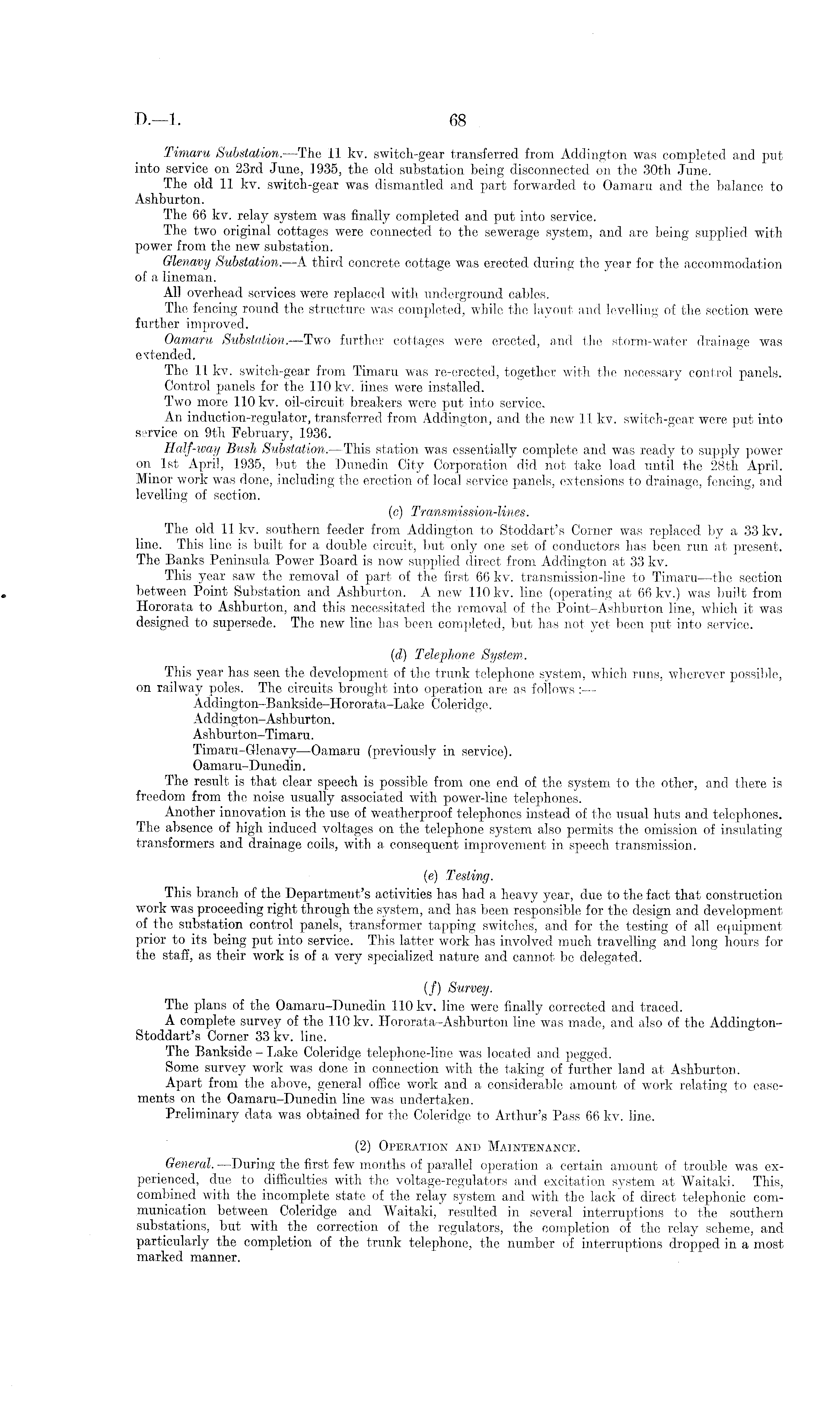 Timaru Substation.—The 11 kv. switch-gear transferred from Addington was completed and put into service on 23rd June, 1935, the old substation being disconnected on the 30th June. The old 11 kv. switch-gear was dismantled and part forwarded to Oamaru and the balance to Ashburton. The 66 kv. relay system was finally completed and put into service. The two original cottages were connected to the sewerage system, and are being supplied with power from the new substation. Glenavy Substation.—A third concrete cottage was erected during the year for the accommodation of a lineman. All overhead services were replaced with underground cables. The fencing round the structure was completed, while the layout and levelling of the section were further improved. Oamaru Substation.—Two further cottages were erected, and the storm-water drainage was extended. The 11 kv. switch-gear from Timaru was re-erected, together with the necessary control panels. Control panels for the 110 kv. "lines were installed. Two more 110 kv. oil-circuit breakers were put into service. An induction-regulator, transferred from Addington, and the new 11 kv. switch-gear were put into service on 9th February, 1936. Half-way Bush Substation.—This station was essentially complete and was ready to supply power on Ist April, 1935, but the Dunedin City Corporation did not take load until the 28tli April. Minor work was done, including the erection of local service panels, extensions to drainage, fencing, and levelling of section. (c) Transmission-lines. The olcl 11 kv. southern feeder from Addington to Stoddart's Corner was replaced by a 33 kv. line. This line is built for a double circuit, but only one set of conductors has been run at present. The Banks Peninsula Power Board is now supplied direct from Addington at 33 kv. This year saw the removal of part of the first 66 kv. transmission-line to Timaru—the section between Point Substation and Ashburton. A new 110 kv. line (operating at 66 kv.) was built from Hororata to Ashburton, and this necessitated the removal of the Point-Ashburton line, which it was designed to supersede. The new line has been completed, but has not yet been put into service. (d) Telephone System. This year has seen the development of the trunk telephone system, which runs, wherever possible, on railway poles. The circuits brought into operation are as follows : — Addington-Bankside-Hororata-Lake Coleridge. A ddi ngton-Ashburton. Ashburton-Timaru. Timaru-Glenavy—Oamaru (previously in service). Oamaru-Dunedin. The result is that clear speech is possible from one end of the system to the other, and there is freedom from the noise usually associated with power-line telephones. Another innovation is the use of weatherproof telephones instead of the usual huts and telephones. The absence of high induced voltages on the telephone system also permits the omission of insulating transformers and drainage coils, with a consequent improvement in speech transmission. (e) Testing. This branch of the Department's activities has had a heavy year, due to the fact that construction work was proceeding right through the system, and has been responsible for the design and development of the substation control panels, transformer tapping switches, and for the testing of all equipment prior to its being put into service. This latter work has involved much travelling and long hours for the staff, as their work is of a very specialized nature and cannot be delegated. (/) Survey. The plans of the Oamaru-Dunedin 110 kv. line were finally corrected and traced. A complete survey of the 110 kv. Hororata-Ashburton line was made, and also of the AddingtonStoddart's Corner 33 kv. line. The Bankside - Lake Coleridge telephone-line was located and pegged. Some survey work was done in connection with the taking of further land at Ashburton. Apart from the above, general office work and a considerable amount of work relating to easements on the Oamaru-Dunedin line was undertaken. Preliminary data was obtained for the Coleridge to Arthur's Pass 66 kv. line. (2) Operation and Maintenance. General. —During the first few months of parallel operation a certain amount of trouble was experienced, due to difficulties with the voltage-regulators and excitation system at Waitaki. This, combined with the incomplete state of the relay system and with the lack of direct telephonic communication between Coleridge and Waitaki, resulted in several interruptions to the southern substations, but with the correction of the regulators, the completion of the relay scheme, and particularly the completion of the trunk telephone, the number of interruptions dropped in a most marked manner.