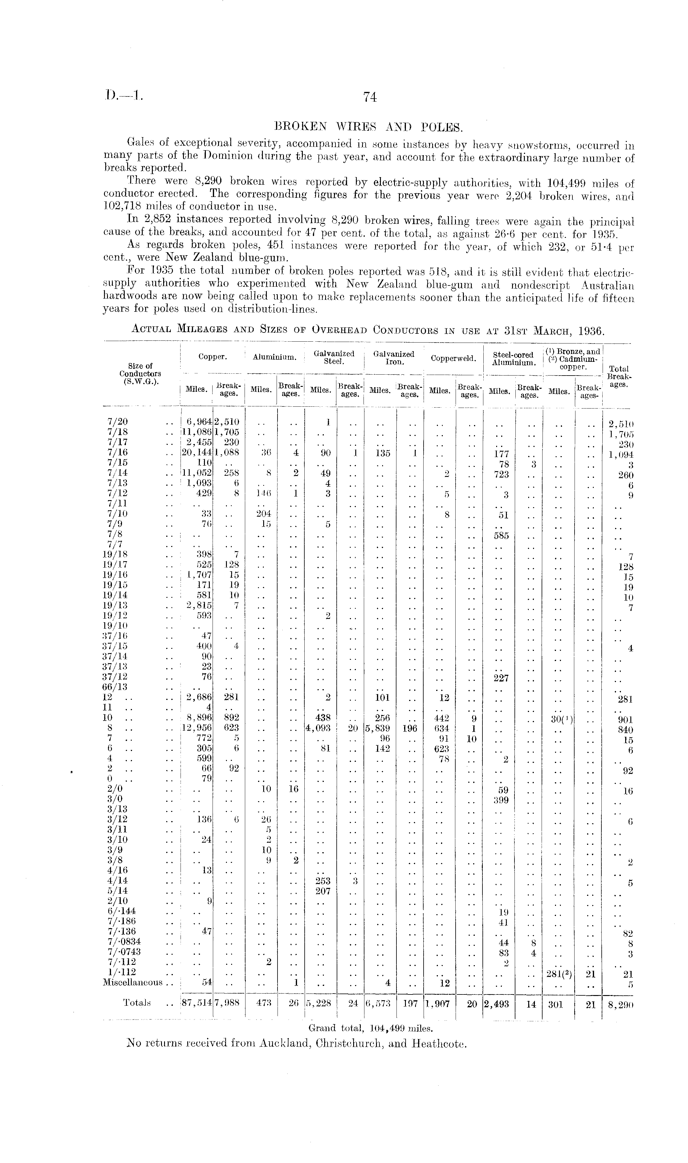 BROKEN WIRES AND POLES. Gales of exceptional severity, accompanied in some instances by heavy snowstorms, occurred in many parts of the Dominion during the past year, and account for the extraordinary large number of breaks reported. There were 8,290 broken wires reported by electric-supply authorities, with 104,499 miles of conductor erected. The corresponding figures for the previous year were 2,204 broken wires, and 102,718 miles of conductor in use. In 2,852 instances reported involving 8,290 broken wires, falling trees were again the principal cause of the breaks, and accounted for 47 per cent, of the total, as against 26'6 per cent, for 1935. As regards broken poles, 451 instances were reported for the year, of which 232, or 51-4 per cent., were New Zealand blue-gum. For 1935 the total number of broken poles reported was 518, and it is still evident that electricsupply authorities who experimented with New Zealand blue-gum and nondescript Australian hardwoods are now being called upon to make replacements sooner than the anticipated life of fifteen years for poles used on distribution-lines.