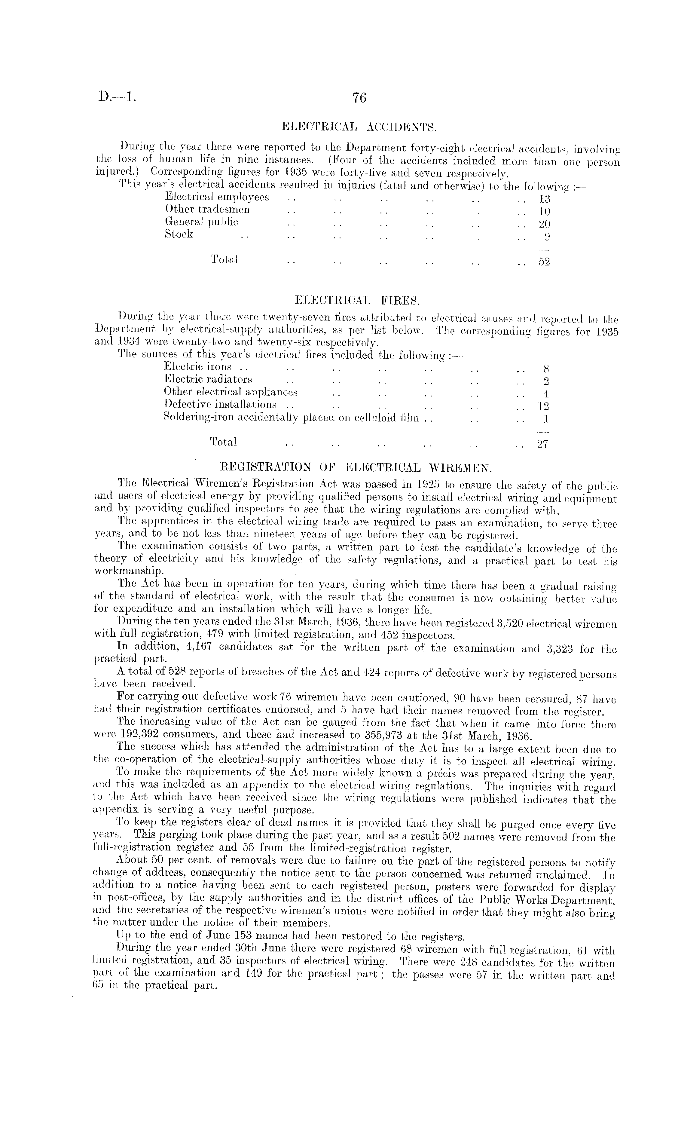 ELECTRICAL ACCIDENTS. During the year there were reported to the Department forty-eight electrical accidents, involving the loss of human life in nine instances. (Four of the accidents included more than one person injured.) Corresponding figures for 1935 were forty-five and seven respectively. This year's electrical accidents resulted in injuries (fatal and otherwise) to the following :— Electrical employees . . . . . . .. . . 13 Other tradesmen . . . . . . . . . . . . 10 General public . . .. . . . . . . 20 Stock .. .. .. .. .. .. 9 Total .. .. .. .. .. .. 52 ELECTRICAL FIRES. During the year there were twenty-seven fires attributed to electrical causes and reported to the Department by electrical-supply authorities, as per list below. The corresponding figures for 1935 and 1934 were twenty-two and twenty-six respectively. The sources of this year's electrical fires included the following :— Electric irons .. .. .. .. .. .. .. 8 Electric radiators . . . . . . . . . . . . 2 Other electrical appliances . . . . . . . . . . 4 Defective installations .. .. .. .. .. .. 12 Soldering-iron accidentally placed on celluloid film .. . . 1 Total .. .. . . . . . . 27 REGISTRATION OF ELECTRICAL WIREMEN. The Electrical Wiremen's Registration Act was passed in 1925 to ensure the safety of the public and users of electrical energy by providing qualified persons to install electrical wiring and equipment and by providing qualified inspectors to see that the wiring regulations are complied with. The apprentices in the electrical-wiring trade are required to pass an examination, to serve three years, and to be not less than nineteen years of age before they can be registered. The examination consists of two parts, a written part to test the candidate's knowledge of the theory of electricity and his knowledge of the safety regulations, and a practical part to test his workmanship. . The Act has been in operation for ten years, during which time there has been a gradual raising of the standard of electrical work, with the result that the consumer is now obtaining better value for expenditure and an installation which will have a longer life. During the ten years ended the 31st March, 1936, there have been registered 3,520 electrical wiremen with full registration, 479 with limited registration, and 452 inspectors. In addition, 4,167 candidates sat for the written part of the examination and 3,323 for the practical part. A total of 528 reports of breaches of the Act and 424 reports of defective work by registered persons have been received. For carrying out defective work 76 wiremen have been cautioned, 90 have been censured, 87 have had their registration certificates endorsed, and 5 have had their names removed from the register. The increasing value of the Act can be gauged from the fact that when it came into force there were 192,392 consumers, and these had increased to 355,973 at the 31st March, 1936. The success which has attended the administration of the Act has to a large extent been due to the co-operation of the electrical-supply authorities whose duty it is to inspect all electrical wiring. To make the requirements of the Act more widely known a precis was prepared during the year, and this was included as an appendix to the electrical-wiring regulations. The inquiries with regard to the Act which have been received since the wiring regulations were published indicates that the appendix is serving a very useful purpose. Po keep the registers clear of dead names it is provided that they shall be purged once every five years. This purging took place during the past year, and as a result 502 names were removed from the full-registration register and 55 from the limited-registration register. About 50 per cent, of removals were due to failure on the part of the registered persons to notify change of address, consequently the notice sent to the person concerned was returned unclaimed. In addition to a notice having been sent to each registered person, posters were forwarded for display in post-offices, by the supply authorities and in the district offices of the Public Works Department, and the secretaries of the respective wiremen's unions were notified in order that they might also bring the matter under the notice of their members. Up to the end of June 153 names had been restored to the registers. During the year ended 30th June there were registered 68 wiremen with full registration, 61 with limited registration, and 35 inspectors of electrical wiring. There were 248 candidates for the written part of the examination and 149 for the practical part; the passes were 57 in the written part and 65 in the practical part.