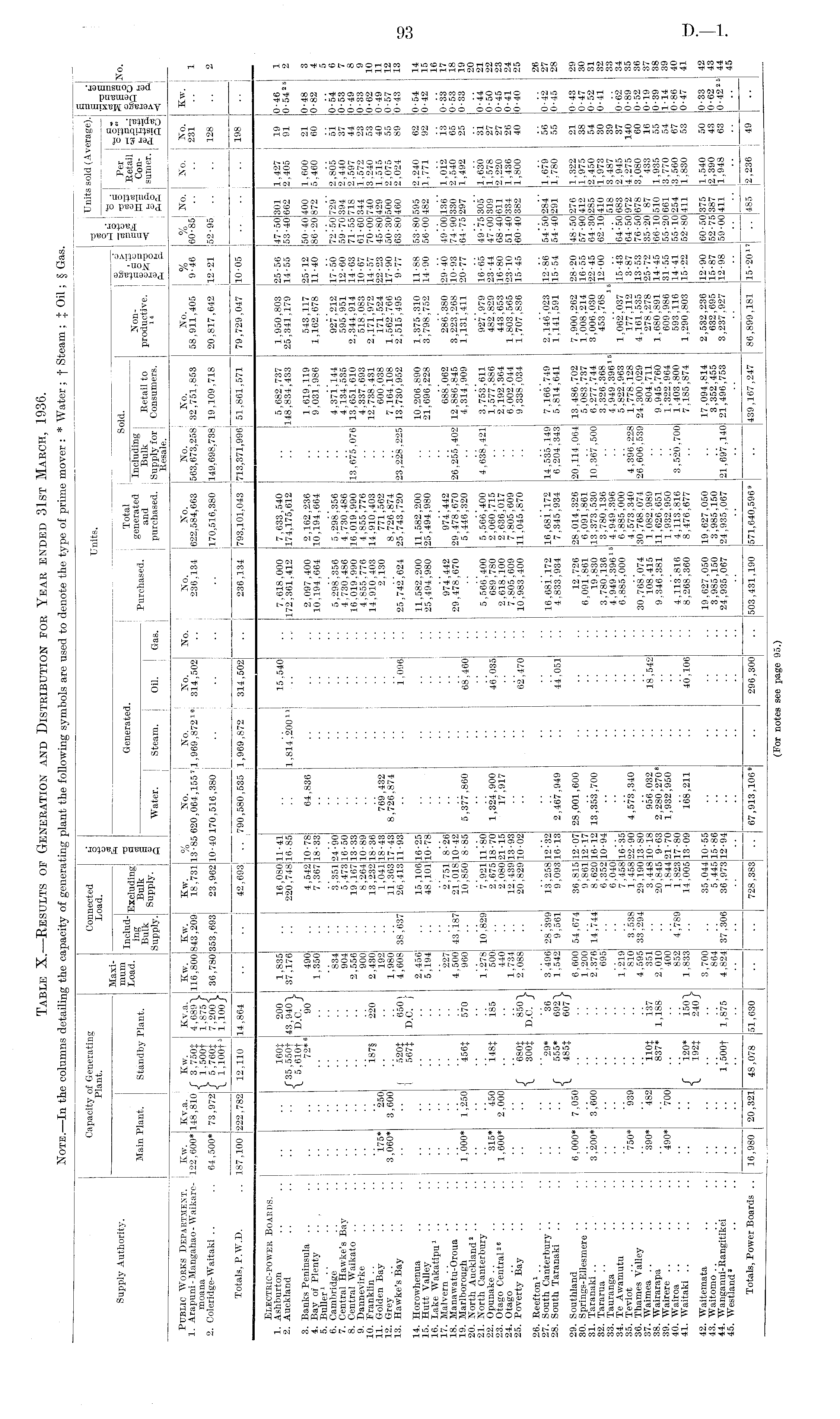 Note. — In the columns detailing the capacity of generating plant the following symbols are used to denote the type of prime mover : * Water ; f Steam ; J Oil; § Gas. - - - Capacity of Generating Connected TTll u 0 Units sold (Average), g Plant. Load. | UmtB - g _ |^| Maxi- S 7 : T5 — Supply Authority. mum T i ts n + 1 rr«+„i Sold. >. *3-8 «go Per °:g g g No. Load. | Generated. ejected ItodHdESI Hon- I S£ |S » eta " |S° Main Plant. Standby Plant. ™f k Bulk | ► Purchased. grated ] ag Betail to productive. ! I g ■§ gfg, I | Supply. p Water. Steam. Oil. Gas. ! purchased. Supply fori Consumers. 14 I 2 So 4 ' | 1 Resale. 1 1 i Public Works Department. Kw. Kv.a. Kw. Kv.a. Kw. Kw. Kw. % No. I No. No. No. No. No. No. No. No. % % No. No. No. Kw. 1. Arapuni-Mangahao-Waikare- 122,600* 148,810 f 3,750J 4,689 \ 116,800 843,209 18,731 13-85 620,064, 155 7 1,969, 872 10 314,502 .. 236,134 622,584,663 563,673,258 32,751,853 58,911,405 9-46 60-85 .. .. 231 .. 1 moana \ l.500f 1,875/ I 2. Coleridge-Waitaki .. .. 64,500* 73,972 / 5,760J 7,200\ 36,780 353,693 23,962 10-40170,516,380 .. .. .. .. 170,516,380 149,698,738 19,109,718 20,817,642 12-21 52-95 .. .. 128 .. 2 \ 1,100| 5 1,100/ Totals, P.W.D. .. 187,100 222,782 12,110 14,864 .. .. 42,693 .. 790,580,535 1,969,872 314,502 .. 236,134 793,101,043 713,371,996 51,861,571 79,729,047 10-05 198 i i Electric-power Boards. 1. Ashburton .. .. .. .. 160t 200 1,835 .. 16,08011-41 .. .. 15,540 .. 7,618,000 7,633,540 .. 5,682,737 1,950,803 25-56 47-50301 1,427 19 0-46 1 2. Auckland .. .. .. .. f35,550t 43,940\ 37,176 .. 220,74816-85 .. 1,814,20c 11 ... .. 172,361,412 174,175,612 .. 148,834,433 25,341,179 14-55 53-40662 2,405 91 0-54 25 2 3. Banks Peninsula .. .. .. .. 5 ' 6 72* 6 490 .. 4,54210-78 64,836 .. .. .. 2,097,400 2,162,236 .. 1,619,119 543,117 25-12 50-40400 1,600 21 0-48 3 4. Bay of Plenty .. .. .. 1,350 .. 7,367 18-33 .. .. .. .. 10.194,664 10,194,664 .. 9,031,986 1,162,678 11-40 86-20872 5,460 60 0-82 4 5. Buller 1 .. .. .. .. .. # _ ,, , , # _ .. .. .. .. .. .... .. .. .. 5 6. Cambridge .. .. .. !. " " *834 !! 3,351 24-90 !! !! !! " 5,298,356 5,298,356 .. 4,371,144 927,212 17-50 72-50729 2,805 51 0-54 6 7. Central Hawke's Bay .. .. .. .. .. 904 .. 5,47316-50 .. .. .. .. 4,730,486 4,730,486 .. 4,134,535 595,951 12-60 59-70394 2,440 37 0-53 7 8. Central Waikato .. .. .. .. .. .. 2,556 .. 19,167 13-33 .. .. .. .. 16.019,990 16,019,990 13,675,076 13,651.610 2,344,914 14-63 71-55718 2,597 44 0-49 8 9. Dannevirke .. .. .. .. .. .. 900 .. 8,26410-89 .. .. .. .. 4,855.776 4,855,776 .. 4,337,693 518,083 10-67 61-60344 1,572 23 0-33 9 10. Franklin .. .. .. .. .. 1875 220 2,430 .. 13,232 18-36 .. .. .. .. 14,910,403 1 4,910,403 .. 12,738,431 2,171,972 14-57 70-00 740 3,240 5 3 0-62 10 11. Golden Bay .. .. 175* 250 .. 192 1,041 18-43 769,432 2 130 771,562 .. 600,038 171,524 22-23 45-80429 1,515 40 0-49 11 12. Grey .. .. .. 3,060» 3,600 .. .. 1,980 .. 11,36317-43 8,726,874 .. . .! 8,726,874 .. 7,164,108 1,562,766 17-90 50-30500 2,075 55 0-57 12 13. Hawke's Bay .. .. .. .. j 520t 650} 4,608 38,637 26,413 11-93 .. .. 1,096 .. 25,742,624 25,743,720 23,228,225 13,730,952 2,515,495 9-77 63-80460 2,024 89 0-43 13 14. Horowhenua .. .. .. .. ' .' 67 '' D ' C | ' 2,456 .. 15,10616-25 .. .. .. .. 11,582,200 11,582,200 .. 10,206,890 1,375,310 11-88 53-80595 2,240 62 0-54 14 15. Hutt Valley .. .. .. .. .. .. 5,194 .. 48,101 10-78 .. .. . 25,494,980 25,494,980 .. 21,696,228 3,798,752 14-90 56-00482 1,771 92 0-42 15 16. Lake Wakatipu 1 .. .. .. .. .. .. .. .. .. .. .. .. .. .. .. .. .. .. 1-6 17. Malvern .. .. .. .. .. .. [[ *227 " 2 751 8-26 .. !. *! .. 974*442 974,442 .. 688,062 286,380 29-40 49-00136 1,012 13 0-33 17 18. Manawatu-Oroua .. .. .. .. .. 4,500 43 187 2li01810-42 .. 29 478'670 29,478,670 26,255,402 12,886,845 3,223,268 10-93 74-90330 2,540 65 0-53 18 19. Marlborough .. .. 1,000* 1,250 4561 570 960 .. 10,850 8-85 5,377,860 .. 68,460 .. .. 5,446,320 .. 4,314,909 1,131,411 20-77 64-75297 1,492 25 0-33 19 20. North Auckland ! . . . .. .. .. .. .. .. .. .. .. .. .. .. . . .. . . .. .. 20 21. North Canterbury .. .. .. .. .. 1,278 10,829 7,92111-80 .. .. 5,566,400 5,566,400 4,638,421 3,753,611 927,979 16-65 49-75305 1,630 31 0-44 21 22. Opunake . . .. .. 315* 450 148{ 185 500 .. 18-70 1,324,900 .. 46,035 .. 689,780 2,060,715 .. 1,577,886 482,829 23-44 47-00309 1,578 27 0-50 22 23. Otago Central 26 .. .. 1,600* 2,000 .. .. 440 .. 2,08021-15 17,917 .. .. .. 2,618,100 2,636,017 .. 2,192,364 443,653 16-80 68-40611 2,220 27 0-45 23 24. Otago .. .. .. .. .. .. 1,734 .. 12,43913-93 .. .. . 7,805,609 7,805,609 .. 6,002,044 1,803,565 23-10 51-40334 1,436 26 0-41 24 25. Poverty Bay .. .. .. .. / 680$ 850\ 2,088 .. 20,82910 02 .. .. 62,470 .. 10,983,400 11,045,870 .. 9,338,034 1,707,836 15-45 60-40382 1,800 40 0-40 25 \ 300$ D.C. / 26. Reefton 1 .. .. .. .. .. .. .. .. .. .. .. .. .. . .. .. .. .. .. 26 27. South Canterbury . . .. " .. '*29* *36 3,496 28*399 13,25812-32 !! !! !! 16,681., 172 16,681., 172 14,535,149 7,166,749 2,146,023 12-86 54-50284 1,679 56 0-42 27 28. South Taranaki .. .. .. .. r 555* 692\ 1,542 9,561 9,09316-13 2,467,949 .. 44,051 .. 4,833,934 7,345,934 6,204,343 5,814,641 1,141,591 15-54 54-40291 1,780 55 0-45 28 29. Southland .. .. 6,000* 7,050 6<> ' 6,600 54,674 36,81512-07 28,001,600 .. .. .. 12,726 28,014,326 20,114,064 13,486,702 7,900,262 28-20 48-50276 1,322 21 0-43 29 30. Springs-Ellesmere .. .... .. . . 1.200 9 86112-17 . 6 091 861 6,091,861 .. 5,083,737 1,008,214 16-55 57-90412 1,975 38 0-47 30 31. Taranaki . . .. .. 3,200* 3,600 .. .. 2,376 14,744 8,62016-12 13,353,700 .. .. .. 19,830 13,373,530 10,367,500 6,277,744 3,006,030 22-45 64-30285 2,450 54 0-52 31 32. Tararua .. .. .. .. .. .. .. 695 .. 6,35210-94 .. .. . .. 3,780.136 3,780,136 .. 3,326,368 453,768 12-00 62-10410 1,9/3 30 0-41 32 33. Tauranga .. .. .. .. .. .. .. .. 6,040 .. .. .. . .. 4.949.396 11 4,949,396 .. 4,949,396 15 .. 15 •• 518 3,487 39 .. 33 34. Te Awamutu 