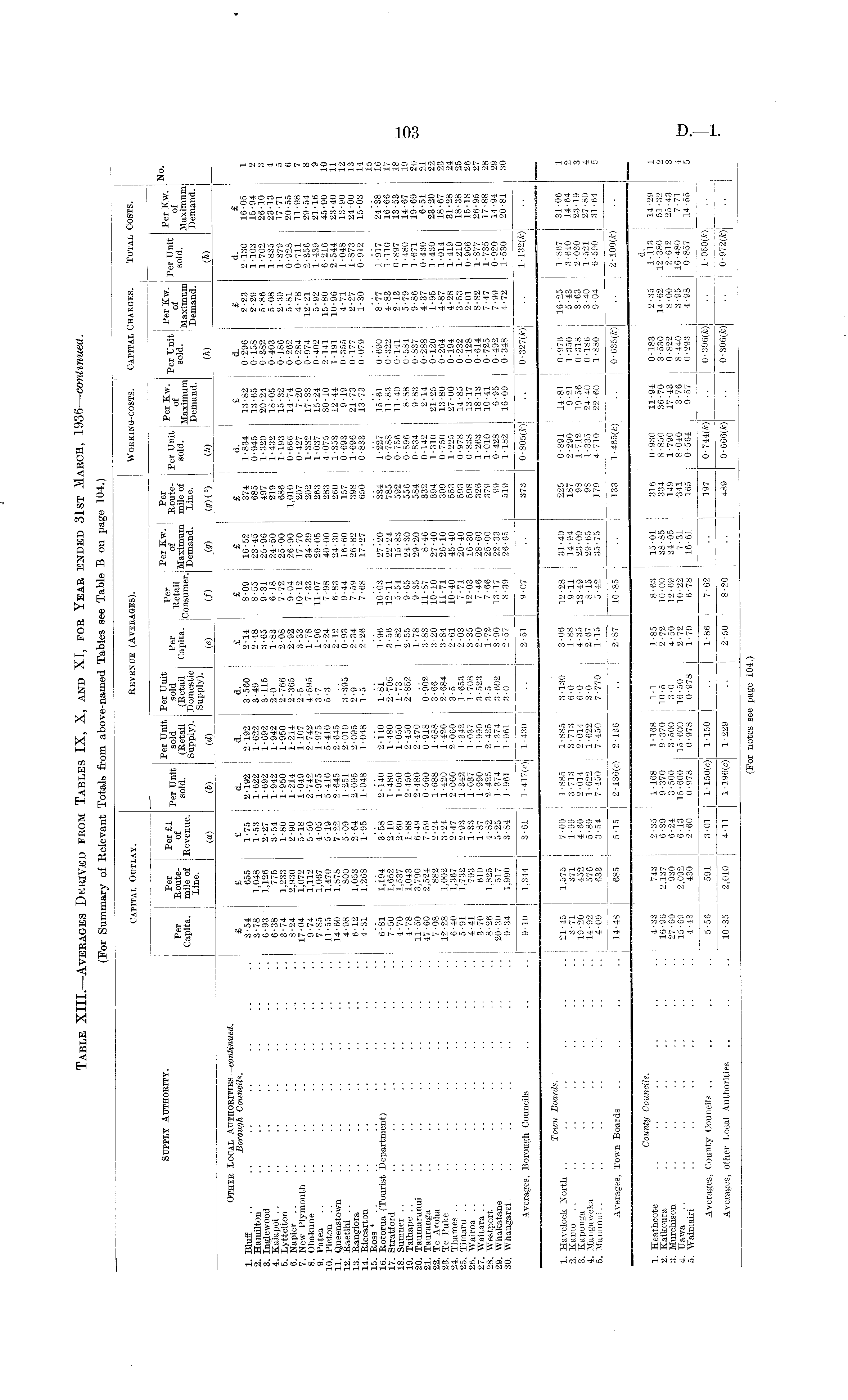 (For Summary of Relevant Totalis from above-named Tables see Table B on page 104.) Capital Outlay. Revenue (Averages). Working-costs. Capital Charges. Total Costs. Supply Authority. p P £1 Per Unit PerUnit p PerXw. p ?w . P ?w . p P.Kw. A "J? —• SOM - «. So CaPita - —,Ma~ | mileof sold. sold. sold. „ m Supply). I (a) (6) (d) (e) (/) (g) ! (g)( 5 ) (h) (h) (h) Other Local Authorities —continued. j _ „ . , , ~ , £ 1 Bluff BO " 0Ugh " lS - 3 £ 54 655 As ! 2-192 ! 2-192 3-560 ! 8-09 I 16*52 874 I 1 834 0-296 2-23 2 130 16-05 1 2 Hamilton 3-78 1,048 1-53 1-622 1-622 3-49 , 2-48 8-55 | 23-45 685 i 0-945 13-65 0-158 2-29 1 103 15-94 2 3 .. 6-93 1,126 2-27 1-692 1-692 3-115 I 3-65 9-31 ! 25-96 497 j 1-320 20-24 0-382 5-86 1-702 26-10 3 4" Kaiapoi . .. 6-38 775 3-54 1-942 1-942 2-0 1 1-83 6-18 24-50 219 1 1-432 18-05 0-403 5-08 J'835 ?2'1? t 5'Lyttelton' " : 3-74 1,233 1-80 1-950 1-950 2-766 j 2-08 7-72 25-00 686 1-193 15-32 0-186 2-39 1-379 17-71 5 e' Napier . ... .. 8-24 2,930 2-90 1-214 1-214 2-365 ! 2-92 9-04 26-90 1,010 ] 0-666 14-74 0-262 5-81 0-928 20-55 6 7' New Plymouth " 17-04 1,072 5-18 1-049 1-107 2-5 I 3-33 10-12 17-70 207 j 0-427 7-20 0-284 4-78 0-711 11-98 7 8 OhakuTie 9-74 1 112 5-50 2-742 2-742 4-595 I 1-78 7-33 34-39 202 i 1-382 17-33 ! 0-974 12-21 2-356 29-54 8 9 Patea " " " " !! 7-85 1,067 4-05 j 1-975 1-975 3-7 1-96 11-07 29-05 263 | 1-037 15-24 0-402 5-92 1-439 21-16 9 10* Pieton *' * * 11-55 1 470 5-19 5-410 5-410 5-3 1 2-24 7-98 ; 40-00 283 4-075 30-10 2-141 15-80 6-216 45-90 10 11 Ouee? 8 toWn 14-60 1 878 7-22 ' 2-645 2-645 . ; 2-12 6-83 24-30 260 ! 1-353 12-44 1-191 10-96 2-544 23-40 11 12' Baetihi " " .. .. .. 4-98 800 5-09 1-251 2-010 3-395 ! 0-93 9-44 16-60 157 \ 0-693 9-19 0-355 4-71 1 048 13-90 12 13 Bangiora 6-12 1,053 2-64 I 2-095 2-095 2-9 2-34 7-59 26-82 398 1-696 21-73 0-177 2-27 1-873 24-00 13 14! Eiccarton !. :: 4-31 1-95 ! 1-048 1-048 1-5 2-26 7-68 17-27 650 0-833 13-73 0-079 1-30 0-912 15-03 14 l&. lotorua (Tourist Department) " !! ! 6 : 81 1,194 3 : 58 2-140 2-iio l-si l'-96 10-03 27-20 334 1-227 15-61 0-690 8-77 1-9X7 24-38 16 17 strntford 7-50 1 652 2-10 1-480 1-480 2-705 3-56 12-11 22-24 785 0-788 11-83 0-322 4-83 1-110 16 66 1/ Islumner ! " " !! 4-7Ô 1,11? 5-60 1-060 Ī-050 1-73 1-82 5-54 15-83 592 0-756 11-40 0-141 2-13 0-897 13-53 18 19 Taihane 4-78 1 043 1-88 2-450 2-450 2-852 2-55 9-65 24-30 556 0-896 8-88 0-584 5-i9 1-480 14-67 19 20 Taumarunui 11-50 3 790 6-49 2-480 2-470 .. 1-78 9-35 29-20 584 0-834 9-83 0-837 9-86 1-671 19-69 20 21 Tauranga " " " 1! !! 47-60 2 524 7-59 0-560 0-918 0-902 3-83 11-87 8-46 332 0-142 2-14 0-288 4-37 0-430 6-51 21 22 Te Aroha 7-08 882 2-24 1-688 1-688 3-66 3-20 10-10 27-40 394 1-310 21-25 0-120 1-95 1-430 23-20 22 23 Te Puke 12-28 1,002 3-24 1-420 1-420 2-684 3-84 11-71 26-10 309 0-750 13-80 0-264 4-87 1-014 18-67 23 24 Thames 6-40 1367 2-47 2-060 2-060 3-5 2-61 10-40 45-40 553 1-225 27-00 0-194 4-28 1-419 31-28 24 25. Timaru .. .. .. .. .. .. .. 5-91 1,732 2-93 1-342 1-342 1-653 2-03 7-71 20-40 593 0-978 14-85 0-232 3-53 1-210 18-38 25 26 Wairoa .. .. .. .. .. 4-41 793 1-33 1-037 1-037 1-708 3-35 12-03 16-30 598 0-838 13-17 0-128 2-01 0-966 15-18 26 27 Waitara 3-70 610 1-87 1-990 1-990 3-523 2-00 7-46 28-60 326 1-263 18-13 0-614 8-82 1-877 26-95 27 Is! westport :: :: :: :: :: :: III Ji" Iā, s- 6 1-72 7 -6 6 25-00 379 i-oio io-4i 0-725 7-« 1-735 n-ss 28 29 Whakatane 20-30 517 5-25 1-374 1-374 3-602 3-90 13-17 22-33 99 0-428 6-95 0-492 7-99 0-920 J-J-94 §0.' Whangarei !! !! !! !! 9-34 1,990 3-84 1-961 1-961 3-0 2-57 8-39 26-65 519 1-182 16-09 0-348 4-72 1-530 20-81 30 Averages, Borough Councils .. .. .. 9-10 1,344 3-61 l-417(c) 1-430 .. 2-51 9-07 j .. 373 0-805(&)| .. 0-327(&)j .. 1-132(&) 1. Havelock North .. Town Boards. g ? g g Qg | gj.gg 1 2 Kamo .. .. .. .. 3-71 371 1-99 3-713 3-713 6-0 1-88 9-11 14-94 187 2-290 9-21 1-350 5-43 , 3-640 14 64 2 3. Kaponga .. .. .. .. .. .. 19-20 452 4-60 2-014 2-014 6-0 4-35 13-49 23-00 98 1-712 19-56 0-318 3-63 ! 2-030 23 19 3 4. Mangaweka 14-92 576 5-89 1-622 | 1-622 3-0 2-67 8-15 29-65 98 1-335 24-40 0-186 3-40 [ 1-521 -7-80 4 5. Manunui.. .. .. .. .. .. 4-09 633 3-54 7-450 ; 7-450 7-770 1-15 5-42 35-75 179 4-710 j 22-60 j 1-880 9-04 | 6-590 31 64 5 Averages, Town Boards .. .. .. .. 14-48 685 5-15 2-136(c) 2-136 .. 2-87 10-85 .. 133 l-465(4)j .. j 0-635(4) .. j 2-100(4) 1 Heathcote .. ° 0UntV CounaU - __ 4 . 33 748 2 . 35 1 . 168 1-168 , j.j j.gg j 8 . 63 1B , 01 ! 316 0 . 930 U.g4 0-183 2-35 I'JJS Jf'f® 1 2 Kaikoura .. .. .. .. .. .. 16-96 2,137 6-39 9-370 9-370 I 10-5 2-72 10-00 38-85 j 334 8-850 36-70 3-530 14-62 !2'380 51-32 2 3 Murehison .. .. .. .. .. .. 27-60 930 6-24 3-500 3-500 ! 3-0 4-50 12-69 34-05 149 1-790 17-43 0-822 8-00 2-612 25-43 3 4 Uawa . . .. .. .. -■ 15-69 2,092 6-13 15-600 15-600 I 16-50 2-72 10-22 7-31 ! -341 8-040 3-76 8-440 3-95 7-71 4 5] Waimairi .. .. .. .. .. .. 4-43 430 2-60 0-978 0-978 j 0-978 1-70 6-78 16-61 165 0-564 9-57 0-293 4-98 0-857 14-55 5 Averages, County Councils .. .. .. .. 5-56 591 3-01 l-150(c) 1-150 | .. 1-86 j 7-62 .. 197 0-744(4) .. 0-306(4) 1-050(4) Averages, other Local Authorities .. .. .. 10-35 2,010 4-11 l-196(c) 1-229 j .. 2-50 j 8-20 .. 489 0-666(4) .. 0-306(4) .. j 0-972(4) (For notes see page 104.)