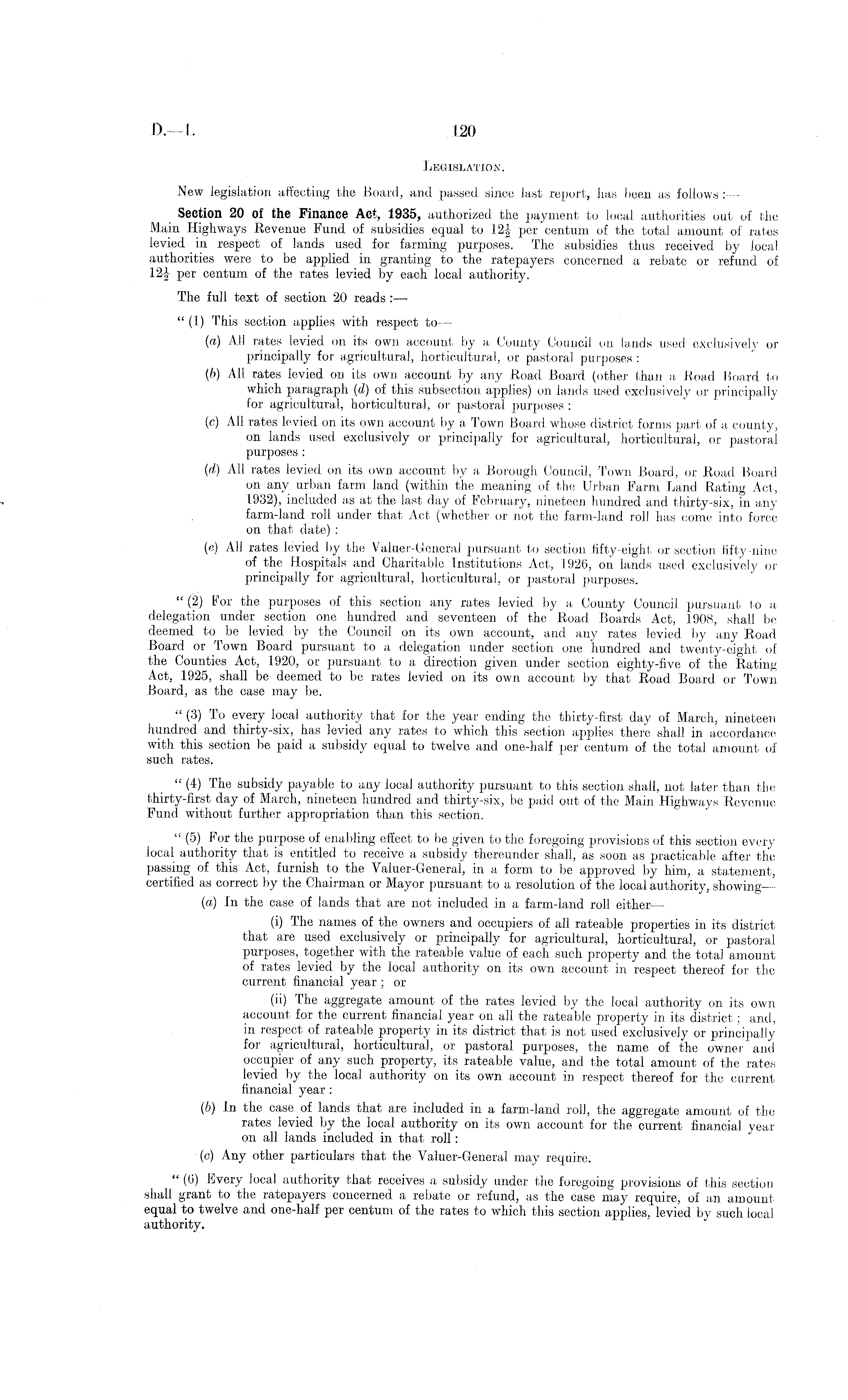 Legislation. New legislation affecting the Board, and passed since last report, has been as follows :— Section 20 of the Finance Act, 1935, authorized the payment to local authorities out of the Main Highways Revenue Fund of subsidies equal to 12J per centum of the total amount of rates levied in respect of lands used for farming purposes. The subsidies thus received by local authorities were to be applied in granting to the ratepayers concerned a rebate or refund o! 12-J per centum of the rates levied by each local authority. The full text of section 20 reads : — " (1) This section applies with respect to—• (a) All rates levied on its own account by a County Council on lands used exclusively or principally for agricultural, horticultural, or pastoral purposes : (b) All rates levied on its own account by any Road Board (other than a Road Board to which paragraph (d) of this subsection applies) on lands used exclusively or principally for agricultural, horticultural, or pastoral purposes : (c) All rates levied on its own account by a Town Board whose district forms part of a county, on lands used exclusively or principally for agricultural, horticultural, or pastoral purposes : {d) All rates levied on its own account by a Borough Council, Town Board, or Road Board on any urban farm land (within the meaning of the Urban Farm Land Rating Act, 1932), included as at the last day of February, nineteen hundred and thirty-six, in any farm-land roll under that Act (whether or not the farm-land roll has come into force on that date) : (e) All rates levied by the Valuer-General pursuant to section fifty-eight or section fifty-nine of the Hospitals and Charitable Institutions Act, 1926, on lands used exclusively or principally for agricultural, horticultural, or pastoral purposes. " (2) For the purposes of this section any rates levied by a County Council pursuant to a delegation under section one hundred and seventeen of the Road Boards Act, 1908, shall be deemed to be levied by the Council on its own account, and any rates levied by any Road Board or town Board pursuant to a delegation under section one hundred and twenty-eight of the Counties Act, 1920, or pursuant to a direction given under section eighty-five of the Rating Act, 1925, shall be- deemed to be rates levied on its own account by that Road Board or Town Board, as the case may be. " (3) To every local authority that for the year ending the thirty-first day of March, nineteen hundred and thirty-six, has levied any rates to which this section applies there shall in accordance with this section be paid a subsidy equal to twelve and one-half per centum of the total amount of such rates. " (4) The subsidy payable to any local authority pursuant to this section shall, not later than the thirty-first day of March, nineteen hundred and thirty-six, be paid out of the Main Highways Revenue Fund without further appropriation than this section. " (5) For the purpose of enabling effect to be given to the foregoing provisions of this section every local authority that is entitled to receive a subsidy thereunder shall, as soon as practicable after the passing of this Act, furnish to the Valuer-General, in a form to be approved by him, a statement, certified as correct by the Chairman or Mayor pursuant to a resolution of the local authority, showing— (a) In the case of lands that are not included in a farm-land roll either — (i) The names of the owners and occupiers of all rateable properties in its district that are used exclusively or principally for agricultural, horticultural, or pastoral purposes, together with the rateable value of each such property and the total amount of rates levied by the local authority on its own account in respect thereof for the current financial year ; or (ii) The aggregate amount of the rates levied by the local authority on its own account for the current financial year on all the rateable property in its district; and, in respect of rateable property in its district that is not used exclusively or principally for agricultural, horticultural, or pastoral purposes, the name of the owner and occupier of any such property, its rateable value, and the total amount of the rates levied by the local authority on its own account in respect thereof for the current financial year : (b) In the case of lands that are included in a farm-land roll, the aggregate amount of the rates levied by the local authority on its own account for the current financial year on all lands included in that roll: (e) Any other particulars that the Valuer-General may require. " (6) Every local authority that receives a subsidy under the foregoing provisions of this section shall grant to the ratepayers concerned a rebate or refund, as the case may require, of an amount equal to twelve and one-half per centum of the rates to which this section applies, levied by such local authority.