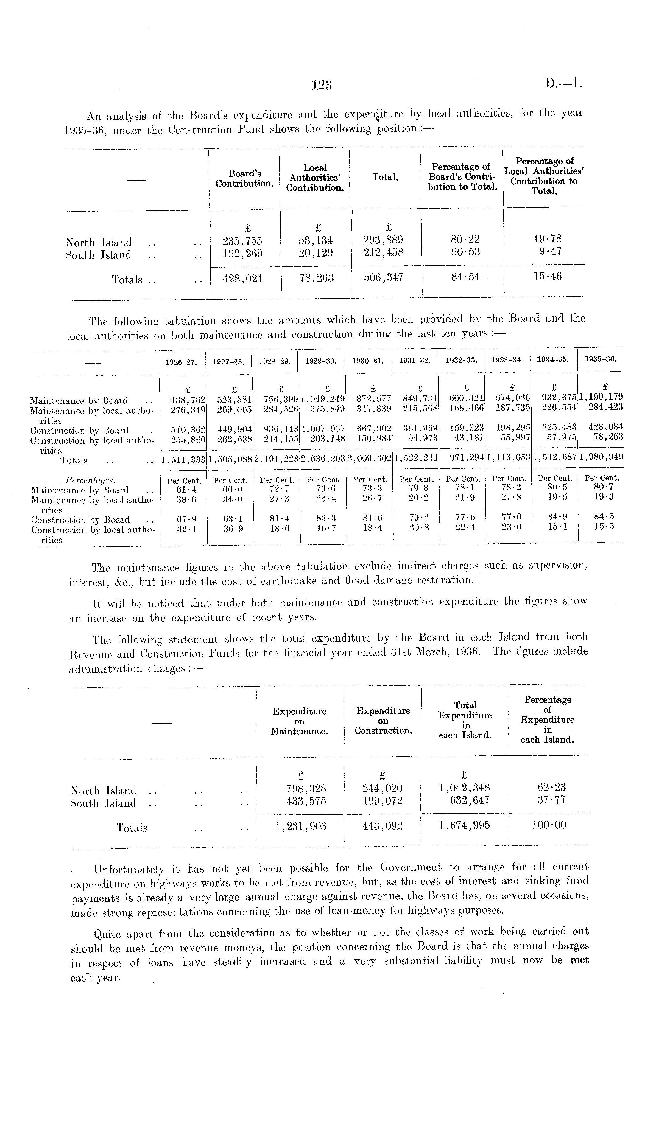 The maintenance figures in the above tabulation exclude indirect charges such as supervision, interest, &c., but include the cost of earthquake and flood damage restoration. It will be noticed that under both maintenance and construction expenditure the figures show an increase on the expenditure of recent years. The following statement shows the total expenditure by the Board in each Island from both Revenue and Construction Funds for the financial year ended 31st March, 1936. The figures include administration charges : —