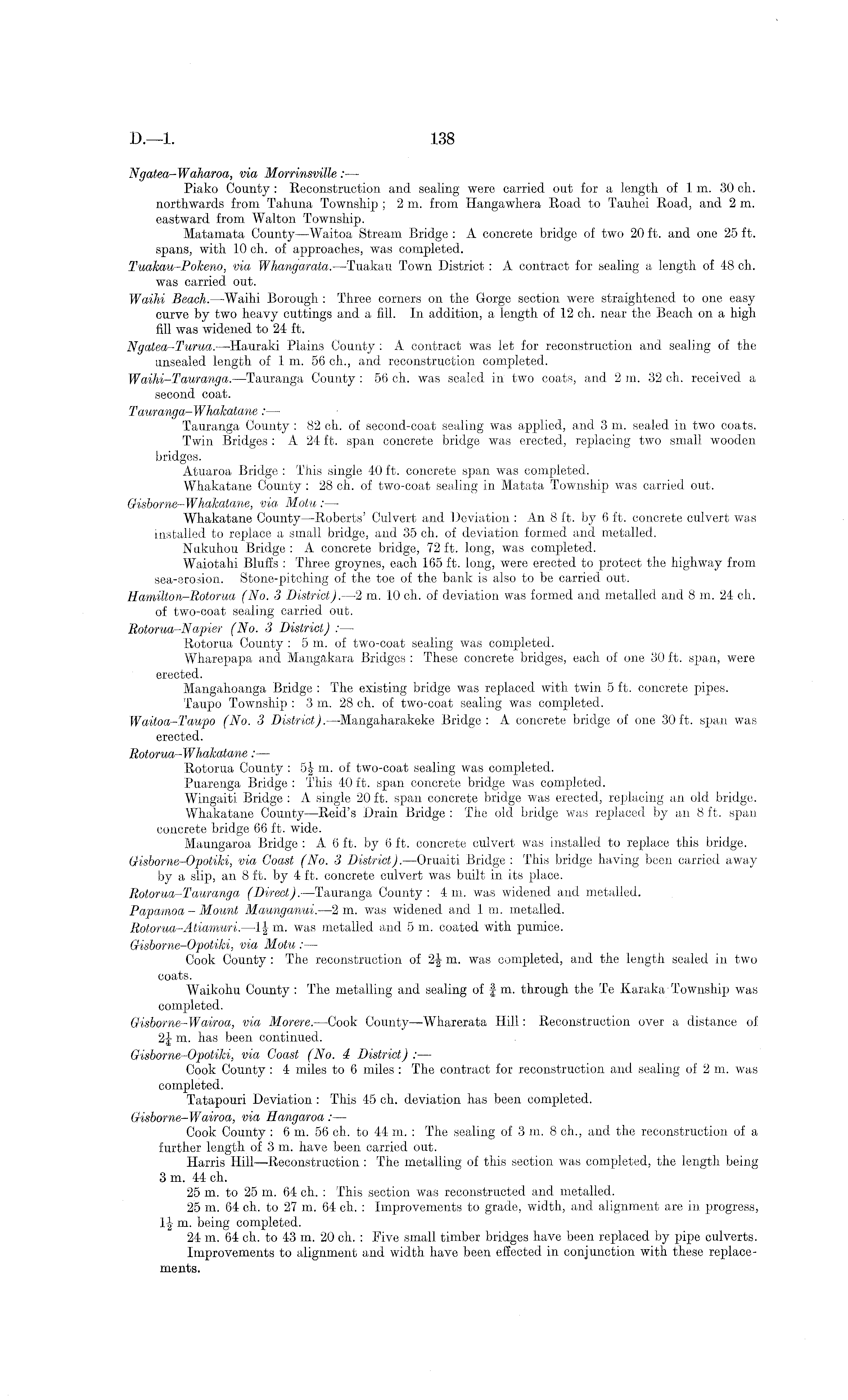 Ngatea-Waharoa, via Morrinsville : — Piako County : Reconstruction and sealing were carried out lor a length of Im. 30 ch. northwards from Tahuna Township ; 2m. from Hangawliera Road to Tauhei Road, and 2m. eastward from Walton Township. Matamata County —Waitoa Stream Bridge : A concrete bridge of two 20 ft. and one 25 ft. spans, with 10 ch. of approaches, was completed. Tuakau-Pokeno, via Whangarata.—Tuakau Town District. : A contract for sealing a length of 48 ch. was carried out. Waihi Beach. —Waihi Borough : Three corners on the Gorge section were straightened to one easy curve by two heavy cuttings and a fill. In addition, a length of 12 ch. near the Beach on a high fill was widened to 24 ft. Ngatea-Turua. —-Hauraki Plains County : A contract was let for reconstruction and sealing of the unsealed length of 1 m. 56 ch., and reconstruction completed. Waihi-Tauranga.—Tauranga County : 56 ch. was sealed in two coats, and 2m. 32 ch. received a second coat. Tauranga-Whakatane : — Tauranga County : 82 ch. of second-coat sealing was applied, and 3m. sealed in two coats. Twin Bridges : A 24 ft. span concrete bridge was erected, replacing two small wooden bridges. Atuaroa Bridge : This single 40 ft. concrete span was completed. Whakatane County : 28 ch. of two-coat sealing in Matata Township was carried out. Gisborne-Whakatane, via Motu : — Whakatane County —Roberts' Culvert and Deviation : An 8 ft. by 6 ft. concrete culvert was installed to replace a small bridge, and 35 ch. of deviation formed and metalled. Nukuhou Bridge : A concrete bridge, 72 ft. long, was completed. Waiotahi Bluffs : Three groynes, each 165 ft. long, were erected to protect the highway from sea-erosion. Stone-pitching of the toe of the bank is also to be carried out. Hamilton-Rotorua (No. 3 District). —2 m. 10 ch. of deviation was formed and metalled and Bm. 24 ch. of two-coat sealing carried out. Rotorua-Napier (No. 3 District) :— Rotorua County : sm. of two-coat sealing was completed. Wharepapa and Mangākara Bridges : These concrete bridges, each of one 30 ft. span, were erected. Mangahoanga Bridge : The existing bridge was replaced with twin 5 ft. concrete pipes. Taupo Township : 3m. 28 ch. of two-coat sealing was completed. Waitoa-Taupo (No. 3 District). —-Mangaharakeke Bridge: A concrete bridge of one 30ft. span was erected. Rotorua-Whakatane: — Rotorua County : 5J- in. of two-coat sealing was completed. Puarenga Bridge : This 40 ft. span concrete bridge was completed. Wingaiti Bridge : A single 20 ft. span concrete bridge was erected, replacing an old bridge. Whakatane County —Reid's Drain Bridge : The old bridge was replaced by an 8 ft. span concrete bridge 66 ft. wide. Maungaroa Bridge : A 6 ft. by 6 ft. concrete culvert was installed to replace this bridge. Qisborne-Opotiki, via Ooast (No. 3 District). —Oruaiti Bridge : This bridge having been carried away by a slip, an 8 ft. by 4 ft. concrete culvert was built in its place. Rotorua-Tauranga (Direct). —Tauranga County: 4m. was widened and metalled. Papamoa - Mount Maunganui. —2 m. was widened and Im. metalled. Rotorua-Atiamuri. —1| m. was metalled and 5 m. coated with pumice. Gisborne-Opotiki, via Motu : — Cook County : The reconstruction of 2| m. was completed, and the length sealed in two coats. Waikohu County : The metalling and sealing of fm. through the Te Karaka Township was completed. Gisborne-Wairoa, via Morere.—Cook County—Wharerata Hill: Reconstruction over a distance of 2J m. has been continued. Gisborne-Opotiki, via Coast (No. 4 District) : — Cook County : 4 miles to 6 miles : The contract for reconstruction and sealing of 2m. was completed. Tatapouri Deviation : This 45 ch. deviation has been completed. Gisborne-Wairoa, via Hangaroa : —• Cook County : 6m. 56 ch. to 44 m. : The sealing of 3m. 8 ch., and the reconstruction of a further length of 3 m. have been carried out. Harris Hill—Reconstruction : The metalling of this section was completed, the length being 3 m. 44 ch. 25 m. to 25 m. 64 ch. : This section was reconstructed and metalled. 25 m. 64 ch. to 27 m. 64 ch. : Improvements to grade, width, and alignment are in progress, 1| m. being completed. 24 m. 64 ch. to 43 m. 20 ch. : Five small timber bridges have been replaced by pipe culverts. Improvements to alignment and width have been effected in conjunction with these replacements.