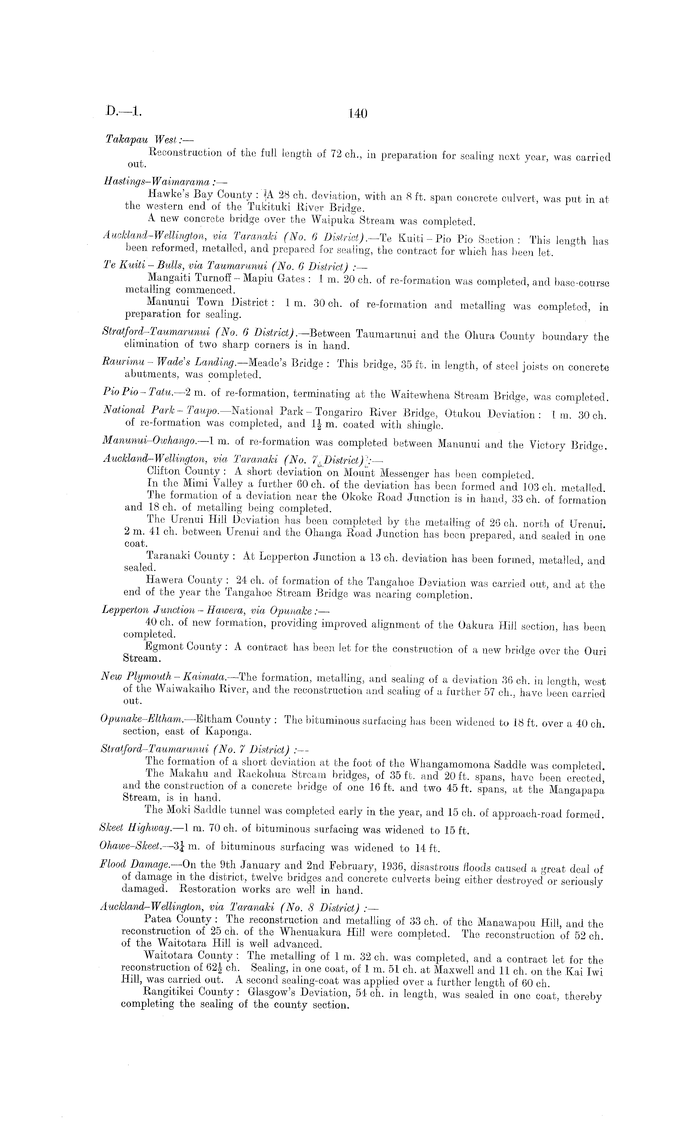 Takapau West:— Reconstruction of the full length of 72 ch., in preparation for sealing next year, was carried out. Hastings-Waimarama:— Hawke s Bay County : 28 ch. deviation, with an 8 ft. span concrete culvert, was put in at the western end of the Tukituki River Bridge. A new concrete bridge over the Waipuka Stream was completed. Auckland-Wellington, via Taranaki (No. 6 District).—Te Kuiti - Pio Pio Section: This length has been reformed, metalled, and prepared for sealing, the contract for which has been let. Te Kuiti - Bulls, via Taumarunui (No. 6 District) :— Mangaiti Turnoff - Mapiu Gates : 1 m. 20 oh. of re-formation was completed, and base-course metalling commenced. Manunui Town District : Im. 30 ch. of re-formation and metalling was completed in preparation for sealing. Stratford-Taumarunui (No. 6 District) .—Between Taumarunui and the Ohura County boundary the elimination of two sharp corners is in hand. Raurimu - Wade's Landing.—Meade's Bridge : This bridge, 35 ft. in length, of steel joists on concrete abutments, was completed. PioPio-Tatu.—2 m. of re-formation, terminating at the Waitewhena Stream Bridge, was completed. National Park-Taupo.—National Park-Tongariro River Bridge, Otukou Deviation: Im. 30 ch. of re-formation was completed, and 1J m. coated with shingle. Manunui-Owhango. Im. of re-formation was completed between Manunui and the Victory Bridge. Auckland-Wellington, via Taranaki (No. 7district) 1 :— Clifton County : A short deviation on Mount Messenger has been completed. In the Minn Valley a further 60 ch. of the deviation has been formed and 103 ch. metalled. The formation of a deviation near the Okoke Road Junction is in hand, 33 ch. of formation and 18 ch. of metalling being completed. The Crenui Hill Deviation has been completed by the metalling of 26 ch. north of Urenui. 2 ni. 41 ch. between Urenui and the Ohanga Road Junction has been prepared, and sealed in one coat. Taranaki County . At Lepperton Junction a 13 oh. deviation has been formed, metalled and sealed. Hawera County : 24 ch. of formation of the Tangahoe Deviation was carried out, and at the end of the year the Tangahoe Stream Bridge was nearing completion. Lepperton Junction - Hawera, via Opunake :— 40 ch. of new formation, providing improved alignment of the Oakura Hill section, has been completed. Egmont County . A contract has been let for the construction of a new bridge over the Ouri Stream. New Plymouth- Kaimata.—The formation, metalling, and sealing of a deviation 36 ch. in length, west of the Waiwakaiho River, and the reconstruction and sealing of a further 57 ch., have been carried out. Opunake-Eltharn.—Eltham County : The bituminous surfacing has been widened to 18 ft. over a 40 ch. section, east of Kaponga. Stratford-Taumarunui (No. 7 District) :— The formation of a short deviation at the foot of the Whangamomona Saddle was completed. The Makahu and Raekohua Stream bridges, of 35 ft. and 20 ft. spans, have been erected" and the construction of a concrete bridge of one 16 ft, and two 45 ft, spans, at the Mangapapa Stream, is in hand. The Moki Saddle tunnel was completed early in the year, and 15 ch. of approach-road formed. Skeet Highway.—l m. 70 ch. of bituminous surfacing was widened to 15 ft. Oliawe-Skeet. —3£ m. of bituminous surfacing was widened to 14 ft. Flood Damage.—On the 9th January and 2nd February, 1936, disastrous floods caused a great deal of of damage in the district, twelve bridges and concrete culverts being either destroyed or seriously damaged. Restoration works are well in hand. Auckland-Wellington, via Taranaki (No. 8 District) : — Patea County : The reconstruction and metalling of 33 ch. of the Manawapou Hill, and the reconstruction of 25 ch. of the Whenuakura Hill were completed. The reconstruction of 52 ch. of the Waitotara Hill is well advanced. Waitotara County : The metalling of Im. 32 ch. was completed, and a contract let for the reconstruction of 62-| ch. Sealing, in one coat, of Im. 51 ch. at Maxwell and 11 ch. on the Kai Iwi Hill, was carried out. A second sealing-coat was applied over a further length of 60 ch. Rangitikei County : Glasgow's Deviation, 54 ch. in length, was sealed in one coat, thereby completing the sealing of the county section.