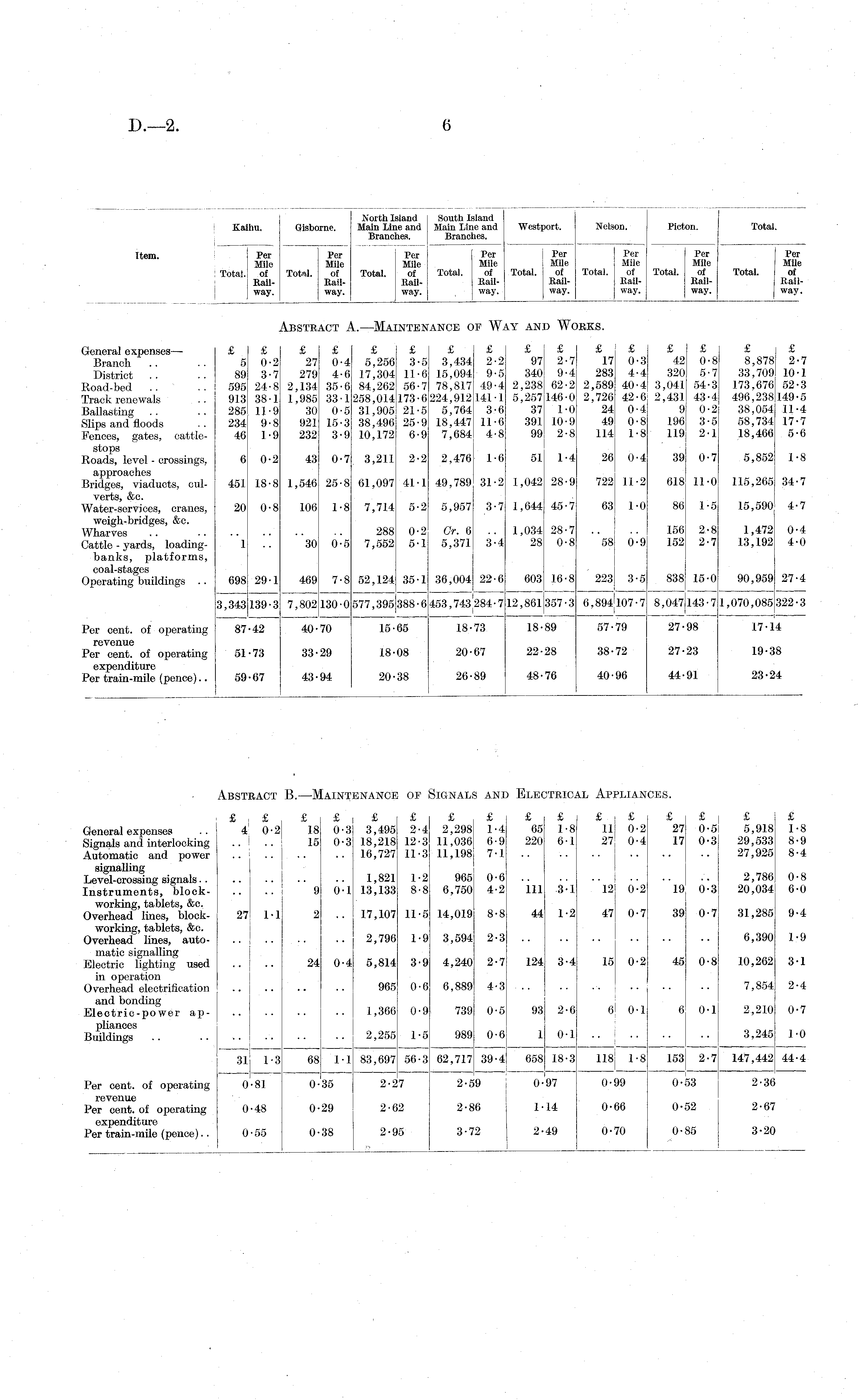 North Island South Island Kaihu. Gisborne. Main Line and Main Line and Westport. Nelson. Picton. Total. Branches. Branches. Item. I Per Per Per Per I Per j Per Per Per Mile Mile Mile Mile Mile : Mile Mile Mile TotalJ of Total. of Total. of Total. of Total. | of Total. I of Total. of Total. of Rail- Rail- Rail- Rail- ! Rail- j Rail- Rail- Railj way. way. way. way. way. j way. way, way. Abstract A. —Maintenance of Way and Works. General expenses — £ £ £ £ £ £ £ £ £j£ ££ ££ £ £ Branch .. .. 5 0-2 27 0-4 5,256 3-5 3,434 2-2 97j 2-7 17 0-3 42 0-8 8,878 2-7 District .. .. 89 3-7 279 4-6 17,304 11-6 15,094 9-5 340 9-4 283 4-4 320 5-7 33,709 10-1 Road-bed .. .. 595 24-8 2,134 35-6 84,262 56-7 78,817 49-4 2,238 62-2 2,589 40-4 3,041 54-3 173,676 52-3 Track renewals .. 913 38-1 1,985 33-1258,014173-6224,912 141 ■ 1 5,257146-0 2,726 42-6 2,431 43-4 496,238149-5 Ballasting .. .. 285 11-9 30 0-5 31,905 21-5 5,764 3-6 37 1-0 24 0-4 9 0-2 38,054 11-4 Slips and floods . . 234 9-8 921 15-3 38,496 25-9 18,447 11-6 391 10-9 49 0-8 196 3-5 58,734 17-7 Fences, gates, cattle- 46 1-9 232 3-9 10,172 6-9 7,684 4-8 99 2-8 114 1-8 119 2-1 18,466 5-6 Roads, level - crossings, 6 0-2 43 0-7 3,211 2-2 2,476 1-6 51 1-4 26 0-4 39 0-7 5,852 1-8 Q T)T)rOQ p HPS Bridges, viaducts, cul- 451 18-8 1,546 25-8 61,097 41-1 49,789 31-2 1,042 28-9 722 11-2 618 11-0 115,265 34-7 verts, &c. Water-services, cranes, 20 0-8 106 1-8 7,714 5-2 5,957 3-7 1,644 45-7 63 1-0 86 1-5 15,590 4-7 weigh-bridges, &c. Wharves .. 288 0-2 Or. 6 .. 1,034 28-7 .. .. 156 2-8 1,472 0-4 Cattle - yards, loading- 1 .. 30 0-5 7,552 5-1 5,371 3-4 28 0-8 58 0-9 152 2-7 13,192 4-0 banks, platforms, Operating S buildings .. 698 29-1 469 7-8 52,124 35-1 36,004 22-6 603 16-8 223 3-5 838 15-0 90,959 27-4 3,343 139 • 3 7,802 130 • 0 577,395 388 • 6 453,743 • 7 12,861 357 ■ 3 6,894| 107 • 7 8,047 143 • 7 1,070,085 322 • 3 Per cent, of operating 87*42 40 '70 15-65 18-73 18-89 57-79 27-98 17-14 revenue Per cent, of operating 51-73 33-29 18-08 20*67 22-28 38-72 27*23 19*38 expenditure Per train-mile (pence).. 59*67 43*94 20*38 26*89 48*76 40*96 44*91 23*24 Abstract B. —Maintenance of Signals and Electrical Appliances. £ £ £ £ ' £ £ £ £ £ £ £ , £ £ £ J £ £ General expenses .. 4 0*2' 18 0*3 3,495 2*4 2,2981 1*4 65 1*8 11 0*2 27 0*5i 5,918 1*8 Signals and interlocking .. .. 15 0*3 18,218 12*3 11,036| 6-9 220 6-1 27 0*4 17 0'3 29,533 8*9 Automatic and power .. .. .. .. 16,727 11*3 11,198! 7*1 .. .. .. j .. .. .. 27,925 8*4 signalling Level-crossing signals. . .. .. | •• •• 1,821 1*2 965 0*6 .. .. .. .. .. .. 2,786 0*8 Instruments, block- .. .. 9 0*1 13,133 8*8 6,750 4*2 111 3*1 12 0*2 19 0*3 20,034 6*0 working, tablets, &c. Overhead lines, block- 27 1*1 2 .. 17,107 11*5 14,019 8*8 44 1-2 47 0-7 39 0*7 31,285 9*4 working, tablets, &c. Overhead lines, auto- .. .. •. •• 2,796 1*9 3,594 2*3 .. .. .. .. .. .. 6,390 1*9 matic signalling Electric lighting used .. .. 24 0*4 5,814 3*9 4,240 2*7 124 3*4 15 0*2 45 0*8 10,262 3*1 in operation Overhead electrification .. .. .. .. 965 0*6 6,889 4-3 .. .. .. .. •• .. 7,854 2*4 and bonding Electric-power ap- .. . . •• •• 1,366 0*9 739 0*5 93 2*6 6 0-1 6 0*1 2,210 0*7 pliances Buildings .. 2,255 1-5 989 0*6 1 0*1 3,245 1-0 31 1-3 68 1-1 83,697 56-3 62,717 39*4 658 18*3 118, 1*8 153 2*7 147,442 44*4 Per cent, of operating 0*81 0*35 2-27 2-59 0-97 0*99 0*53 2*36 revenue Per cent, of operating 0 • 48 0*29 2 • 62 2 * 86 1*14 0 • 66 0 • 52 2 • 67 expenditure Per train-mile (pence).. 0*55 0*38 2*95 3*72 2*49 0*70 0*85 3*20