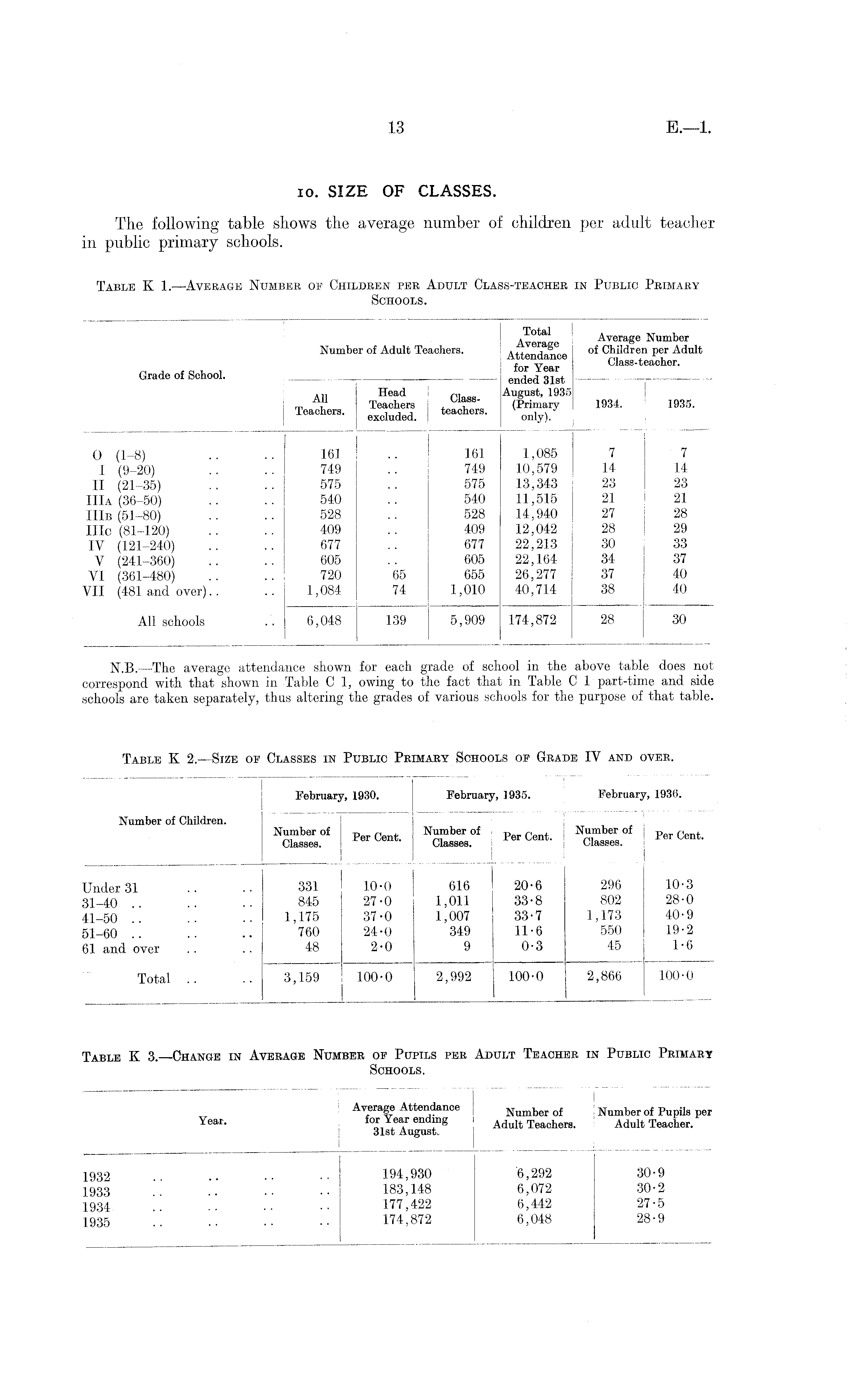 AveraL Avera^e Number Number of Adult Teachers. Attend nee of children P er Adult for Year Class-teacher. Grade of School. , ended 31st ... Head i ™ August, 1935 Teachers Teachera I teachers (M™«y I 034 - * 935 - leacnera. excluded . | teacners. on j y)> 0 (1-8) .. .. 161 .. 161 1,085 7 7 I (9-20) .. .. 749 .. 749 10,579 14 14 II (21-35) .. .. 575 .. 575 13,343 23 23 IIIa (36-50) .. .. 540 .. 540 11,515 21 21 IIIb (51-80) .. .. 528 .. 528 14,940 27 28 IIIc (81-120) .. .. 409 .. 409 12,042 28 29 IV (121-240) .. .. 677 .. 677 22,213 30 33 V (241-360) .. .. 605 .. 605 22,164 34 37 VI (361-480) .. .. 720 65 655 26,277 37 40 VII (481 and over).. .. 1,084 74 1,010 40,714 38 40 All schools .. 6,048 139 5,909 174,872 28 30