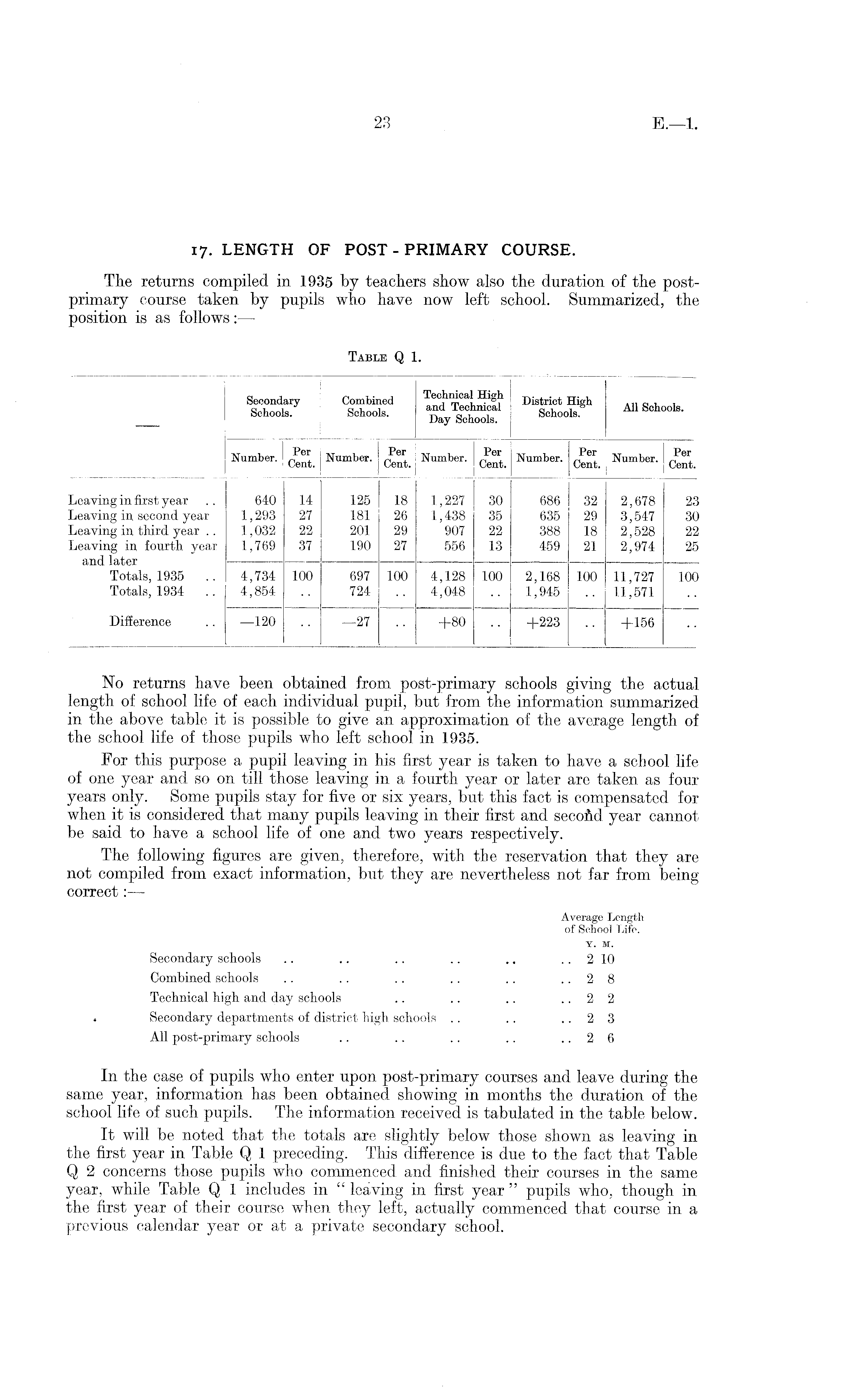 17. LENGTH OF POST - PRIMARY COURSE. The returns compiled in 1935 by teachers show also the duration of the postprimary course taken by pupils who have now left school. Summarized, the position is as follows: —