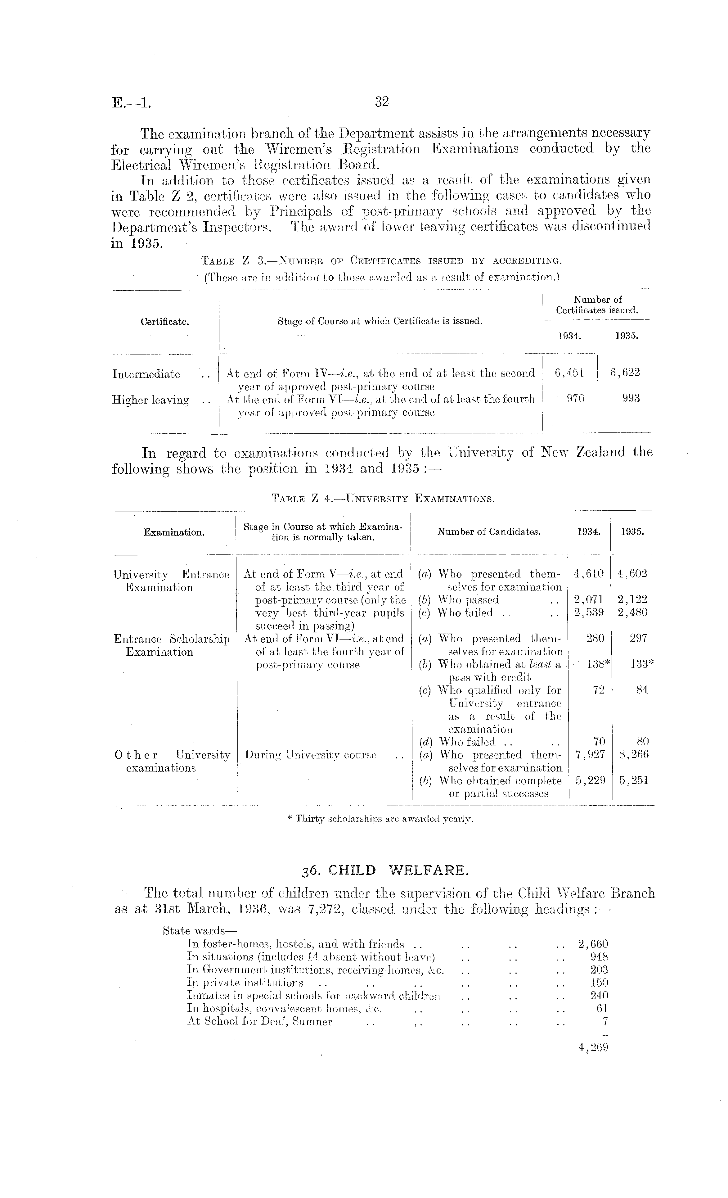 The examination branch of the Department assists in the arrangements necessary for carrying out the Wiremen's Registration Examinations conducted by the Electrical Wiremen's Registration Board. In addition to those certificates issued as a result of the examinations given in Table Z 2, certificates were also issued in the following cases to candidates who were recommended by Principals of post-primary schools and approved by the Department's Inspectors. The award of lower leaving certificates was discontinued in 1935.