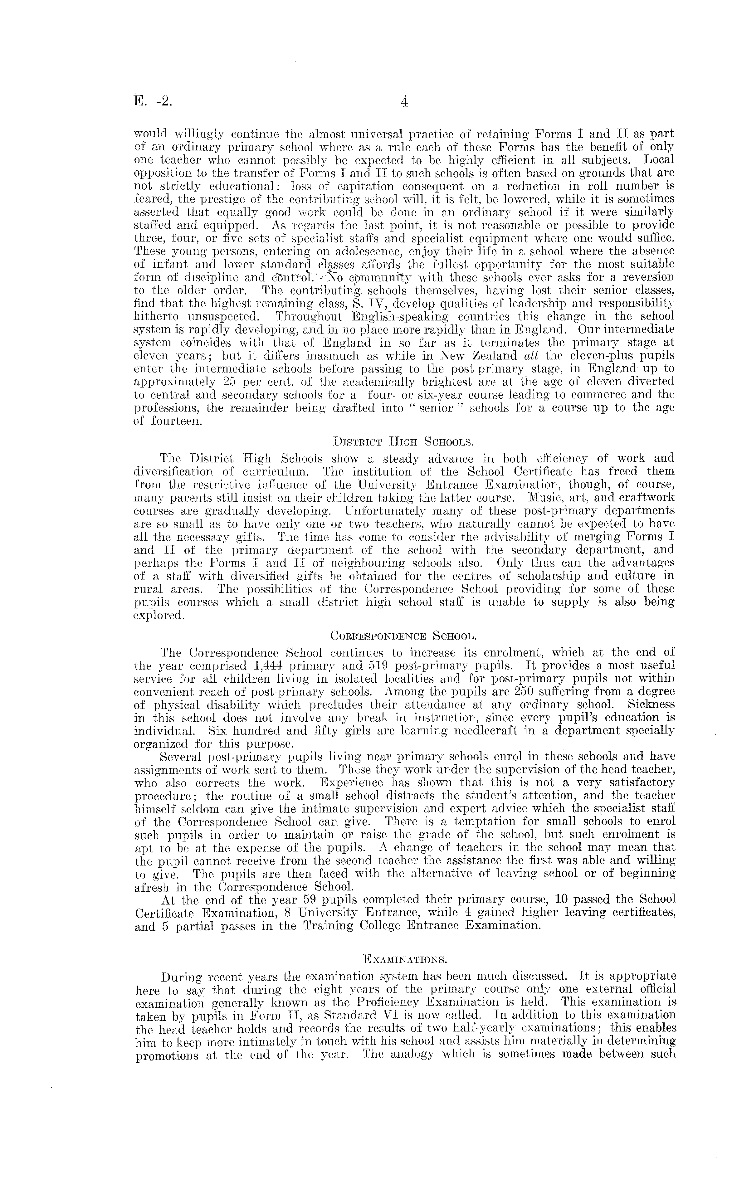 would willingly continue the almost universal practice of retaining Forms I and II as part of an ordinary primary school where as a rule each of these Forms has the benefit of only one teacher who cannot possibly be expected to be highly efficient in all subjects. Local opposition to the transfer of Forms I and II to such schools is often based on grounds that are not strictly educational: loss of capitation consequent on a reduction in roll number is feared, the prestige of the contributing school will, it is felt, be lowered, while it is sometimes asserted that equally good work could be done in an ordinary school if it were similarly staffed and equipped. As regards the last point, it is not reasonable or possible to provide three, four, or five sets of specialist staffs and specialist equipment where one would suffice. These young persons, entering on adolescence, enjoy their life in a school where the absence of infant and lower standard cesses affords the fullest opportunity for the most suitable form of discipline and control. ' No community with these schools ever asks for a reversion to the older order. The contributing, schools themselves, having lost their senior classes, find that the highest remaining class, S. IV, develop qualities of leadership and responsibility hitherto unsuspected. Throughout English-speaking countries this change in the school system is rapidly developing, and in no place more rapidly than in England. Our intermediate system coincides with that of England in so far as it terminates the primary stage at eleven years; but it differs inasmuch as while in New Zealand all the eleven-plus pupils enter the intermediate schools before passing to the post-primary stage, in England up to approximately 25 per cent, of the academically brightest are at the age of eleven diverted to central and secondary schools for a four- or six-year course leading to commerce and the professions, the remainder being drafted into " senior " schools for a course up to the age of fourteen. District High Schools. The District High Schools show a steady advance in both efficiency of work and diversification of curriculum. The institution of the School Certificate has freed them from the restrictive influence of the University Entrance Examination, though, of course, many parents still insist on their children taking the latter course. Music, art, and craftwork courses are gradually developing. Unfortunately many of these post-primary departments are so small as to have only one or two teachers, who naturally cannot be expected to have all the necessary gifts. The time has come to consider the advisability of merging Forms I and II of the primary department of the school with the secondary department, and perhaps the Forms I and II of neighbouring schools also. Only thus can the advantages of a staff with diversified gifts be obtained for the centres of scholarship and culture in rural areas. The possibilities of the Correspondence School providing for some of these pupils courses which a small district high school staff is unable to supply is also being explored. Correspondence School. The Correspondence School continues to increase its enrolment, which at the end of the year comprised 1,444 primary and 519 post-primary pupils. It provides a most useful service for all children living in isolated localities and for post-primary pupils not within convenient reach of post-primary schools. Among the pupils are 250 suffering from a degree of physical disability which precludes their attendance at any ordinary school. Sickness in this school does not involve any break in instruction, since every pupil's education is individual. Six hundred and fifty girls are learning needlecraft in a department specially organized for this purpose. Several post-primary pupils living near primary schools enrol in these schools and have assignments of work sent to them. These they work under the supervision of the head teacher, who also corrects the work. Experience has shown that this is not a very satisfactory procedure; the routine of a small school distracts the student's attention, and the teacher himself seldom can give the intimate supervision and expert advice which the specialist staff of the Correspondence School can give. There is a temptation for small schools to enrol such pupils in order to maintain or raise the grade of the school, but such enrolment is apt to be at the expense of the pupils. A change of teachers in the school may mean that the pupil cannot receive from the second teacher the assistance the first was able and willing to give. The pupils are then faced with the alternative of leaving school or of beginning afresh in the Correspondence School. At the end of the year 59 pupils completed their primary course, 10 passed the School Certificate Examination, 8 University Entrance, while 4 gained higher leaving certificates, and 5 partial passes in the Training College Entrance Examination. Examinations. During recent years the examination system has been much discussed. It is appropriate here to say that during the eight years of the primary course only one external official examination generally known as the Proficiency Examination is held. This examination is taken by pupils in Form 11, as Standard VI is now called. In addition to this examination the head teacher holds and records the results of two half-yearly examinations; this enables him to keep more intimately in touch with his school and assists him materially in determiningpromotions at the end of the year. The analogy which is sometimes made between such